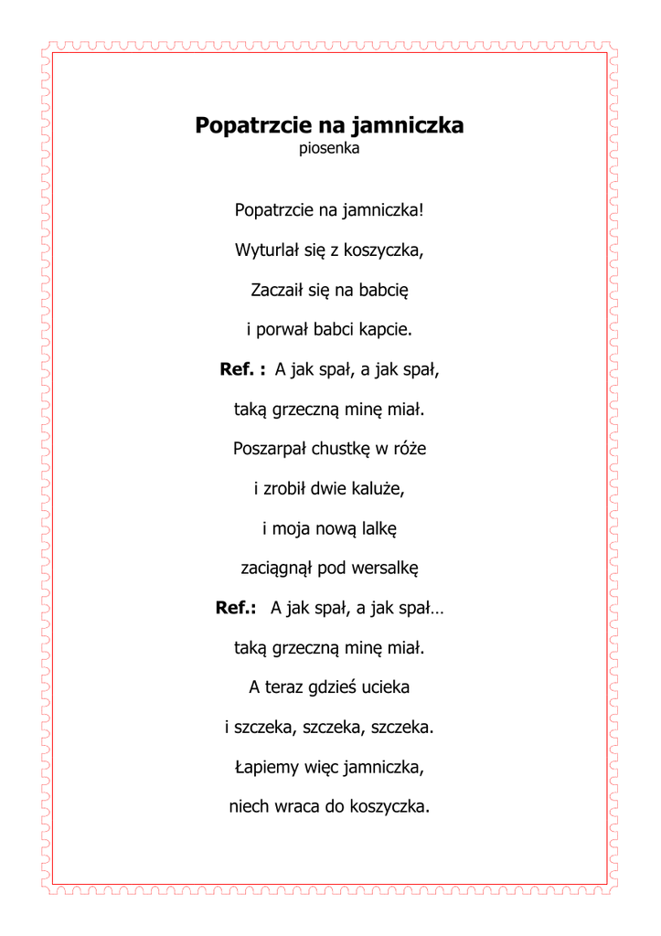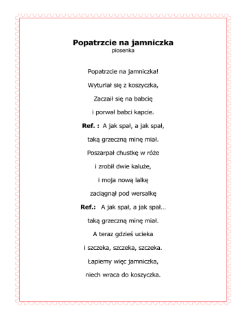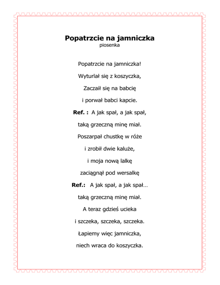 Popatrzcie na jamniczka piosenka Popatrzcie na jamniczka! Wyturlał się z koszyczka, Zaczaił się na babcię i porwał babci kapcie. Ref. : A jak spał, a jak spał, taką grzeczną minę miał. Poszarpał chustkę w róże i zrobił dwie kaluże, i moja nową lalkę zaciągnął pod wersalkę Ref.: A jak spał, a jak spał… taką grzeczną minę miał. A teraz gdzieś ucieka i szczeka, szczeka, szczeka. Łapiemy więc jamniczka, niech wraca do koszyczka. Ref.: Bo jak spał, bo jak spał, taką grzeczną minę miał. Pod stołem jest koszyczek, w koszyczku śpi jamniczek. Jamniczek sobie śpi, jak się zbudzi, będzie zły!