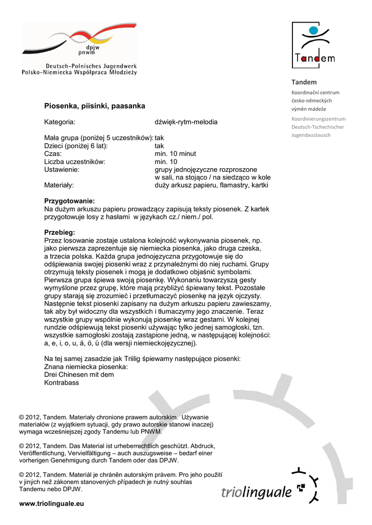 Tandem Koordinační centrum česko-německých výměn mádeže Piosenka, piisinki, paasanka Kategoria: dźwięk-rytm-melodia Mała grupa (poniżej 5 uczestników): tak Dzieci (poniżej 6 lat): tak Czas: min. 10 minut Liczba uczestników: min. 10 Ustawienie: grupy jednojęzyczne rozproszone w sali, na stojąco / na siedząco w kole Materiały: duży arkusz papieru, flamastry, kartki Przygotowanie: Na dużym arkuszu papieru prowadzący zapisują teksty piosenek. Z kartek przygotowuje losy z hasłami w językach cz./ niem./ pol. Przebieg: Przez losowanie zostaje ustalona kolejność wykonywania piosenek, np. jako pierwsza zaprezentuje się niemiecka piosenka, jako druga czeska, a trzecia polska. Każda grupa jednojęzyczna przygotowuje się do odśpiewania swojej piosenki wraz z przynależnymi do niej ruchami. Grupy otrzymują teksty piosenek i mogą je dodatkowo objaśnić symbolami. Pierwsza grupa śpiewa swoją piosenkę. Wykonaniu towarzyszą gesty wymyślone przez grupę, które mają przybliżyć śpiewany tekst. Pozostałe grupy starają się zrozumieć i przetłumaczyć piosenkę na język ojczysty. Następnie tekst piosenki zapisany na dużym arkuszu papieru zawieszamy, tak aby był widoczny dla wszystkich i tłumaczymy jego znaczenie. Teraz wszystkie grupy wspólnie wykonują piosenkę wraz gestami. W kolejnej rundzie odśpiewują tekst piosenki używając tylko jednej samogłoski, tzn. wszystkie samogłoski zostają zastąpione jedną, w następującej kolejności: a, e, i, o, u, ä, ö, ü (dla wersji niemieckojęzycznej). Na tej samej zasadzie jak Triilig śpiewamy następujące piosenki: Znana niemiecka piosenka: Drei Chinesen mit dem Kontrabass © 2012, Tandem. Materiały chronione prawem autorskim. Używanie materiałów (z wyjątkiem sytuacji, gdy prawo autorskie stanowi inaczej) wymaga wcześniejszej zgody Tandemu lub PNWM. © 2012, Tandem. Das Material ist urheberrechtlich geschützt. Abdruck, Veröffentlichung, Vervielfältigung – auch auszugsweise – bedarf einer vorherigen Genehmigung durch Tandem oder das DPJW. © 2012, Tandem. Materiál je chráněn autorským právem. Pro jeho použití v jiných než zákonem stanovených případech je nutný souhlas Tandemu nebo DPJW. www.triolinguale.eu Koordinierungszentrum Deutsch-Tschechischer Jugendaustausch Strona 2 sitzen auf der Straße und erzählen sich was. Da kommt die Polizei „Ja, was ist den das?„ Drei Chinesen mit dem Kontrabass. (w wersji z „e“ Dre Chenesen met dem Kentrebess setzen ef der Streße end erzehlen sech wes ... ) Znana czeska piosenka: Holka modrooká, nesedávej u potoka, Holka modrooká, nesedávej tam. V potoce se voda točí, podemele tvoje oči, Holka modrooká, nesedávej tam. (w wersji z „o” Holko modrooko, nosodovoj o potoko, Holko modrooko, nosodovoj tom ... ) Znana polska piosenka: Tańczymy labada, labada, labada, Tańczymy labada, małego walczyka, Tańczą go starszaki, starszaki, starszaki, Tańczą go starszaki i małe dzieci też. (w wersji z „u”: Tuńczumu lubudu, lubudu, lubudu, Tuńczumu lubudu, muługu wulczuku ...) Uwagi: Grupy jednocześnie przygotowują się do odśpiewania swoich piosenek. Jednak, żeby utrzymać napięcie w grupie możemy najpierw wykonać tylko jedną piosenkę, a pozostałe przenieść w inne miejsce w programie. Warianty: Zasadę wymiany samogłosek można zastosować także w innych zabawach, nie tylko tych ze śpiewaniem, np. w Trialog alias Trilig.