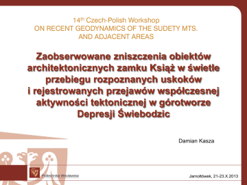 14th Czech-Polish Workshop ON RECENT GEODYNAMICS OF THE SUDETY MTS. AND ADJACENT AREAS Zaobserwowane zniszczenia obiektów architektonicznych zamku Książ w świetle przebiegu rozpoznanych uskoków i rejestrowanych przejawów współczesnej aktywności tektonicznej w górotworze Depresji Świebodzic Damian Kasza Jarnołtówek, 21-23.X.2013 Prezentacja obiektu Książ Widok zamku Książ (opracowanie własne na podst. oczydolnegoslaska.pl) Geologia regionu Mapa geologiczna obszaru Depresji Świebodzic (opracowanie własne na podst. Kaczorowski, 2011) Geologia regionu Mapa geologiczna obszaru Depresji Świebodzic (opracowanie własne na podst. Teisseyre i Gawroński, 1965) Przejawy współczesnej aktywności tektonicznej w zapisach instrumentarium LG Wykresy zmian położeń równowagi wahadeł H74 i H75 (Kaczorowski, 2010) Przejawy współczesnej aktywności tektonicznej w zapisach instrumentarium LG Zapis silnych sygnałów niepływowych przez klinometry hydrostatyczne (Kaczorowski i Wojewoda, 2011) Wizualizacja 3D rejonu badań Przebieg powierzchni dyslokacji w rejonie Książa (opracowanie własne na podst. Kaczorowski i Wojewoda, 2011) Schemat pracy Ogląd i inwentaryzacja podziemnych korytarzy pod kątem widocznych linii spękań oraz uskoków Stabilizacja punktów geodezyjnej osnowy pomiarowej Pomiar uskoków z wykorzystaniem Total Station Opracowanie i interpretacja wyników Budowa modelu 3D przebiegu uskoków Schemat prac związanych z identyfikacją uskoków w podziemnych korytarzach Laboratorium Geodynamicznego (opracowanie własne) Wyniki pomiarów Model 3D uskoków widocznych wewnątrz górotworu (opracowanie własne) Ekstrapolacja rezultatów Widok ekstrapolacji przebiegu uskoków tektonicznych (opracowanie własne) Związek między przebiegiem uskoków a widocznymi zniszczeniami obiektów architektonicznych? Przykłady zaobserwowanych zniszczeń kompleksu zamkowego (opracowanie własne) Związek między przebiegiem uskoków a widocznymi zniszczeniami obiektów architektonicznych? (cd.) Aktualizacja mapy geologicznej rejonu zamku Książ (opracowanie własne) Podsumowanie Model 3D uskoków widocznych wewnątrz górotworu (opracowanie własne) Dziękuję za uwagę 14th Czech-Polish Workshop ON RECENT GEODYNAMICS OF THE SUDETY MTS. AND ADJACENT AREAS Zaobserwowane zniszczenia obiektów architektonicznych zamku Książ w świetle przebiegu rozpoznanych uskoków i rejestrowanych przejawów współczesnej aktywności tektonicznej w górotworze Depresji Świebodzic Jarnołtówek, 21-23.X.2013