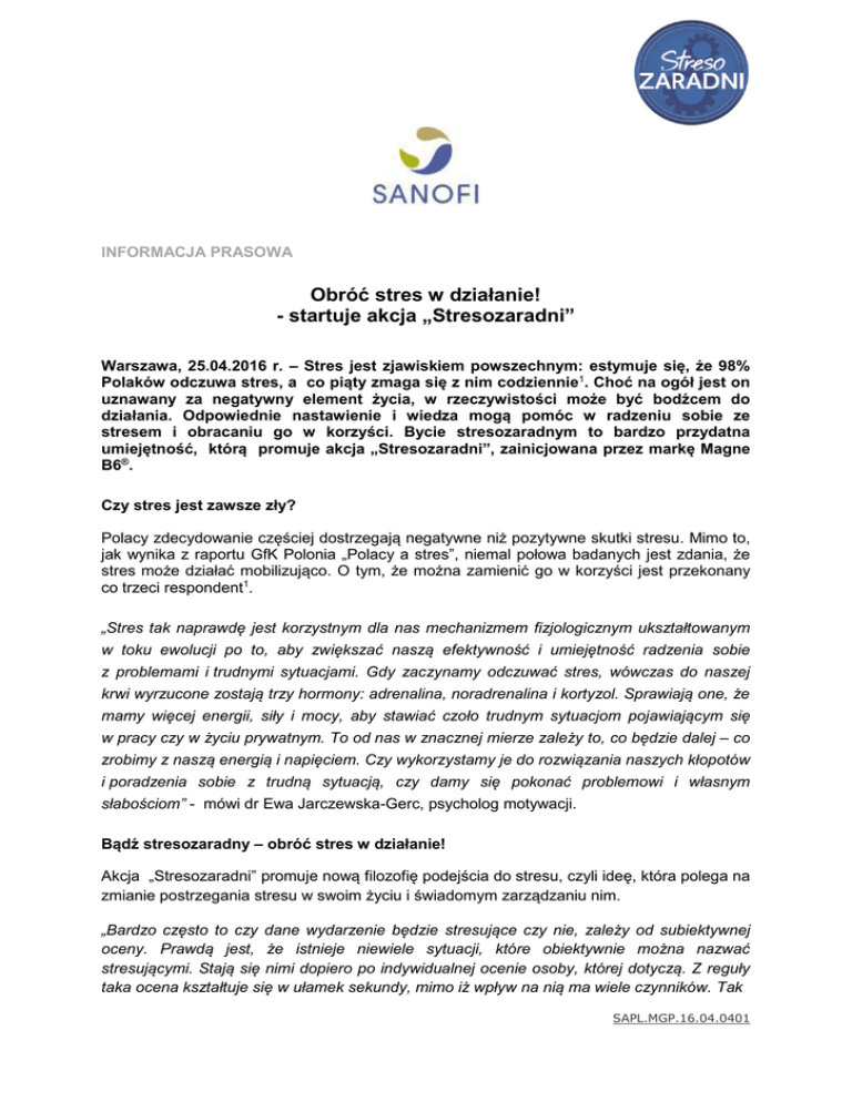 Raport z badania ilościowego „Polacy a stres” opublikowany na stronie GfK Polonia 20 kwietnia 2016 r. Cele