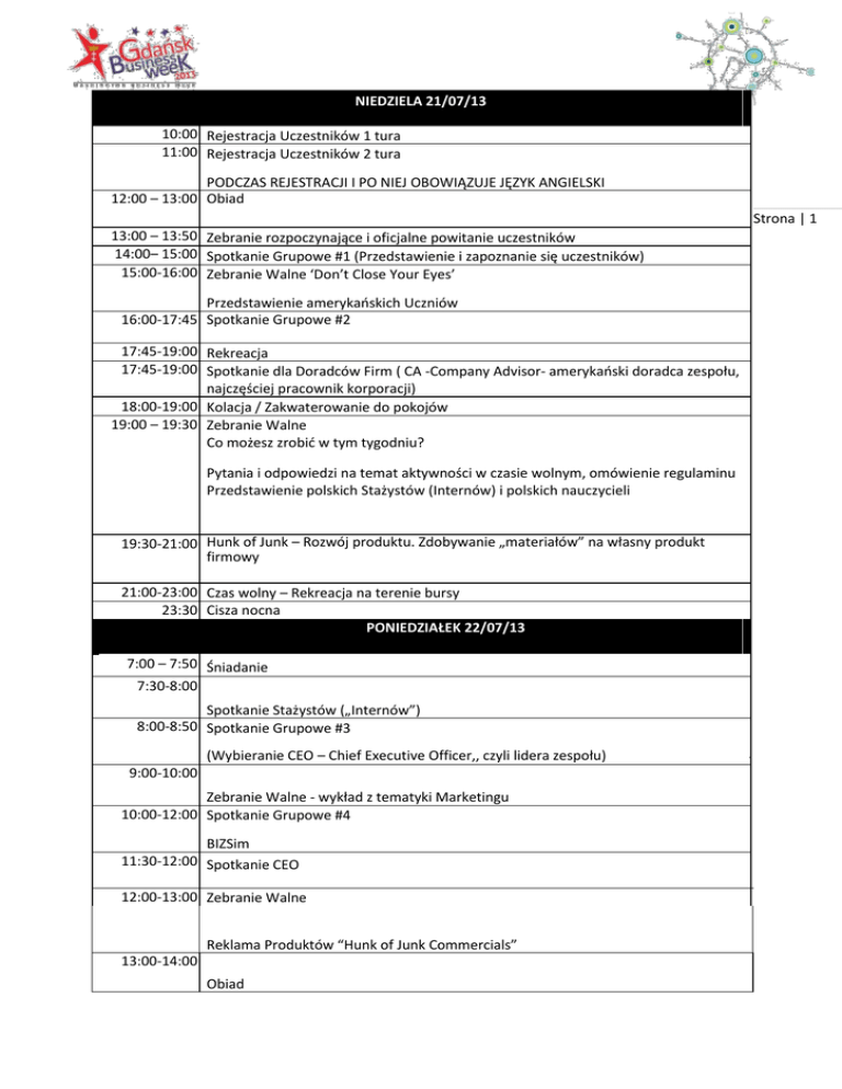 NIEDZIELA 21/07/13 10:00 Rejestracja Uczestników 1 tura 11:00 Rejestracja Uczestników 2 tura PODCZAS REJESTRACJI I PO NIEJ OBOWIĄZUJE JĘZYK ANGIELSKI 12:00 – 13:00 Obiad Strona | 1 13:00 – 13:50 Zebranie rozpoczynające i oficjalne powitanie uczestników 14:00– 15:00 Spotkanie Grupowe #1 (Przedstawienie i zapoznanie się uczestników) 15:00-16:00 Zebranie Walne ‘Don’t Close Your Eyes’ Przedstawienie amerykańskich Uczniów 16:00-17:45 Spotkanie Grupowe #2 17:45-19:00 Rekreacja 17:45-19:00 Spotkanie dla Doradców Firm ( CA -Company Advisor- amerykański doradca zespołu, najczęściej pracownik korporacji) 18:00-19:00 Kolacja / Zakwaterowanie do pokojów 19:00 – 19:30 Zebranie Walne Co możesz zrobić w tym tygodniu? Pytania i odpowiedzi na temat aktywności w czasie wolnym, omówienie regulaminu Przedstawienie polskich Stażystów (Internów) i polskich nauczycieli 19:30-21:00 Hunk of Junk – Rozwój produktu. Zdobywanie „materiałów” na własny produkt firmowy 21:00-23:00 Czas wolny – Rekreacja na terenie bursy 23:30 Cisza nocna PONIEDZIAŁEK 22/07/13 7:00 – 7:50 Śniadanie 7:30-8:00 Spotkanie Stażystów („Internów”) 8:00-8:50 Spotkanie Grupowe #3 (Wybieranie CEO – Chief Executive Officer,, czyli lidera zespołu) 9:00-10:00 Zebranie Walne - wykład z tematyki Marketingu 10:00-12:00 Spotkanie Grupowe #4 BIZSim 11:30-12:00 Spotkanie CEO 12:00-13:00 Zebranie Walne Reklama Produktów “Hunk of Junk Commercials” 13:00-14:00 Obiad 14:00-15:00 Zebranie Walne Strona | 2 Burza mózgów 15:00-16:30 Spotkanie Grupowe #5 BizSim 16:30-17:30 Zebranie Walne – wykład dotyczący wartości biznesu 17:30-19:00 Czas wolny 19:00-20:00 Kolacja 20:00-21:00 Spotkanie Grupowe #6 oraz prezentacje „Pecha Kucha” 20:00-21:00 Spotkanie nauczycieli polskich 21:00-23:00 Czas wolny – na terenie Bursy 23:30 Cisza nocna WTOREK 23/07/12 7:00 – 7:50 Śniadanie 8:00 – 10:30 Spotkanie Grupowe #7/8 Biz Sim 10:15 Wyjazd 10:30 – 18:30 Dlaczego nowoczesne technologie są pasjonujące- wycieczka do Gdańskiego Parku Naukowo - Technologicznegoi Gdańskiego Inkubatora Przedsiębiorczości (wykłady, spotkania, zwiedzanie) 19:00-21:00 Spotkanie Grupowe #9/10 BizSim 21:00-23:00 Rekreacja 23:00 Cisza nocna ŚRODA 24/07/13 7:00 – 7:50 Śniadanie 8:00-9:00 Zebranie Walne Edukacja i Nowe Technologie 9:00-12:00 Spotkanie Grupowe #11 BizSim 12:00 – 13:00 Zebranie Walne Zdobywanie zatrudnienia 13:00 – 14:00 Obiad 14:00 – 16:00 Spotkanie Grupowe #12 Strona | 3 BizSim Zdjęcia pamiątkowe uczestników GBW 16:00 – 16:10 Przekąska 16:15 – 17:15 Mecz siatkówki CA’s vs. CEO’s 17:30 – 18:30 Business Week Olympics 19:00 – 20:00 Kolacja i przygotowanie do dyskoteki 20:00 – 22:30 Dyskoteka w szkole dla uczniów 23:00 Wszyscy uczestnicy obecni w swoich pokojach 23:30 Cisza nocna CZWARTEK 25/07/13 7:30 – 8:30 Śniadanie będzie podawane do 8:15 (Cieszcie się dodatkowym czasem na sen!) 8:30 – 10:50 Spotkanie Grupowe #13 i 14 11:00-12:00 Zebranie Walne Komunikacja 12:00-13:00 Zebranie Walne „Pecha Kucha” 13:00-14:00 Obiad 14:00-15:40 Spotkanie Grupowe #15 BIZSim 16:00-17:00 Zebranie Walne Być liderem – co to oznacza? 17:00-18:00 Rekreacja 18:00-19:00 Kolacja 19:00-20:00 Spotkanie Grupowe #16 BIZSim 20:00 – 21:30 Wieczór Talentów Podziel się z nami swoimi talentami! 21:30 – 22:00 Rekreacja, sprzątanie pokojów, pakowanie 23:00 Cisza nocna PIĄTEK 26/07/13 7:00 – 7:50 Śniadanie 7:30 – 7:55 Spotkanie Internów i CEOs 8:00 – 8:50 Spotkanie Grupowe #17 8:00 – 9:00 Spotkanie z Jury oraz prezentacje finalistów “Pecha Kucha” 9:15 – 10:30 Ocenianie prac uczestników przez Jury #1 - Stockholder Presentation 10:30 – 10:45 Przerwa, przygotowanie na Targi Przedsiębiorczości „Trade Show” 10:45 – 11:45 Ocenianie prac uczestników przez Jury #2 Targi Przedsiębiorczości „Trade Show” 12:00 – 13:00 Spotkanie Grupowe z Polskimi Nauczycielami – sprzątanie i podziękowania 13:00 – 14:00 Obiad dla uczniów 11:45-14:00 Obiad dla Jury i podsumowanie przebiegu Targów Przedsiębiorczości 14:00-15:30 Spotkanie Grupowe #18 15:30 – 16:30 Zebranie Walne Podsumowanie Gdansk Business Week 16:30-16:45 Przekąska 16:30-18:00 Przygotowanie do zakończenia 18:00-20:30 Ceremonia Zakończenia Ceremonii zakończenia w Dworze Artusa Obecni będą przedstawiciele Sponsorów, władze miasta Gdańsk, Rodzice Rozdanie nagród i bankiet – dla uczniów i gości 20:30 Wymeldowanie z pomieszczeń bursy Strona | 4