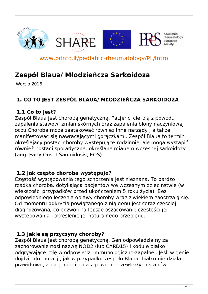 www.printo.it/pediatric-rheumatology/PL/intro Zespół Blaua/ Młodzieńcza Sarkoidoza Wersja 2016 1. CO TO JEST ZESPÓŁ BLAUA/ MŁODZIEŃCZA SARKOIDOZA 1.1 Co to jest? Zespół Blaua jest chorobą genetyczną. Pacjenci cierpią z powodu zapalenia stawów, zmian skórnych oraz zapalenia błony naczyniowej oczu.Choroba może zaatakować również inne narządy , a także manifestować się nawracającymi gorączkami. Zespół Blaua to termin określający postaci choroby występujące rodzinnie, ale mogą wystąpić również postaci sporadyczne, określane mianem wczesnej sarkoidozy (ang. Early Onset Sarcoidosis; EOS). 1.2 Jak często choroba występuje? Częstość występowania tego schorzenia jest nieznana. To bardzo rzadka choroba, dotykająca pacjentów we wczesnym dzieciństwie (w większości przypadków przed ukończeniem 5 roku życia). Bez odpowiedniego leczenia objawy choroby wraz z wiekiem zaostrzają się. Od momentu odkrycia powiązanego z nią genu jest coraz częściej diagnozowana, co pozwoli na lepsze oszacowanie częstości jej występowania i określenie jej naturalnego przebiegu. 1.3 Jakie są przyczyny choroby? Zespół Blaua jest chorobą genetyczną. Gen odpowiedzialny za zachorowanie nosi nazwę NOD2 (lub CARD15) i koduje białko odgrywające rolę w odpowiedzi immunologiczno-zapalnej. Jeśli w genie dojdzie do mutacji, jak w przypadku zespołu Blaua, białko nie działa prawidłowo, a pacjenci cierpią z powodu przewlekłych stanów 1/3 zapalnych, którym towarzyszą ziarniniaki tworzące się w różnych narządach i tkankach ciała. Ziarniniaki są to charakterystyczne trwałe skupiska komórek zapalnych, związane ze stanem zapalnym, które mogą przerywać prawidłowe struktury i zakłócać działanie różnych tkanek i narządów. 1.4 Czy choroba jest dziedziczna? Jest to choroba dziedziczona autosomalnie dominująco (co oznacza, że nie jest związana z płcią i że u co najmniej jednego z rodziców muszą wystąpić objawy choroby). Ten rodzaj przekazywania oznacza, że aby zachorować na zespół Blaua, wystarczy odziedziczyć jeden zmutowany gen, albo od ojca, albo od matki. W EOS, postaci choroby występującej sporadycznie, mutacja następuje u samego pacjenta, natomiast rodzice są zdrowi. Jeśli pacjent jest nosicielem zmutowanego genu, zachoruje na omawiane schorzenie. Jeśli jedno z rodziców ma zespół Blaua, prawdopodobieństwo, że choroba wystąpi również u jego dziecka, wynosi 50%. 1.5 Dlaczego moje dziecko choruje na tę chorobę? Czy można jej zapobiec? Dziecko zapada na tę chorobę, ponieważ ma zmutowany gen, który wywołuje zespół Blaua. Obecnie nie można zapobiec chorobie, ale można leczyć jej objawy. 1.6 Czy choroba jest zakaźna? Nie, nie jest. 1.7 Jakie są główne objawy choroby? Główną manifestacją kliniczną choroby jest triada objawów: zapalenie stawów, zapalenie skóry i zapaleni błony naczyniowej oka. Pierwsze objawy to typowa wysypka z drobnymi okrągłymi zmianami, które przybierają różne kolory od bladego zaróżowienia po ciemny lub intensywny rumień. Z biegiem lat wysypka staje się gładsza i zanika. Zapalenie stawów należy do najpowszechniejszych objawów omawianej choroby i występuje już w pierwszej dekadzie życia. W momencie 2/3 wystąpienia choroby pojawia się obrzęk stawów z jednoczesnym zachowaniem ich ruchomości. Z czasem mogą wystąpić ograniczenia ruchomości, deformacje i nadżerki. Zapalenie błony naczyniowej oka (zapalenie tęczówki) jest najniebezpieczniejszym objawem, ponieważ często wiąże się z powikłaniami (zaćma, zwiększone ciśnienie śródgałkowe), a nieleczone może spowodować pogorszenie wzroku. Ponadto ziarniniakowe zapalenie może mieć wpływ na wiele innych narządów, powodując tym samym wystąpienie innych objawów, takich jak nieprawidłowe funkcjonowanie płuc lub nerek, wzrost ciśnienia krwi lub nawracające gorączki. 1.8 Czy choroba przebiega tak samo u wszystkich dzieci? Choroba nie u wszystkich dzieci przebiega tak samo. Ponadto rodzaj i stopień nasilenia objawów mogą się zmieniać wraz z wiekiem dziecka. Nieleczona choroba postępuje, a jej objawy się nasilają. 3/3 Powered by TCPDF (www.tcpdf.org)