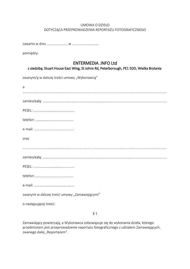 UMOWA O DZIEŁO DOTYCZĄCA PRZEPROWADZENIA REPORTAŻU FOTOGRAFICZNEGO zawarta w dniu …………………… w …………………………. pomiędzy: ENTERMEDIA .INFO Ltd z siedzibą: Stuart House East Wing, St Johns Rd, Peterborough, PE1 5DD, Wielka Brytania zwanym/ą w dalszej treści umowy „Wykonawcą” a ………………………………………………........................................................................................................ zamieszkałą: ……………………………………………………………….................................................................. PESEL: ……………………………………….. telefon: …………………………………….. e-mail: ………………………………………. oraz ………………………………………………........................................................................................................ zamieszkałą: ……………………………………………………………….................................................................. PESEL: ……………………………………….. telefon: …………………………………….. e-mail: ………………………………………. zwanymi w dalszej treści umowy „Zamawiającymi” o następującej treści: §1 Zamawiający powierzają, a Wykonawca zobowiązuje się do wykonania dzieła, którego przedmiotem jest przeprowadzenie reportażu fotograficznego z udziałem Zamawiających, zwanego dalej „Reportażem”. §2 Reportaż, o którym mowa w § 1 zostanie przeprowadzony przy użyciu własnych narzędzi tj. sprzętu fotograficznego i materiałów należących do Wykonawcy. 2. Wykonawca oświadcza, iż narzędzia, które posłużą do wykonania dzieła posiadają walory techniczne, które zapewniają profesjonalne wykonanie przedmiotu niniejszej umowy. 3. Wykonawca oświadcza, że wykona fotografie z najwyższą starannością i na poziomie technicznym właściwym dla tego rodzaju dzieła, jak również zabezpieczy je w odpowiedni do tego sposób w celu reprodukcji fotografii, pracy na nich i archiwizacji. 1. §3 1. Na reportaż składa się fotograficzne udokumentowanie przebiegu przygotowań, ceremonii ślubnej, wesela, oraz pleneru. Reportaż odbędzie się w dniu …………………….......w miejscu ………………………………............. Przygotowania: ………………………………………………..…............................................................. Ceremonia: …………………………………………………….................................................................. Wesele: ………………………………………………………..................................................................... Plener: ………………………………………………………....................................................................... 2. Efektem przeprowadzonego Reportażu będą: fotografie, które następnie po poddaniu profesjonalnej obróbce technicznej zostaną umieszczone na płycie DVD / USB/ SD (minimum ………………….. sztuk); odbitki (…………………… sztuk); album/ foto album galeria internetowa prezentacja multimedialna. Inne (niepotrzebne skreślić) §4 1. Odbiór dzieła nastąpi w miejscu wcześniej ustalonym i zapisanym poniżej. Inny sposób odbioru dzieła możliwy jest po ustaleniu pomiędzy Stronami. 2. Termin odbioru dzieła strony ustalają na dzień : …............................................................. miejsce.............................................., inne.......................................................................... §5 1. Za wykonanie dzieła Zamawiający zobowiązują się do zapłaty na rzecz Wykonawcy 2. wynagrodzenia w wysokości ............................................................................................ złotych brutto 3. (słownie: .............................................................................................................................. ...................................).Wynagrodzenie płatne jest gotówką/przelewem na podane 4. przez Wykonawcę konto bankowe (nr konta ...................................................................................................) nie później niż przy odbiorze przez Zamawiających dzieła. 5. Zamawiający zobowiązują się do wpłacenia na rzecz Wykonawcy zadatku w 6. kwocie ........................... złotych (słownie: .......................................................................................) gotówką/przelewem na podane przez Wykonawcę konto bankowe (nr 7. konta...................................................................). Wykonawca potwierdza w formie pisemnej wpłatę zadatku. Zadatek płatny jest przy podpisaniu niniejszej umowy. §6 Wykonawca nie wyraża zgody na obecność podczas uroczystości ślubno - weselnych Zamawiających innych ( profesjonalnych) fotografów. 2. Wykonawca zachowa na swój użytek, w szczególności dla celów swojej reklamy i promocji, fotografie wykonane dla Zamawiających, jednakże wykorzystanie dzieła przez Wykonawcę w materiałach reklamujących działalność Wykonawcy możliwe jest wyłącznie po uzyskaniu jednorazowej zgody przez Zamawiających. Z tytułu wykorzystania dzieła w materiałach reklamujących działalność Wykonawcy, Zamawiający nie wysuwają żadnych roszczeń finansowych. W wypadku wyrażenia zgody podczas podpisywania umowy, proszę o podpis:............................................. 1. §7 W razie niewykonania lub nienależytego wykonania niniejszej umowy przez Wykonawcę, Zamawiającym przysługuje odwołanie się do Wykonawcy o rekompensatę, oraz zwrot wszystkich kwot dotyczących tego zlecenia. §8 Każda ze stron może jednostronnie odstąpić od niniejszej umowy, bez podania przyczyny, nie później jednak niż na 1 miesiąc przed dniem, o
