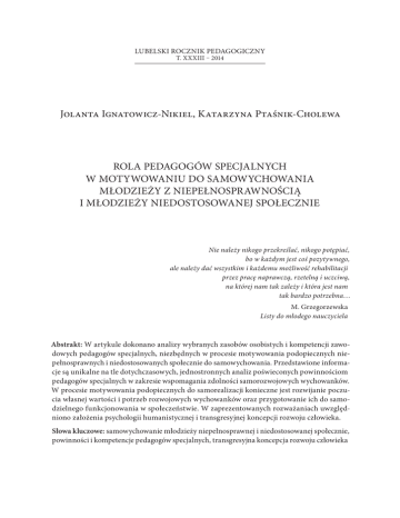 Lubelski rocznik pedagogiczny t. XXXIII – 2014 Jolanta Ignatowicz-Nikiel, Katarzyna Ptaśnik-Cholewa Rola pedagogów specjalnych w motywowaniu do samowychowania młodzieży z niepełnosprawnością i młodzieży niedostosowanej społecznie Nie należy nikogo przekreślać, nikogo potępiać, bo w każdym jest coś pozytywnego, ale należy dać wszystkim i każdemu możliwość rehabilitacji przez pracę naprawczą, rzetelną i uczciwą, na której nam tak zależy i która jest nam tak bardzo potrzebna… M. Grzegorzewska Listy do młodego nauczyciela Abstrakt: W artykule dokonano analizy wybranych zasobów osobistych i kompetencji zawodowych pedagogów specjalnych, niezbędnych w procesie motywowania podopiecznych niepełnosprawnych i niedostosowanych społecznie do samowychowania. Przedstawione informacje są unikalne na tle dotychczasowych, jednostronnych analiz poświeconych powinnościom pedagogów specjalnych w zakresie wspomagania zdolności samorozwojowych wychowanków. W procesie motywowania podopiecznych do samorealizacji konieczne jest rozwijanie poczucia własnej wartości i potrzeb rozwojowych wychowanków oraz przygotowanie ich do samodzielnego funkcjonowania w społeczeństwie. W zaprezentowanych rozważaniach uwzględniono założenia psychologii humanistycznej i transgresyjnej koncepcji rozwoju człowieka. Słowa kluczowe: samowychowanie młodzieży niepełnosprawnej i niedostosowanej społecznie, powinności i kompetencje pedagogów specjalnych, transgresyjna koncepcja rozwoju człowieka 232 Jolanta Ignatowicz-Nikiel, Katarzyna Ptaśnik-Cholewa Wprowadzenie Zagadnienia dążenia człowieka do osobistego rozwoju, kształtowania własnej osoby czy samodzielnego kierowania życiem są tematami, które budziły i ciągle budzą żywe dyskusje naukowe. Głównie na gruncie nauk humanistycznych pojawiają się odmienne poglądy, koncepcje czy też teorie, których autorzy przedstawiają wiele dociekań teoretycznych jak również praktycznych, których przedmiotem jest człowiek (Matwijów 1994, s. 7). Coraz bardziej powszechne staje się przekonanie, że poznanie osobowości ludzkiej, systemu wartości, potrzeb, motywów działania oraz możliwości rozwojowych jest niezbędnym warunkiem tworzenia humanistycznej wizji człowieka (Kozielecki 2000, s. 9–10). Poznanie tego, co nurtuje badaczy, wyznaczyć może nowy kierunek w edukacji, która coraz silniej determinowana jest przez oddziaływania globalizacji, a której celem jest samokształtujący się człowiek. W opinii autorek zarówno współczesna psychologia, pedagogika, jak i nauki z pogranicza wskazują na taką tendencję. Na gruncie nauk społecznych istnieje wiele określeń tego, co można by nazwać własną pracą człowieka nad sobą, nabywaniem wiedzy, sprawności psychofizycznej oraz rozwojem osobowości (Janowski 1999, s. 14). Badacze którzy uznają, że pedagogika jest nauką o „[…] wychowaniu, kształceniu i samokształtowaniu się człowieka w ciągu całego życia” (Palka 2006, s. 8), pracę człowieka nad samym sobą określają między innymi terminami: samowychowanie lub autoedukacja, samoedukacja. Motywowanie do samowychowania młodzieży stanowi wyzwanie dla pedagogów, czyli szeroko pojętych osób, które biorą udział w procesie wychowania i edukacji. Niewątpliwie stanowi to zadanie trudne, ponieważ podmiot poddawany oddziaływaniom to młody człowiek, który jest niepowtarzalny oraz znajduje się w momencie swojego życia, kiedy to sam zaczyna podejmować decyzje, samostanowić o sobie, jego działania opierają się głównie na wewnętrznych przeżyciach, a on sam przewartościowuje to, co dane mu zostało w procesie wychowania. Sytuacja taka wydaje się jeszcze bardziej skomplikowana, gdy pedagog, pedagog specjalny próbuje zmotywować do samowychowania, a następnie umiejętnie pokierować tym procesem młodzież z niepełnosprawnością oraz młodzież niedostosowaną społecznie. Jednostki te to osoby, które wymagają specjalnych form oddziaływania ze względu na swe specyficzne potrzeby edukacyjne jak również opiekuńczo-wychowawcze. W jaki sposób zatem motywować młodzież do samowychowania? Jest to skomplikowane oraz niełatwe wyzwanie dla pedagogów specjalnych, którzy muszą codziennie borykać się z tym problemem. W niniejszej pracy zostaną przedstawione pewne tendencje oraz formy oddziaływań. W związku z tym, że w codziennej pracy ma się do czynienia z niepowtarzalnym i jednostkowym Rola pedagogów specjalnych w motywowaniu do samowychowania młodzieży… 233 podmiotem, działania te muszą zostać spersonalizowane oraz dostosowane do każdego z wychowanków osobno. Motywacja i samowychowanie Autorki przyjęły, że rolą, a nawet powinnością pedagogów specjalnych jest motywowanie do samowychowania młodzieży z niepełnosprawnością oraz młodzieży niedostosowanej. W tym miejscu należy rozpatrzyć, czym są zatem motywacja, samowychowanie, aż w końcu motywowanie do samowychowania. Motywacja pojmowana jest jako „[…] ogół motywów występujących aktualnie u danej jednostki […] natomiast motywy jako swoisty stan organizmu, pobudzający osobnika do działania, który ma zaspokoić jakąś potrzebę” (Okoń 1975, s. 178). Psychologowie termin motywacja stosują do opisu wszelkich mechanizmów, które są odpowiedzialne za uruchamianie, ukierunkowanie, podtrzymywanie i zakończenie zachowania. Motywacja w tym znaczeniu dotyczy mechanizmów zachowań prostych jak również złożonych, wewnętrznych i zewnętrznych, afektywnych i poznawczych (Strelau (red.) 2000, s. 427). Opierając się na koncepcji transgresji Józefa Kozieleckiego, można odnieść się do motywacji wewnętrznej i zewnętrznej. Człowiek umotywowany zewnętrznie dąży do osiągnięcia określonej rzeczy wartościowej, która znajduje się w środowisku ekosocjokulturowym. Tymczasem kierując się motywacją wewnętrzną jednostka pragnie zaspokoić własne zainteresowania