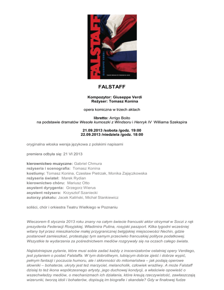FALSTAFF Kompozytor: Giuseppe Verdi Reżyser: Tomasz Konina opera komiczna w trzech aktach libretto: Arrigo Boito na podstawie dramatów Wesołe kumoszki z Windsoru i Henryk IV Williama Szekspira 21.09.2013 /sobota /godz. 19:00 22.09.2013 /niedziela /godz. 18:00 oryginalna włoska wersja językowa z polskimi napisami premiera odbyła się: 21 VI 2013 kierownictwo muzyczne: Gabriel Chmura reżyseria i scenografia: Tomasz Konina kostiumy: Tomasz Konina, Czesław Pietrzak, Monika Zajączkowska reżyseria świateł: Marek Rydian kierownictwo chóru: Mariusz Otto asystent dyrygenta: Grzegorz Wierus asystent reżysera: Krzysztof Szaniecki autorzy plakatu: Jacek Kaliński, Michał Stankiewicz soliści, chór i orkiestra Teatru Wielkiego w Poznaniu Wieczorem 6 stycznia 2013 roku znany na całym świecie francuski aktor otrzymał w Soczi z rąk prezydenta Federacji Rosyjskiej, Władimira Putina, rosyjski paszport. Kilka tygodni wcześniej witany był przez mieszkańców małej przygranicznej belgijskiej miejscowości Nechin, gdzie postanowił zamieszkać, protestując tym samym przeciwko francuskiej polityce podatkowej. Wszystkie te wydarzenia za pośrednictwem mediów rozgrywały się na oczach całego świata. Najistotniejsze pytanie, które musi sobie zadać każdy z inscenizatorów ostatniej opery Verdiego, jest pytaniem o postać Falstaffa. W tym dobrotliwym, lubiącym dobrze zjeść i dobrze wypić, pełnym fantazji i poczucia humoru, ale i skłonności do mitomaństwa – jak podają operowe słowniki – bohaterze, ukryty jest też marzyciel, melancholik, człowiek wrażliwy. A może Falstaff dzisiaj to też ikona współczesnego artysty, jego duchowej kondycji, a właściwie opowieść o wszechwładzy mediów, o mechanizmach ich działania, które kreują rzeczywistość, zawłaszczają wizerunki, tworzą idoli i bohaterów, dopisują im biografie i skandale? Gdy w finałowej fudze Falstaff śpiewa o tym, że życie jest właściwie tylko żartem – słyszymy tam przecież ironię świadomego człowieka, „artysty”, którego ciągłe nienasycenie życiem, skazuje na swoistą bezdomność, na życie „na granicy”. Verdi i Boito w ich lirycznej komedii stworzyli ironiczno-gorzką opowieść o potrzebie wielkich baśniowych narracji, których bohaterami współcześnie stają się ikony mediów – właśnie tak jak pewien znany francuski aktor czy pewien znany brytyjski książę, którego ślub za pośrednictwem kamer, oglądał co trzeci człowiek na świecie. Jesteśmy tacy, jak nasi bohaterowie, idole, ikony. Za tym samym tęsknimy, to samo nas kusi. Tyle w nas skłonności do kabotyństwa, potrzeby kreowania własnego wizerunku, jak i melancholii, tęsknoty za nowym, lepszym życiem, w którym są i baśniowe pałace i królewskie karety. I dzisiaj, ilekroć mamy ochotę śmiać się z Falstaffa, ze wszystkich jego ułomności, nie jesteśmy w stanie uciec od słynnego Gogolowskiego zdania – „I z kogo się śmiejecie? Z samych siebie się śmiejecie!” Tomasz Konina Patronat Honorowy: Ambasador Włoch Riccardo Guariglia OBSADA: FALSTAFF Mark Morouse FORD Stanislav Kuflyuk MRS ALICE FORD Galina Kuklina NANNETTA Natalia Puczniewska FENTON Mikołaj Adamczak MRS QUICKLY Helena Zubanovich MRS MAG PAGE Magdalena Wilczyńska-Goś DR CAIUS Piotr Friebe BARDOLFO Karol Bochański PISTOLA Andrzej Ogórkiewicz