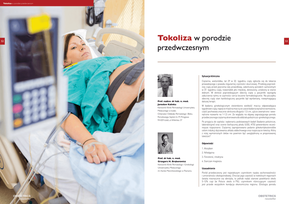Tokoliza w porodzie przedwczesnym Tokoliza w porodzie przedwczesnym 52 53 Sytuacja kliniczna Prof. nadzw. dr hab. n. med. Jarosław Kalinka Kierownik Kliniki Perinatologii Uniwersytetu Medycznego w Łodzi, Ordynator Oddziału Perinatologii i Bloku Porodowego, Szpital im. M. Pirogowa 94-029 Łódź, ul. Wileńska 37 Ciężarna, wieloródka, lat 29 w 32. tygodniu ciąży zgłosiła się do lekarza prowadzącego z powodu regularnej czynności skurczowej. Przebieg poprzedniej ciąży przed pięcioma laty prawidłowy, zakończony porodem samoistnym w 37. tygodniu ciąży, noworodek płci męskiej, donoszony, urodzony w stanie dobrym. W okresie poprzedzającym obecną ciążę u pacjentki wystąpiły zaburzenia rytmu w czynności serca leczone farmakologicznie. Na początku obecnej ciąży stan kardiologiczny pacjentki był wyrównany, niewymagający dalszej terapii. W badaniu ginekologicznym stwierdzono wielkość macicy odpowiadająca tygodniowi ciąży, napięcie mięśnia macicy w czasie badania wyraźnie wzmożone, część pochwowa znacznie skrócona długości 1,5 cm, ujście zewnętrzne i wewnętrzne rozwarte na 1-1,5 cm. Ze względu na objawy zagrażającego porodu przedwczesnego ciężarną skierowano do oddziału położniczo-ginekologicznego. Po przyjęciu do szpitala i wykonaniu podstawowych badań (badanie położnicze, laboratoryjne) oraz ocenie biofizycznej płodu (USG, KTG) potwierdzono wcześniejsze rozpoznanie. Ciężarnej zaproponowano podanie glikokortykosteroidów celem indukcji dojrzewania układu oddechowego oraz rozpoczęcie tokolizy. Który z niżej wymienionych leków nie powinien być uwzględniony w proponowanej tokolizie? Odpowiedzi 1. Atozyban 2. Nifedypina Prof. dr hab. n. med. Grzegorz H. Bręborowicz Kierownik Kliniki Perinatologii i Ginekologii Uniwersytetu Medycznego im. Karola Marcinkowskiego w Poznaniu OBSTETRICS newsletter 3. Fenoterol, ritodryna 4. Siarczan magnezu Uzasadnienie Poród przedwczesny jest największym czynnikiem ryzyka zachorowalności i umieralności okołoporodowej. Chociaż jego częstość w niektórych regionach świata nieznacznie się obniżyła, to jednak nadal stanowi powikłanie około 5-12% ciąż (w Polsce około 6-7%); czynnikiem różnicującym częstość jest przede wszystkim kondycja ekonomiczna regionu. Etiologia porodu OBSTETRICS newsletter Tokoliza w porodzie przedwczesnym 54 przedwczesnego jest niezwykle złożona, niepoznana do końca, co stanowi istotne utrudnienie w prowadzeniu ukierunkowanej profilaktyki. W terapii zagrażającego porodu przedwczesnego stosuje się szereg leków, takich jak blokery kanału wapniowego (nifedypina, siarczan magnezu), antagoniści oksytocyny (atozyban), inhibitory syntezy prostaglandyn (indometacyna), progesteron, donory tlenku azotu oraz agoniści receptorów beta (fenoterol, terbutalin, salbutamol, ritodryna). W większości ośrodków celem terapii jest przedłużenie ciąży co najmniej o okres pozwalający na uzyskanie efektu glikokortykosterydów podanych w celu dojrzewania układu oddechowego płodu. Efektywność tych leków jest podobna, niemniej objawy niepożądane oraz przeciwwskazania do ich stosowania są zróżnicowane. Optymalny lek tokolityczny powinien skutecznie odraczać wystąpienie porodu i jednocześnie charakteryzować się minimalnym działaniem niepożądanym; żaden ze stosowanych obecnie leków nie spełnia tych warunków [1-3]. Beta-mimetyki aktywują cyklazę adenylową, wynikiem czego jest powstawanie 3’,5 -cyklicznego adenozynomonofosforanu (cAMP), który obniża aktywność kinazy lekkiego łańcucha miozyny. Aktywność ta jest obniżana poprzez fosforylację kinazy lekkiego łańcucha miozyny oraz zmniejszenia stężenia wapnia w komórce na drodze jego przesunięcia do retikulum sakroplazmatycznego. Beta-mimetyki stymulują receptory beta-adrenergiczne co może wywołać palpitacje, drżenia, nudności, wymioty, bóle głowy, bóle w klatce piersiowej, skrócony oddech, bóle głowy, niepokój, niemiarowość w czynności serca oraz niedokrwienie mięśnia sercowego. Efektem ich zastosowania mogą być pewne zmiany o charakterze biochemicznym, takie jak zwiększenie stężenia glukozy w surowicy krwi oraz hipokaliemia [4]. W grupie ciężarnych obciążonych zaburzeniami w układzie krążenia ryzyko tych objawów ubocznym jest istotnie wyższe. Skrajnym powikłaniem w tej grupie ciężarnych jest obrzęk płuc, który może zakończyć się zgonem ciężarnej. W związku z powyżej wymienionymi objawami ubocznymi podawanie beta-mimetyków jest przeciwwskazane między innymi w grupie kobiet z zaburzeniami w układzie krążenia, z niskimi wartościami potasu w surowicy krwi oraz zaburzeniami w gospodarce węglowodanowej. Przed rozpoczęciem terapii beta-mimetykami u wszystkich ciężarnych należy wykonać badanie elektrokardiograficzne. OBSTETRICS newsletter Również u płodu terapia beta-mimetykami może wywołać tachykardię. Skuteczność leczenia zagrażającego porodu przedwczesnego oceniana była w różnych badaniach. Metaanalizę tych badań przeprowadzili Anotayanonth i wsp. [25] uwzględniając w niej 17 randomizowanych badań, które objęły 1320 ciężarnych. W metaanalizie tej porównano efekt beta-mimetyków w stosunku do placebo. Częstość porodów w ciągu 48 godzin od rozpoczęcia leczenia istotnie się obniżyła w stosunku do placebo (0.63; CI:0,53-075), natomiast nie różniła się istotnie w okresie 7 dni od początku terapii. Nie wykazano korzystnego wpływu leczenia beta-mimetykami na umieralność okołoporodową, częstość zgonów noworodków oraz częstość wystąpienia zespołu zaburzeń oddychania. Podkreśla się, że korzystny efekt na początku terapii betamimetykami w aspekcie wyhamowania czynności skurczowej mięśnia macicy pozwala na przeprowadzenie stymulacji dojrzewania układu oddechowego płodu oraz przekazanie ciężarnej, jeżeli jest to konieczne, na wyższy poziom opieki perinatalnej. Podawanie 
