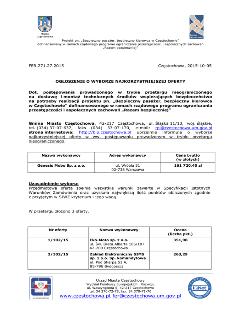 Projekt pn. „Bezpieczny pasażer, bezpieczny kierowca w Częstochowie” dofinansowany w ramach rządowego programu ograniczania przestępczości i aspołecznych zachowań „Razem bezpieczniej” FER.271.27.2015 Częstochowa, 2015-10-05 OGŁOSZENIE O WYBORZE NAJKORZYSTNIEJSZEJ OFERTY Dot. postępowania prowadzonego w trybie przetargu nieograniczonego na dostawę i montaż technicznych środków wspierających bezpieczeństwo na potrzeby realizacji projektu pn. „Bezpieczny pasażer, bezpieczny kierowca w Częstochowie” dofinansowanego w ramach rządowego programu ograniczania przestępczości i aspołecznych zachowań „Razem bezpieczniej” Gmina Miasto Częstochowa, 42-217 Częstochowa, ul. Śląska 11/13, woj. śląskie, tel. (034) 37-07-637, faks (034) 37-07-170, e-mail: [email protected] strona internetowa: http://bip.czestochowa.pl uprzejmie informuje o wyborze najkorzystniejszej oferty w ww. postępowaniu prowadzonym w trybie przetargu nieograniczonego. Nazwa wykonawcy Adres wykonawcy Cena brutto (w złotych) Genesis Mobo Sp. z o.o. ul. Wróbla 51 02-736 Warszawa 161 720,40 zł Uzasadnienie wyboru: Przedmiotowa oferta spełnia wszystkie warunki zawarte w Specyfikacji Istotnych Warunków Zamówienia oraz uzyskała największą ilość punktów obliczonych zgodnie z przyjętym w SIWZ kryterium i jego wagą. W przetargu złożono 3 oferty. Nr oferty Nazwa wykonawcy Ocena (liczba pkt.) 1/102/15 Eko-Moto sp. z o.o. ul. Św. Brata Alberta 105/107 42-200 Częstochowa 351,98 2/102/15 Zakład Elektroniczny SIMS sp. z o.o. Sp. komandytowa ul. Pod Skarpą 51 A, 85-796 Bydgoszcz 263,29 Urząd Miasta Częstochowy Wydział Funduszy Europejskich i Rozwoju ul. Waszyngtona 5, 42-217 Częstochowa tel. 34 370-72-78, fax. 34 370-71-70 www.czestochowa.pl, [email protected] 3/102/15 Genesis Mobo Sp. z o.o. ul. Wróbla 51 02-736 Warszawa 400 Strona 2 z 2