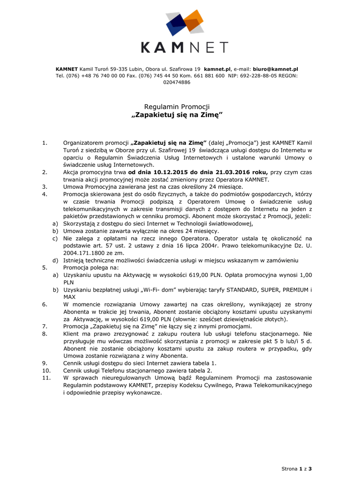 KAMNET Kamil Turoń 59-335 Lubin, Obora ul. Szafirowa 19 kamnet.pl, e-mail: [email protected] Tel. (076) +48 76 740 00 00 Fax. (076) 745 44 50 Kom. 661 881 600 NIP: 692-228-88-05 REGON: 020474886 Regulamin Promocji „Zapakietuj się na Zimę” 1. 2. 3. 4. a) b) c) d) 5. a) b) 6. 7. 8. 9. 10. 11. Organizatorem promocji „Zapakietuj się na Zimę” (dalej „Promocja”) jest KAMNET Kamil Turoń z siedzibą w Oborze przy ul. Szafirowej 19 świadcząca usługi dostępu do Internetu w oparciu o Regulamin Świadczenia Usług Internetowych i ustalone warunki Umowy o świadczenie usług Internetowych. Akcja promocyjna trwa od dnia 10.12.2015 do dnia 21.03.2016 roku, przy czym czas trwania akcji promocyjnej może zostać zmieniony przez Operatora KAMNET. Umowa Promocyjna zawierana jest na czas określony 24 miesiące. Promocja skierowana jest do osób fizycznych, a także do podmiotów gospodarczych, którzy w czasie trwania Promocji podpiszą z Operatorem Umowę o świadczenie usług telekomunikacyjnych w zakresie transmisji danych z dostępem do Internetu na jeden z pakietów przedstawionych w cenniku promocji. Abonent może skorzystać z Promocji, jeżeli: Skorzystają z dostępu do sieci Internet w Technologii światłowodowej, Umowa zostanie zawarta wyłącznie na okres 24 miesięcy. Nie zalega z opłatami na rzecz innego Operatora. Operator ustala tę okoliczność na podstawie art. 57 ust. 2 ustawy z dnia 16 lipca 2004r. Prawo telekomunikacyjne Dz. U. 2004.171.1800 ze zm. Istnieją techniczne możliwości świadczenia usługi w miejscu wskazanym w zamówieniu Promocja polega na: Uzyskaniu upustu na Aktywację w wysokości 619,00 PLN. Opłata promocyjna wynosi 1,00 PLN Uzyskaniu bezpłatnej usługi „Wi-Fi- dom” wybierając taryfy STANDARD, SUPER, PREMIUM i MAX W momencie rozwiązania Umowy zawartej na czas określony, wynikającej ze strony Abonenta w trakcie jej trwania, Abonent zostanie obciążony kosztami upustu uzyskanymi za Aktywację, w wysokości 619,00 PLN (słownie: sześćset dziewiętnaście złotych). Promocja „Zapakietuj się na Zimę” nie łączy się z innymi promocjami. Klient ma prawo zrezygnować z zakupu routera lub usługi telefonu stacjonarnego. Nie przysługuje mu wówczas możliwość skorzystania z promocji w zakresie pkt 5 b lub/i 5 d. Abonent nie zostanie obciążony kosztami upustu za zakup routera w przypadku, gdy Umowa zostanie rozwiązana z winy Abonenta. Cennik usługi dostępu do sieci Internet zawiera tabela 1. Cennik usługi Telefonu stacjonarnego zawiera tabela 2. W sprawach nieuregulowanych Umową bądź Regulaminem Promocji ma zastosowanie Regulamin podstawowy KAMNET, przepisy Kodeksu Cywilnego, Prawa Telekomunikacyjnego i odpowiednie przepisy wykonawcze. Strona 1 z 3 KAMNET Kamil Turoń 59-335 Lubin, Obora ul. Szafirowa 19 kamnet.pl, e-mail: [email protected] Tel. (076) +48 76 740 00 00 Fax. (076) 745 44 50 Kom. 661 881 600 NIP: 692-228-88-05 REGON: Regulamin Promocji „Zapakietuj się na Zimę” Tabela nr 1 Stała miesięczna opłata abonamentowa za usługę w technologii światłowodowej/ kablowej: MAX prędkość MAX prędkość pobierania pobierania 2300 - 1000 1000 – 2300 START 20 Mb/s EKO OPŁATA MAX prędkość wysyłania miesięczna 10 Mb/s 2 Mb/s 35,00 40 Mb/s 20 Mb/s 4 Mb/s 45,00 STANDARD 60 Mb/s 30 Mb/s 6 Mb/s 55,00 SUPER 100 Mb/s 50 Mb/s 8 Mb/s 65,00 PREMIUM 160 Mb/s 80 Mb/s 10 Mb/s 80,00 MAX 240 Mb/s 120 Mb/s 12 Mb/s 120,00 Nazwa Opłata abonamentowa za usługę uwzględniająca rabat za e-fakturę. Opis usług: usługa stałego, szerokopasmowego dostępu do Internetu; uzyskanie dostępu do usługi jest możliwe wyłącznie w przypadku posiadania technicznych możliwości świadczenia wybranej opcji usługi we wskazanej lokalizacji. W ramach usługi Abonent otrzymuje: stały dostęp do sieci Internet z maksymalną prędkością transmisji danych brak limitów w ilości pobieranych i wysyłanych danych; dynamiczne publiczne IP dwukrotną szybkość w godzinach 23:00-10:00 możliwość podzielenia łącza na nieograniczoną liczbę komputerów w Twoim domu, mieszkaniu czy firmie niezależność od linii telefonicznych Tabela nr 2 Stała miesięczna opłata abonamentowa za usługę telefonu stacjonarnego: Nazwa usługi OPŁATA miesięczna Pakiet MINI (utrzymanie numeru + bramki VoIP) 12,90 Pakiet 120 (Utrzymanie numeru, bramki VoIP, 120 min*) 25,00 Pakiet 600 (Utrzymanie numeru, bramki VoIP, 600 min**) 55,00 Pakiet No-Limit (Utrzymanie numeru, Bramki VoIP, bez limitu***) 69,00 *120 min na numery stacjonarne krajowe lub 60 min na numery komórkowe krajowe **600 min na numery stacjonarne krajowe lub 300 min na numery komórkowe krajowe Strona 2 z 3 *** bez limitu na numery stacjonarne krajowe i komórkowe krajowe OPŁATY AKTYWACYJNE Jednorazowa opłata za uzyskanie dostępu do usługi Nazwa usługi Dostęp do usługi przy Umowie na czas 24 miesiące OPŁATA OPŁATA Promocyjna 619,00 1,00 POZOSTAŁE OPŁATY Opłaty jednorazowe Nazwa usługi OPŁATA w PLN Opłata miesięczna za fakturę tradycyjną 4,00 Książeczka abonamentowa - jednorazowo 5,00 Minuta połączenia z nr stacjonarnymi 0,09 Minuta połączenia z nr komórkowymi 0,18 Zawieszenie usługi na życzenie klienta 50% wysokości miesięcznego abonamentu Uruchomienie zawieszonej usługi z powodu braku płatności 30,00 Instalacja sterowników dla poprawnej pracy usługi 35,00 Instalacja sieci komputerowej w obrębie lokalu Według kosztów realizacji Nieuzasadniona wezwanie serwisu 35,00 Konfiguracja komputera lub urządzeń sieciowych na potrzebę korzystania z usług 25,00 Pisemne wezwanie do zapłaty (30 dni po terminie) 23,00 Przypomnienie 5 dni po terminie (tel., sms, e-mail) bezpłatnie Zmiana usługi na nową, wyższą lub niższą (aneks) bezpłatnie Godzina pracy serwisanta 60,00 zł/h Stała miesięczna opłata abonamentowa za usługę Nazwa usługi Dzierżawa routera WiFi – opłata miesięczna OPŁATA 6,00 Wszystkie ceny zawierają podatek VAT 23 % Strona 3 z