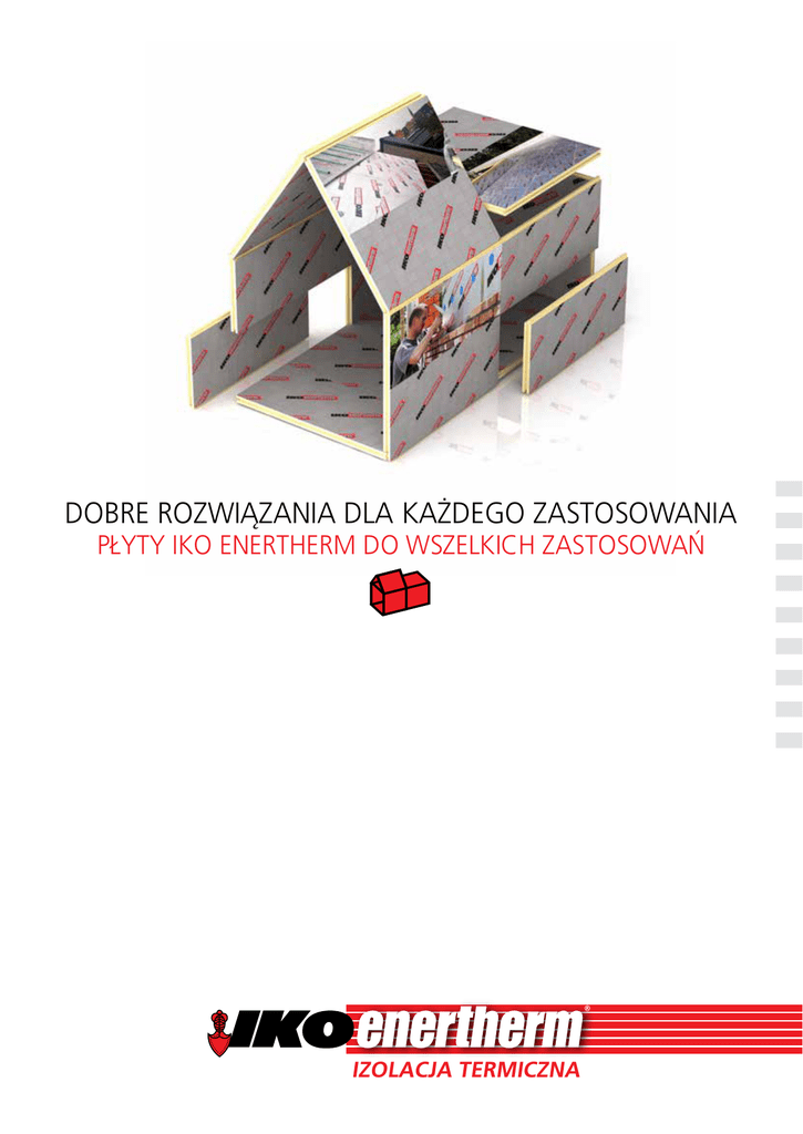 DOBRE ROZWIĄZANIA DLA KAŻDEGO ZASTOSOWANIA PŁYTY IKO ENERTHERM DO WSZELKICH ZASTOSOWAŃ IZOLACJA TERMICZNA I KO enertherm 2 IKO enertherm, wysokowydajne systemy izolacyjne 3 IKO Insulations 4-5 Wkład w ochronę środowiska naturalnego 6-7 Jakość tkwi w szczegółach 8-9 Tabela wyboru izolacji 10-21 Systemy izolacyjne 22-25 Płyty izolacyjne 26-31Akcesoria NOWOŚĆ POBIERZ APLIKACJĘ IKO enertherm Osiąganie dobrych wyników to przesuwanie granic IKO Insulations IKO Insulations jest częścią międzynarodowej grupy IKO Group - wiodącego producenta pokryć dachowych, hydroizolacji i izolacji termicznej. Działając w ramach IKO Group, firma IKO Insulations zajmuje się wyrobem i dystrybucją innowacyjnych produktów bazujących na materiałach z PIR (poliizocyjanuratu), które są dostępne na rynku pod nazwą „IKO enertherm”. Na świecie stale rośnie zapotrzebowanie na materiały izolacyjne dla budownictwa. Aby wyjść mu naprzeciw, IKO Insulations nieustannie inwestuje w prace badawczorozwojowe. Tylko w ten sposób będziemy w stanie uzyskać produkty przesuwające granice w zakresie wydajności energetycznej i wartości izolacyjnej. Przy tworzeniu naprawdę przełomowego, wysokiej jakości produktu trzeba zapewnić precyzyjną równowagę pomiędzy surowcami, projektem, właściwościami i technologią. Wszystkie te elementy muszą ze sobą bezbłędnie współgrać, aby produkt idealnie nadawał się do zamierzonego zastosowania. Właśnie to wyróżnia IKO Insulations. IKO enertherm i sport najwyższych lotów Ciągłe przesuwanie granic w zakresie wartości izolacyjnej i oszczędności energii oraz proporcjonalne łączenie wszystkich czynników decydujących o najlepszych wynikach – to właśnie cechy wyróżniające najlepszych sportowców. Również prawdziwi mistrzowie sportu muszą nieustannie przesuwać swoje własne granice: uzyskiwać lepszy czas, polepszać kondycję, zdobywać więcej punktów, czy też pracować nad techniką. Osiągają najlepsze wyniki nie tylko poprzez intensywny trening, ale również dzięki połączeniu różnych aspektów (odpowiedniej diety, koncentracji, najlepszego sprzętu itp.). W podobny sposób postępuje IKO enertherm, starając się w pełni angażować wszystkie środki – zupełnie tak, jak to robią najlepsi sportowcy! I KO enertherm 3 Wkład w ochronę środowiska naturalnego Dobra izolacja i mniejsze zużycie energii Produkcja przyjazna dla środowiska Niezwykle wydajna izolacja termiczna dla domów, biurow- Odnawialne surowce ców i innych budynków jest najbardziej bezpośrednim i najskuteczniejszym rozwiązaniem, pozwalającym zmniejszyć zużycie energii. Mniejsze zużycie energii oznacza też niższą emisję CO2, odpowiedzialną za ocieplenie klimatu na Ziemi. A to oznacza, że dobra izolacja przyczynia się do ochrony środowiska naturalnego. rzonych surowców odnawialnych. Poddajemy na przykład recyklingowi plastikowe butelki PET a uzyskany w ten sposób surowiec wykorzystujemy w procesie produkcji izolacji PIR. Żadnych odpadów Utrata energii w przypadku domu bez izolacji (źródło ADEME) Dachy 30% Nasze produkty powstają przy znacznym udziale przetwo- Ścinki i odpadki, powstające podczas produkcji płyt IKO enertherm, są następnie w ramach procesu przetwarzane Wentylacja 20% na brykiety. Te z kolei są wykorzystywane jako dodatek przy produkcji betonu. Ściany 20% Podłoga 10% Okna 15% Mostki termiczne 5% Rozmieszczenie produkcji W strategii rozwoju firmy IKO Insulations zadbano o optymalne pod względem geograficznym rozmieszczenie zakładów produkcyjnych. W ten sposób udaje się nam uzyskać krótsze Trwała i zrównoważona izolacja Płyty izolacyjne IKO enertherm wyróżniają się właściwościami (takimi jak odporność na wilgoć, pleśń, odkształcenia) wydłużającymi okres ich eksploatacji bez utraty wydajności energetycznej. trasy dostaw, a to oznacza redukcję obciążenia, jakie niesie transport dla środowiska naturalnego. I KO enertherm 5 I KO enertherm 6 Izolacja PIR IKO enertherm – jakość tkwi w szczegółach Produkowane w unikalny sposób płyty izolacyjne IKO enertherm wyróżniają się właściwościami, dzięki którym przewyższają inne płyty z twardej pianki. To sprawia, że produkty IKO enertherm tworzą najbardziej energooszczędny system, o najdłuższym okresie trwałości, który nie skutkuje utratą parametrów izolacyjnych. Cienkie płyty, zapewniają najwyższy zwrot z 1 m² Nie tracą kształtu, nie zmieniają wymiarów System izolacji IKO enertherm zapewnia najwyższy zwrot z 1 m2. Oznacza to, że przy mniejszej grubości płyt uzyskuje się wyższą wartość izolacyjną, niż w przypadku innych materiałów izolacyjnych (takich jak EPS, XPS czy wełna mineralna). Użycie płyt IKO enertherm zapewnia najlepsze wykorzystanie dostępnej przestrzeni na dachu, w podłodze, czy też miejsca w ścianie 3-warstwowej Płyty posiadają drobną strukturę komórek przy niskiej gęstości pianki, co pozwoliło uzyskać lepsze właściwości mechaniczne, niż w przypadku płyt o grubej strukturze. Dzięki temu nie tracą kształtu i zachowują doskonałe parametry izolacyjne przez wiele lat. Niebywale lekkie Izolacja IKO enertherm spełnia wymogi klasy odporności ogniowej B klasa-s2, d0 w teście „end use” (zastosowanie końcowe). W przypadku pożaru płyty słabo dymią, nie topią się ani nie kapią. Doskonałe właściwości ognioodporne wynikają ze struktury chemicznej płyt izolacyjnych. Płyty IKO enertherm pozwalają uzyskać niezwykle lekką izolację o ciężarze ± 32 kg/m3. Jest to też duża zaleta, jeśli chodzi o ich transport i obróbkę. Zajmują mniej miejsca Dzięki temu, że w porównaniu z innymi materiałami cieńsze płyty IKO enertherm zapewniają taką samą wartość izolacyjną, ich objętość w opakowaniu jest mniejsza. Zajmują mniej miejsca, co obniża koszty transportu. Ognioodporne Niepodatne na działanie wilgoci Płyty IKO ener