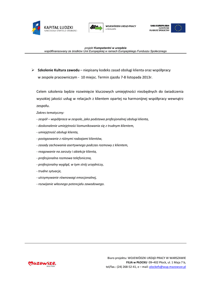 projekt Kompetentni w urzędzie współfinansowany ze środków Unii Europejskiej w ramach Europejskiego Funduszu Społecznego Szkolenie Kultura zawodu – niepisany kodeks zasad obsługi klienta oraz współpracy w zespole pracowniczym - 10 miejsc. Termin zjazdu 7-8 listopada 2013r. Celem szkolenia będzie rozwinięcie kluczowych umiejętności niezbędnych do świadczenia wysokiej jakości usług w relacjach z klientem opartej na harmonijnej współpracy wewnątrz zespołu. Zakres tematyczny: - zespół – współpraca w zespole, jako podstawa profesjonalnej obsługi klienta, - doskonalenie umiejętności komunikowania się z trudnym klientem, - umiejętność obsługi klienta, - postępowanie z różnymi rodzajami klientów, - zasady zachowania asertywnego podczas rozmowy z klientem, klientem - reagowanie na zarzuty i obiekcje klienta, - profesjonalna rozmowa telefoniczna, - profesjonalny wygląd, w tym strój urzędniczy, - trudne sytuacje, - utrzymywanie równowagi emocjonalnej, - rozwijanie własnego potencjału zawodowego. Biuro projektu: WOJEWÓDZKI URZĄD PRACY W WARSZAWIE FILIA w PŁOCKU 09––402 Płock, ul. 1 Maja 7 b, tel/fax.: (24) 268-52-41, e – mail: [email protected]