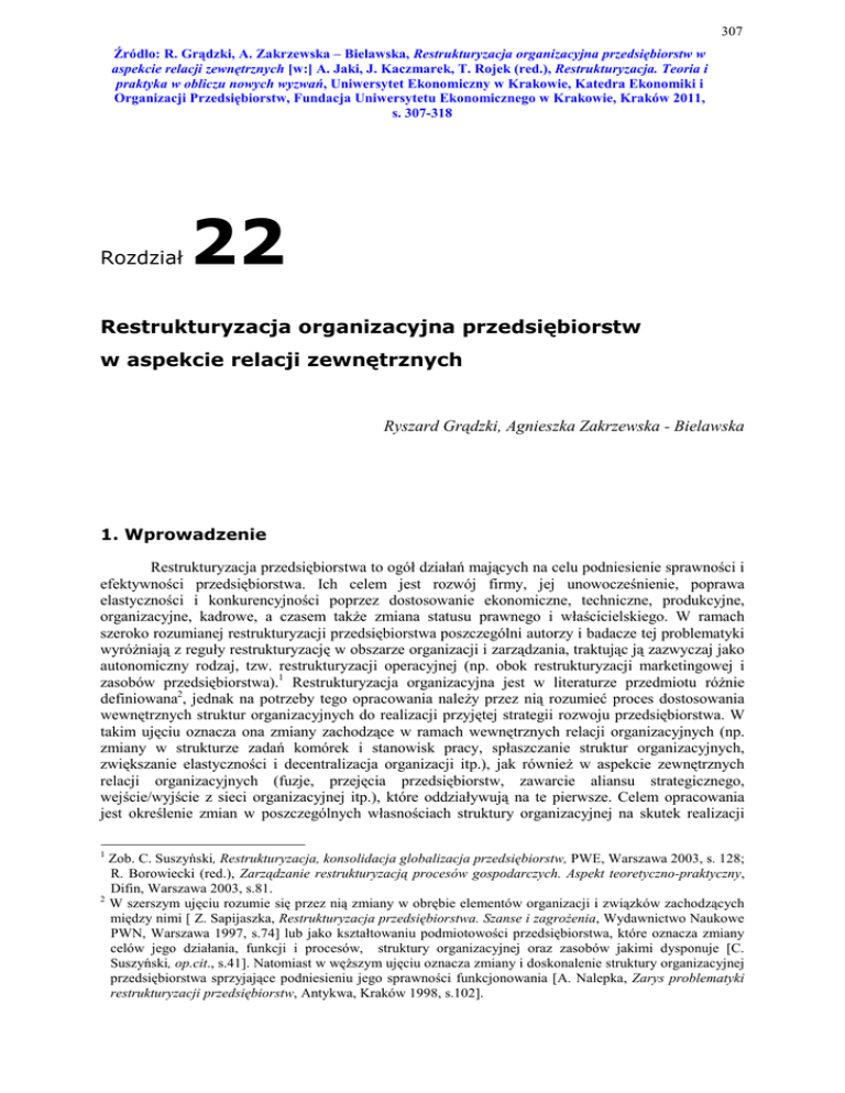 307 Źródło: R. Grądzki, A. Zakrzewska – Bielawska, Restrukturyzacja organizacyjna przedsiębiorstw w aspekcie relacji zewnętrznych [w:] A. Jaki, J. Kaczmarek, T. Rojek (red.), Restrukturyzacja. Teoria i praktyka w obliczu nowych wyzwań, Uniwersytet Ekonomiczny w Krakowie, Katedra Ekonomiki i Organizacji Przedsiębiorstw, Fundacja Uniwersytetu Ekonomicznego w Krakowie, Kraków 2011, s. 307-318 Rozdział 22 Restrukturyzacja organizacyjna przedsiębiorstw w aspekcie relacji zewnętrznych Ryszard Grądzki, Agnieszka Zakrzewska - Bielawska 1. Wprowadzenie Restrukturyzacja przedsiębiorstwa to ogół działań mających na celu podniesienie sprawności i efektywności przedsiębiorstwa. Ich celem jest rozwój firmy, jej unowocześnienie, poprawa elastyczności i konkurencyjności poprzez dostosowanie ekonomiczne, techniczne, produkcyjne, organizacyjne, kadrowe, a czasem także zmiana statusu prawnego i właścicielskiego. W ramach szeroko rozumianej restrukturyzacji przedsiębiorstwa poszczególni autorzy i badacze tej problematyki wyróżniają z reguły restrukturyzację w obszarze organizacji i zarządzania, traktując ją zazwyczaj jako autonomiczny rodzaj, tzw. restrukturyzacji operacyjnej (np. obok restrukturyzacji marketingowej i zasobów przedsiębiorstwa).1 Restrukturyzacja organizacyjna jest w literaturze przedmiotu różnie definiowana2, jednak na potrzeby tego opracowania należy przez nią rozumieć proces dostosowania wewnętrznych struktur organizacyjnych do realizacji przyjętej strategii rozwoju przedsiębiorstwa. W takim ujęciu oznacza ona zmiany zachodzące w ramach wewnętrznych relacji organizacyjnych (np. zmiany w strukturze zadań komórek i stanowisk pracy, spłaszczanie struktur organizacyjnych, zwiększanie elastyczności i decentralizacja organizacji itp.), jak również w aspekcie zewnętrznych relacji organizacyjnych (fuzje, przejęcia przedsiębiorstw, zawarcie aliansu strategicznego, wejście/wyjście z sieci organizacyjnej itp.), które oddziaływują na te pierwsze. Celem opracowania jest określenie zmian w poszczególnych własnościach struktury organizacyjnej na skutek realizacji 1 Zob. C. Suszyński, Restrukturyzacja, konsolidacja globalizacja przedsiębiorstw, PWE, Warszawa 2003, s. 128; R. Borowiecki (red.), Zarządzanie restrukturyzacją procesów gospodarczych. Aspekt teoretyczno-praktyczny, Difin, Warszawa 2003, s.81. 2 W szerszym ujęciu rozumie się przez nią zmiany w obrębie elementów organizacji i związków zachodzących między nimi [ Z. Sapijaszka, Restrukturyzacja przedsiębiorstwa. Szanse i zagrożenia, Wydawnictwo Naukowe PWN, Warszawa 1997, s.74] lub jako kształtowaniu podmiotowości przedsiębiorstwa, które oznacza zmiany celów jego działania, funkcji i procesów, struktury organizacyjnej oraz zasobów jakimi dysponuje [C. Suszyński, op.cit., s.41]. Natomiast w węższym ujęciu oznacza zmiany i doskonalenie struktury organizacyjnej przedsiębiorstwa sprzyjające podniesieniu jego sprawności funkcjonowania [A. Nalepka, Zarys problematyki restrukturyzacji przedsiębiorstw, Antykwa, Kraków 1998, s.102]. 308 Źródło: R. Grądzki, A. Zakrzewska – Bielawska, Restrukturyzacja organizacyjna przedsiębiorstw w aspekcie relacji zewnętrznych [w:] A. Jaki, J. Kaczmarek, T. Rojek (red.), Restrukturyzacja. Teoria i praktyka w obliczu nowych wyzwań, Uniwersytet Ekonomiczny w Krakowie, Katedra Ekonomiki i Organizacji Przedsiębiorstw, Fundacja Uniwersytetu Ekonomicznego w Krakowie, Kraków 2011, s. 307-318 strategii rozwoju opartej na różnorodnym współdziałaniu i łączeniu się z innymi podmiotami gospodarczymi w oparciu o wyniki badań w grupie 31 dużych firm produkcyjnych. 2. Relacje zewnętrzne i ich wpływ na strukturę organizacyjną przedsiębiorstwa Termin relacja oznacza związek, stosunek lub zależność między przedmiotami, pojęciami, zjawiskami i wielkościami itp.3 Odnosi się także do więzi nawiązywanych pomiędzy podmiotami w postaci umów relacyjnych, które oznaczają wysoki poziom współpracy, wspólnego planowania oraz obopólnej adaptacji do potrzeb partnera.4 Można zatem wyróżnić rożnego typu relacje zachodzące w przedsiębiorstwie i poza nim. Do relacji zewnętrznych zalicza się relacje rynkowe, czyli klasyczne relacje transakcyjne z udziałem bądź pominięciem pośredników (diada, triada, sieć), ale także relacje z ukrytymi nierozpoznanymi klientami, relacje między klientami, relacje w których nabywców traktuje się jak członków należących do organizacji oraz relacje usługowe.5 Ważnym typem relacji zewnętrznych są różnego rodzaju powiązania i zależności kooperacyjne, które w istotny sposób wpływają na wewnętrzną strukturę przedsiębiorstw. Współpraca przedsiębiorstwa z innymi organizacjami jest jedną z podstawowych dróg jego rozwoju i coraz częściej staje się źródłem jego przewagi konkurencyjnej. Przedsiębiorstwo może realizować różne strategie wzrostu zewnętrznego, wykorzystując różne formy współpracy, od bardzo luźnych związków kooperacyjnych do ścisłych powiązań kapitałowych i własnościowych. W pierwszym przypadku, efektem rozwoju zewnętrznego jest na ogół racjonalizacja wykorzystania potencjału kooperujących przedsiębiorstw. W drugim następuje rewolucyjna zmiana formy organizacyjno - prawno – własnościowej.6 Podobne stanowisko prezentuje J. Lichtarski, który na podstawie analizy skomplikowanego układu form współdziałania gospodarczego przedsiębiorstw wyróżnia:7 • formy kooperacyjne, w których głównym kryterium przesądzającym o składzie uczestników układu produkcyjnego i o charakterze występujących między nimi powiązań jest współudział w wytwarzaniu produktów, przy czym chodzi tu o współpracę o charakterze trwałym, opartą na odpowiednich porozumieniach, przedsiębiorstwa uczestniczące w związkach tego typu nie są podporządkowane jednolitemu kierownictwu i nie tracą swojej samodz