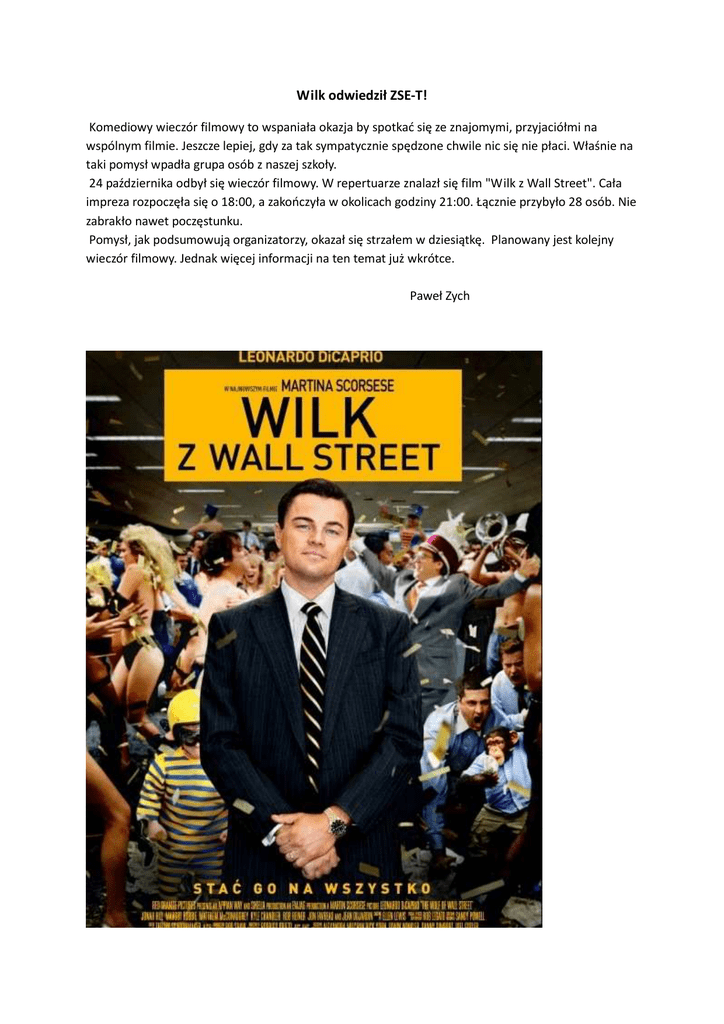 Wilk odwiedził ZSE-T! Komediowy wieczór filmowy to wspaniała okazja by spotkać się ze znajomymi, przyjaciółmi na wspólnym filmie. Jeszcze lepiej, gdy za tak sympatycznie spędzone chwile nic się nie płaci. Właśnie na taki pomysł wpadła grupa osób z naszej szkoły. 24 października odbył się wieczór filmowy. W repertuarze znalazł się film "Wilk z Wall Street". Cała impreza rozpoczęła się o 18:00, a zakończyła w okolicach godziny 21:00. Łącznie przybyło 28 osób. Nie zabrakło nawet poczęstunku. Pomysł, jak podsumowują organizatorzy, okazał się strzałem w dziesiątkę. Planowany jest kolejny wieczór filmowy. Jednak więcej informacji na ten temat już wkrótce. Paweł Zych