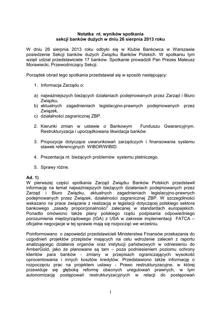 Notatka nt. wyników spotkania sekcji banków dużych w dniu 26 sierpnia 2013 roku W dniu 26 sierpnia 2013 roku odbyło się w Klubie Bankowca w Warszawie posiedzenie Sekcji banków dużych Związku Banków Polskich. W spotkaniu tym wzięli udział przedstawiciele 17 banków. Spotkanie prowadzili Pan Prezes Mateusz Morawiecki, Przewodniczący Sekcji. Porządek obrad tego spotkania przedstawiał się w sposób następujący: 1. Informacja Zarządu o: a) najważniejszych bieżących działaniach podejmowanych przez Zarząd i Biuro Związku, b) aktualnych zagadnieniach legislacyjno-prawnych podejmowanych przez Związek, c) działalności zagranicznej ZBP. 2. Kierunki zmian w ustawie o Bankowym Funduszu Gwarancyjnym. Restrukturyzacja i uporządkowana likwidacja banków. 3. Propozycje dotyczące uwarunkowań zarządczych i finansowania systemu stawek referencyjnych WIBOR/WIBID. 4. Prezentacja nt. bieżących problemów systemu płatniczego. 5. Sprawy różne. Ad. 1) W pierwszej części spotkania Zarząd Związku Banków Polskich przedstawił informację na temat najważniejszych bieżących działaniach podejmowanych przez Zarząd i Biuro Związku, aktualnych zagadnieniach legislacyjno-prawnych podejmowanych przez Związek, działalności zagranicznej ZBP. W szczególności wskazano na prace związane z realizacją w legislacji dotyczącej polskiego sektora bankowego „zasady proporcjonalności” zalecanej w standardach europejskich. Ponadto omówiono także plany polskiego rządu podpisania odpowiedniego porozumienia międzyrządowego (IGA) z USA w zakresie implementacji FATCA – oficjalne negocjacje w tej sprawie mają się rozpocząć we wrześniu. Poinformowano o zapowiedzi przedstawicieli Ministerstwa Finansów przekazania do uzgodnień projektów przepisów mających na celu wdrożenie zaleceń z raportu analizującego działania organów oraz instytucji państwowych w odniesieniu do AmberGold, jako że planowane są tam – poza podniesieniem poziomu ochrony klientów para banków - zmiany w przepisach ograniczających wysokość oprocentowania i innych kosztów kredytów. Przedstawiono także informację o rozpoczęciu prac na projektem ustawy - Prawo restrukturyzacyjne, w której przewiduje się głęboką reformę obecnych uregulowań prawnych, w tym autonomizację postępowań restrukturyzacyjnych w relacji do postępowań 1 upadłościowych. Nowe przepisy odnosić się mają zarówno do przedsiębiorców, jak i konsumentów. Ad. 2) Pan Mariusz Zygierewicz (ZBP) przedstawił zebranym stan prac legislacyjnych nad systemem uporządkowanej likwidacji banków w Polsce i w UE oraz kierunki zmian ustawy o Bankowym Funduszu Gwarancyjnym. Uczestnicy spotkania omówili w tym kontekście także kwestię potencjalnych dodatkowych opłat sektora bankowego z tym związanych, zwracając uwagę iż nadmierny poziom obciążeń banków może w skrajnym przypadku hamować rozwój sektora bankowego i należałoby przeprowadzić badania dotyczące określenia efektywnego rynkowo maksymalnego poziomu środków wnoszonych na Fundusz przez banki. Zaproponowano, aby taka analiza została przygotowana przez Ośrodek Badań i Analiz Systemu Bankowego Alterum. Przedyskutowano również złożoną największym bankom komercyjnym przez Komisję Nadzoru Finansowego oraz Bankowy Fundusz Gwarancyjny propozycję podjęcia się restrukturyzacji poszczególnych spółdzielczych kas oszczędnościowokredytowych przy wsparciu Funduszu w postaci ewentualnych dotacji i gwarancji. Uczestnicy spotkania zwrócili w szczególności uwagę, że sam proces przejęcia i restrukturyzacji innych instytucji finansowych był już wielokrotnie realizowany przez różne banki, jednak w tym wypadku czynnikiem zniechęcającym może się okazać fakt, iż w przypadku SKOK-ów mamy jeszcze do czynienia z dużym ryzykiem politycznym i wizerunkowym dla podmiotu prowadzącego restrukturyzację. Ad.3) Pan Norbert Jeziolowicz (ZBP) przedstawił informację na temat dotychczasowych ustaleń dotyczących nowego sposobu funkcjonowania systemu fixingu stawek referencyjnych polskiego rynku WIBOR/WIBID oraz wprowadzenia zewnętrznego nadzoru nad tym procesem, które zaczęły obowiązywać od 1 lipca br., a także wspólną deklarację ZBP, Krajowego Depozytu Papierów Wartościowych SA oraz Giełdy Papierów Wartościowych SA dotyczącą zapewnienia finansowania tego systemu do końca 2013 roku. Poinformował także, iż zgodnie z projektami legislacyjnymi przygotowanymi przez Komisję Europejską podmioty organizujące tego rodzaju fixing mają w przyszłości podlegać nadzorowi sprawowanemu przez odpowiednie krajowe lub europejskie organy nadzoru. W sprawie zapewnienia docelowego i stabilnego modelu finansowania nadzoru nad fixingiem stawek referencyjnych WIBOR/WIBID zaproponowano utworzenie odrębnej spółki (będącej własnością np. ZBP i Stowarzyszenia Rynków Finansowych ACI Polska), która mogłaby pełnić funkcję organizatora fixingu stawek publikowanych obecnie przez ACI. Źródłem finansowania jej działalności byłaby sprzedaż danych w czasie rzeczywistym oraz udzielanie licencji na korzystanie z logotypów i nazw handlowych tych indeksów przez krajowe czy zagraniczne instytucje finansowe. Uczestnicy spotkania nie zgłosili zastrzeżeń do tej propozycji. Ad. 4) Pan Paweł Widawski (ZBP) przedstawił uczestnikom spotkania aktualny stan prac legislacyjnych dotyczących prac parlamentarnych nad regulacjami ograniczającymi wysokość interchange fee na rynku krajowym oraz projekty nowych rozwiązań europejskich, tj. nową dyrektywę w sprawie usług płatniczych (PSD II) i 2 rozporządzenie dotyczące opłat interchange, jakimi obciążone są transakcje płatnicze realizowane przy użyciu kart. Wskazano także na potencjalne skutki wdrożenia przepisów w znanym obecnie brzmieniu dla polskich banków. W trakcie dyskusji zasygnalizowano także potrzebę integracji prac nad alternatywnymi modelami płatności mobilnych j