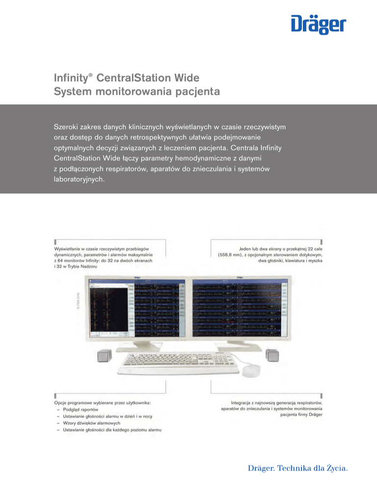 Infinity® CentralStation Wide System monitorowania pacjenta Szeroki zakres danych klinicznych wyświetlanych w czasie rzeczywistym oraz dostęp do danych retrospektywnych ułatwia podejmowanie optymalnych decyzji związanych z leczeniem pacjenta. Centrala Infinity CentralStation Wide łączy parametry hemodynamiczne z danymi z podłączonych respiratorów, aparatów do znieczulania i systemów laboratoryjnych. 02 | Infinity® CentralStation Wide Zalety Pamięć zdarzeń i krzywych dynamicznych Standardowo centrala Infinity CentralStation Wide umożliwia zapis zdarzeń i krzywych dynamicznych (Full Disclosure) z dwóch ostatnich godzin. W przypadku większych wymagań, pamięć ta może być rozbudowana maksymalnie do 120 godzin zapisu zdarzeń i krzywych dynamicznych. Ciągły zapis może obejmować 16 krzywych dynamicznych i 1000 zdarzeń arytmii i innych alarmów dla każdego monitorowanego pacjenta. Centrala jest wyposażona w elektroniczne narzędzie ekranowe do pomiarów odstępów w zapisie EKG. Analiza odcinka ST Obserwacja zmian odcinka ST w centrali Infinity CentralStation Wide ułatwia wykrycie niedokrwienia mięśnia sercowego. Możliwość nałożenia aktualnych zespołów QRS na zachowane zespoły referencyjne pozwala wychwycić nawet subtelne odchylenia ich kształtu. Funkcja dostępu do danych (Patient Census) Centrala Infinity CentralStation Wide oferuje łatwy i ciągły dostęp do podglądu zdarzeń i zapamiętanych krzywych dynamicznych również w sytuacji, gdy pacjent zostanie przeniesiony z jednego oddziału na inny. Funkcja ta organizuje zapamiętane retrospektywne informacje w wygodną do odczytu historię pacjenta dostępną tam, gdzie jest potrzebna. Wszystkie zdarzenia są klasyfikowane i grupowane według ich rodzaju, co ułatwia przeglądanie i ocenę reakcji pacjenta na leczenie. Zdarzenia arytmii są klasyfikowane przy użyciu wieloodprowadzeniowego systemu eksperckiego ACE® (Arrhythmia Classification Expert), opartego na bazie wiedzy. Infinity® VentCentral® Aplikacja VentCentral łączy dane wentylacyjne i hemodynamiczne, ułatwiając ocenę stanu oddechowego pacjenta i efektów leczenia. Udostępnia ustawienia respiratora, fale oddechowe i wartości parametrów, pętle oddechowe przepływu-objętości i ciśnienia-objętości, dane laboratoryjne i trendy. 12 odprowadzeniowa analiza EKG spoczynkowego Centrala może generować diagnostyczne 12 odprowadzeniowe raporty EKG na podstawie zapisów 12 odprowadzeń zbieranych przez połączone z nią monitory Infinity. Pomiary i interpretacje są oparte na interpretacyjnym algorytmie EKG Glasgow dla dzieci i dorosłych. Algorytm ten, uwzględniający wiek, płeć i rasę pacjenta oraz medyczną i kliniczną klasyfikację oferuje wiarygodną interpretację, ułatwiającą podejmowanie decyzji klinicznych. Eksport zapisów EKG Centrala Infinity CentralStation Wide umożliwia eksport niediagnostycznych zapisów EKG (do 24 godzin z 12 odprowadzeń) do systemów komputerowych innych producentów, w celu przechowywania, analizy i tworzenia raportów. Infinity® CentralStation Wide | 03 Zalety Wyświetlanie trendów Centrala Infinity CentralStation Wide zapamiętuje do 120 godzin trendów i umożliwia przeglądanie ich w postaci graficznej i tabelarycznej. Automatyczne skalowanie umożliwia wychwycenie nawet niewielkich zmian, ułatwiając ocenę stanu pacjenta i postępów leczenia. Może to przyśpieszyć podjęcie interwencji w oparciu o interpretację kliniczną i poprawić efekty leczenia. Powiązane produkty D-19739-2009 Infinity® Acute Care System Zmień organizację pracy w swoim szpitalu dzięki systemowi monitorowania pacjentów Infinity® Acute Care System. To nowatorskie rozwiązanie z dwoma ekranami otwiera drzwi do nowego wymiaru mobilności, możliwości adaptacji i konfiguracji – zapewnia płynny transfer pacjenta i informacji związanych z pacjentem przez cały proces leczenia. Infinity® Delta MT-8850-2006 Stacjonarny monitor przyłóżkowy o pełnych możliwościach pomiarowych i jednocześnie monitor transportowy. Umożliwia nieprzerwane monitorowania pacjenta we wszystkich obszarach opieki na terenie szpitala. 04 | Infinity® CentralStation Wide Powiązane produkty D-46868-2015 Infinity® MView – monitor przyłóżkowy Zestaw Infinity MView służy do wygodnego oglądania parametrów życiowych pacjenta i zapisanych danych klinicznych. MView łączy możliwości wieloparametrowego monitora pacjenta serii Infinity z integracją danych w sieci Infinity, w celu prezentacji wyników pomiarów i alarmów wizualnych na niezależnym ekranie przy łóżku pacjenta oraz na innych zdalnych i mobilnych urządzeniach komputerowych połączonych z siecią. D-19731-2009 Infinity® M300 Telemetryczne monitorowanie chodzących pacjentów dorosłych i dzieci przy pomocy kompaktowego monitora Infinity® M300 o wydajności pełnowymiarowego monitora pacjenta, z wykorzystaniem sieci Wi-Fi® szpitala. Wbudowany algorytm detekcji arytmii ACE® (Arrhythmia Classification Expert) i algorytm wykrywania impulsów rozrusznika usprawniają analizę pracy serca i redukują liczbę fałszywych alarmów. Infinity® Gateway Suite D-1195-2009 Lepsze wykorzystanie klinicznych systemów informatycznych. Serwer Gateway integruje dane z kardiomonitorów Dräger i urządzeń terapeutycznych z wynikami laboratoryjnymi i informacjami z klinicznych systemów informatycznych, łącząc dane pochodzące z różnych oddziałów. Aplikacje, interfejsy i narzędzia programistyczne, wchodzące w jego skład, ułatwiają dostęp do informacji o pacjencie. MT-7176-2006 Infinity® Symphony Suite Personel medyczny przebywa w wielu miejscach. Do podejmowania świadomych decyzji potrzebuje dostępu do informacji w dowolnym miejscu i czasie. Infinity Symphony Suite oferuje zdalny dostęp do krzywych dynamicznych, trendów i zdarzeń zapamiętanych przez centralę Infinity CentralStation, z komputera z przeglądarką internetową, połączonego 