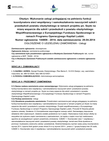 Olsztyn: Wykonanie usługi polegającej na pełnieniu funkcji koordynatora sieci współpracy i samokształcenia nauczycieli szkół i przedszkoli powiatu olsztyńskiego w ramach projektu pn. Szyte na miarę wsparcie dla szkół i przedszkoli z powiatu olsztyńskiego Współfinansowanego z Europejskiego Funduszu Społecznego w ramach Programu Operacyjnego Kapitał Ludzki. Numer ogłoszenia: 144806 - 2014; data zamieszczenia: 29.04.2014 OGŁOSZENIE O UDZIELENIU ZAMÓWIENIA - Usługi Zamieszczanie ogłoszenia: obowiązkowe. Ogłoszenie dotyczy: zamówienia publicznego. Czy zamówienie było przedmiotem ogłoszenia w Biuletynie Zamówień Publicznych: tak, numer ogłoszenia w BZP: 78269 - 2014r. Czy w Biuletynie Zamówień Publicznych zostało zamieszczone ogłoszenie o zmianie ogłoszenia: nie. SEKCJA I: ZAMAWIAJĄCY I. 1) NAZWA I ADRES: Zarząd Powiatu Olsztyńskiego, Plac Bema 5, 10-516 Olsztyn, woj. warmińskomazurskie, tel. 089 5210500, faks 089 5210501. I. 2) RODZAJ ZAMAWIAJĄCEGO: Administracja samorządowa. SEKCJA II: PRZEDMIOT ZAMÓWIENIA II.1) Nazwa nadana zamówieniu przez zamawiającego: Wykonanie usługi polegającej na pełnieniu funkcji koordynatora sieci współpracy i samokształcenia nauczycieli szkół i przedszkoli powiatu olsztyńskiego w ramach projektu pn. Szyte na miarę wsparcie dla szkół i przedszkoli z powiatu olsztyńskiego Współfinansowanego z Europejskiego Funduszu Społecznego w ramach Programu Operacyjnego Kapitał Ludzki.. II.2) Rodzaj zamówienia: Usługi. II.3) Określenie przedmiotu zamówienia: Przedmiotem zamówienia jest usługa polegającej na pełnieniu funkcji koordynatora sieci współpracy i samokształcenia nauczycieli w ramach projektu pn.Szyte na miarę wsparcie dla szkół i przedszkoli z powiatu olsztyńskiego. Projekt współfinansowany z Europejskiego Funduszu Społecznego w ramach Programu Operacyjnego Kapitał Ludzki, Priorytet III Wysoka jakość systemu oświaty, Działanie 3.5 Kompleksowe wspomaganie rozwoju szkół. Zamawiający dopuszcza składanie ofert częściowych. Zadanie zostało podzielone na 4 części. Wykonawca może złożyć ofertę na wszystkie lub wybrane części zamówienia z zastrzeżeniem, że każda z części musi być realizowana zgodnie ze szczegółowym opisem przedmiotu zmówienia. CZĘŚĆ 1. Koordynator sieci 1 współpracy i samokształcenia nauczycieli szkół i przedszkoli powiatu olsztyńskiego, temat sieci Rola dyrektora w promocji i budowaniu wizerunku szkoły i przedszkola. Średniomiesięczny wymiar czasu pracy koordynatora wynosi 25 h. Łączna ilość godzin przez okres 9 m-cy wynosi 225 h , praca z 1 grupą liczącą max 25 osób, CZĘŚĆ 2. Koordynator sieci 2 współpracy i samokształcenia nauczycieli szkół i przedszkoli powiatu olsztyńskiego, temat sieci Jak rozwijać twórcze myślenie uczniów Średniomiesięczny wymiar czasu pracy koordynatora wynosi 25 h. Łączna ilość godzin przez okres 9 m-cy wynosi 225 h, praca z 1 grupą liczącą max 25 osób, CZĘŚĆ 3. Koordynator sieci 3 współpracy i samokształcenia nauczycieli szkół i przedszkoli powiatu olsztyńskiego, temat sieci Praca z uczniem młodszym jak skutecznie i efektywnie pracować w grupie sześciolatków i siedmiolatków. Średniomiesięczny wymiar czasu pracy koordynatora wynosi 25 h. Łączna ilość godzin przez okres 9 mcy wynosi 225 h, praca z 1 grupą liczącą max 25 osób, CZĘŚĆ 4. Koordynator sieci 4 współpracy i samokształcenia nauczycieli szkół i przedszkoli powiatu olsztyńskiego, temat sieci Jak wspierać dziecko w uczeniu matematyki? Średniomiesięczny wymiar czasu pracy koordynatora wynosi 25 h. Łączna ilość godzin przez okres 9 m-cy wynosi 225 h, praca z 1 grupą liczącą max 25 osób, Celem pracy poszczególnych grup w ramach sieci jest: wymiana doświadczeń, dzielenie się sprawdzonymi w praktyce sposobami działania, wspólna praca nad wybranym zagadnieniem, podnoszenie kompetencji zawodowych i umiejętności dydaktycznych związanych z tematyką pracy sieci. Usługa Koordynatora sieci obejmie zasięgiem szkoły i przedszkola na terenie powiatu olsztyńskiego. Zamawiający wyznacza miasto Olsztyn jako miejsce wykonywania zadań. Zadaniem koordynatora sieci jest organizacja pracy zespołu nauczycieli, zapewnienie optymalnych warunków dla uczenia się, współpracy, aktywności i zaangażowania tak, by w możliwie najlepszy sposób korzystać z własnych doświadczeń i efektywnie pracować nad problemami odpowiednio do ich potrzeb i potencjału, w tym w szczególności: przygotowanie planu działania sieci współpracy i samokształcenia zgodnie z potrzebami zgłoszonymi przez uczestników; organizacja spotkań,przygotowanie, prowadzenie, 5 spotkań, 1 grupa x 3 godz., co 2 miesiące, prowadzenie nadzoru nad prawidłowym przebiegiem zajęć, przeprowadzenie ankiet, testów sprawdzających poziom jakości współpracy nauczycieli i dyrektorów, prowadzenie list obecności uczestników projektu, dokumentowanie pracy sieci, moderowanie forum dyskusyjnego na platformie cyfrowej Ośrodka Rozwoju Edukacji, zamieszczanie na platformie cyfrowej materiałów szkoleniowych i innych zasobów edukacyjnych łączących się z tematyką sieci, sporządzanie rocznych sprawozdań z działań sieci i przedstawianie ich uczestnikom oraz kierownikowi projektu, dokumentowanie realizacji zadań sieci, zapraszanie ekspertów wspierających pracę członków poszczególnych sieci w zakresie wybranych problemów, ścisła współpraca z kierownikiem projektu i asystentem kierownika projektu. Osoba pełniąca funkcję koordynatora sieci powinna posiadać: wykształcenie wyższe magisterskie z przygotowaniem pedagogicznym; Zamawiający nie określa wymagań w zakresie stopnia awansu zawodowego nauczycie, doświadczenie: minimum 2 lata doświadczenia w pracy na stanowisku nauczyciela/pedagoga/ psychologa, doświadczenie w pracy z grupą osób dorosłych, prowadzeniu różnych form pracy z grupami osób doros