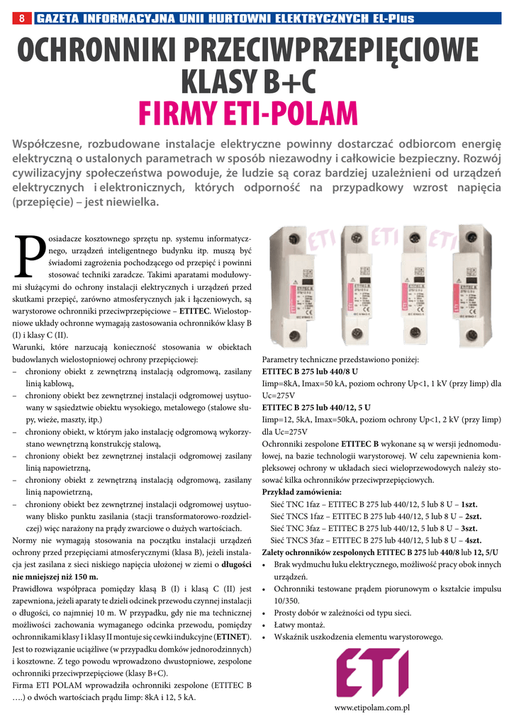 8 GAZETA INFORMACYJNA UNII HURTOWNI ELEKTRYCZNYCH EL-Plus OCHRONNIKI PRZECIWPRZEPIĘCIOWE KLASY B+C FIRMY ETI-POLAM Współczesne, rozbudowane instalacje elektryczne powinny dostarczać odbiorcom energię elektryczną o ustalonych parametrach w sposób niezawodny i całkowicie bezpieczny. Rozwój cywilizacyjny społeczeństwa powoduje, że ludzie są coraz bardziej uzależnieni od urządzeń elektrycznych i elektronicznych, których odporność na przypadkowy wzrost napięcia (przepięcie) – jest niewielka. P osiadacze kosztownego sprzętu np. systemu informatycznego, urządzeń inteligentnego budynku itp. muszą być świadomi zagrożenia pochodzącego od przepięć i powinni stosować techniki zaradcze. Takimi aparatami modułowymi służącymi do ochrony instalacji elektrycznych i urządzeń przed skutkami przepięć, zarówno atmosferycznych jak i łączeniowych, są warystorowe ochronniki przeciwprzepięciowe – ETITEC. Wielostopniowe układy ochronne wymagają zastosowania ochronników klasy B (I) i klasy C (II). Warunki, które narzucają konieczność stosowania w obiektach budowlanych wielostopniowej ochrony przepięciowej: – chroniony obiekt z zewnętrzną instalacją odgromową, zasilany linią kablową, – chroniony obiekt bez zewnętrznej instalacji odgromowej usytuowany w sąsiedztwie obiektu wysokiego, metalowego (stalowe słupy, wieże, maszty, itp.) – chroniony obiekt, w którym jako instalację odgromową wykorzystano wewnętrzną konstrukcję stalową, – chroniony obiekt bez zewnętrznej instalacji odgromowej zasilany linią napowietrzną, – chroniony obiekt z zewnętrzną instalacją odgromową, zasilany linią napowietrzną, – chroniony obiekt bez zewnętrznej instalacji odgromowej usytuowany blisko punktu zasilania (stacji transformatorowo-rozdzielczej) więc narażony na prądy zwarciowe o dużych wartościach. Normy nie wymagają stosowania na początku instalacji urządzeń ochrony przed przepięciami atmosferycznymi (klasa B), jeżeli instalacja jest zasilana z sieci niskiego napięcia ułożonej w ziemi o długości nie mniejszej niż 150 m. Prawidłowa współpraca pomiędzy klasą B (I) i klasą C (II) jest zapewniona, jeżeli aparaty te dzieli odcinek przewodu czynnej instalacji o długości, co najmniej 10 m. W przypadku, gdy nie ma technicznej możliwości zachowania wymaganego odcinka przewodu, pomiędzy ochronnikami klasy I i klasy II montuje się cewki indukcyjne (ETINET). Jest to rozwiązanie uciążliwe (w przypadku domków jednorodzinnych) i kosztowne. Z tego powodu wprowadzono dwustopniowe, zespolone ochronniki przeciwprzepięciowe (klasy B+C). Firma ETI POLAM wprowadziła ochronniki zespolone (ETITEC B ….) o dwóch wartościach prądu Iimp: 8kA i 12, 5 kA. Parametry techniczne przedstawiono poniżej: ETITEC B 275 lub 440/8 U Iimp=8kA, Imax=50 kA, poziom ochrony Up<1, 1 kV (przy Iimp) dla Uc=275V ETITEC B 275 lub 440/12, 5 U Iimp=12, 5kA, Imax=50kA, poziom ochrony Up<1, 2 kV (przy Iimp) dla Uc=275V Ochronniki zespolone ETITEC B wykonane są w wersji jednomodułowej, na bazie technologii warystorowej. W celu zapewnienia kompleksowej ochrony w układach sieci wieloprzewodowych należy stosować kilka ochronników przeciwprzepięciowych. Przykład zamówienia: Sieć TNC 1faz – ETITEC B 275 lub 440/12, 5 lub 8 U – 1szt. Sieć TNCS 1faz – ETITEC B 275 lub 440/12, 5 lub 8 U – 2szt. Sieć TNC 3faz – ETITEC B 275 lub 440/12, 5 lub 8 U – 3szt. Sieć TNCS 3faz – ETITEC B 275 lub 440/12, 5 lub 8 U – 4szt. Zalety ochronników zespolonych ETITEC B 275 lub 440/8 lub 12, 5/U • Brak wydmuchu łuku elektrycznego, możliwość pracy obok innych urządzeń. • Ochronniki testowane prądem piorunowym o kształcie impulsu 10/350. • Prosty dobór w zależności od typu sieci. • Łatwy montaż. • Wskaźnik uszkodzenia elementu warystorowego. www.etipolam.com.pl