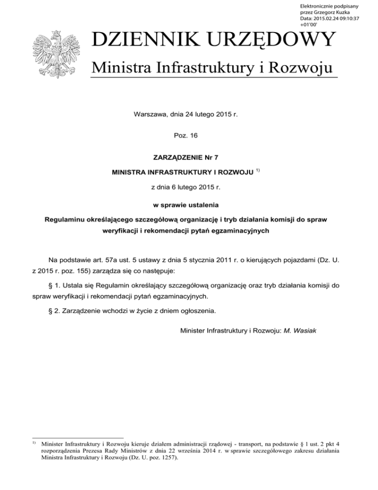 Elektronicznie podpisany przez Grzegorz Kuzka Data: 2015.02.24 09:10:37 +01'00' DZIENNIK URZĘDOWY Ministra Infrastruktury i Rozwoju Warszawa, dnia 24 lutego 2015 r. Poz. 16 ZARZĄDZENIE Nr 7 MINISTRA INFRASTRUKTURY I ROZWOJU 1) z dnia 6 lutego 2015 r. w sprawie ustalenia Regulaminu określającego szczegółową organizację i tryb działania komisji do spraw weryfikacji i rekomendacji pytań egzaminacyjnych Na podstawie art. 57a ust. 5 ustawy z dnia 5 stycznia 2011 r. o kierujących pojazdami (Dz. U. z 2015 r. poz. 155) zarządza się co następuje: § 1. Ustala się Regulamin określający szczegółową organizację oraz tryb działania komisji do spraw weryfikacji i rekomendacji pytań egzaminacyjnych. § 2. Zarządzenie wchodzi w życie z dniem ogłoszenia. Minister Infrastruktury i Rozwoju: M. Wasiak 1) Minister Infrastruktury i Rozwoju kieruje działem administracji rządowej - transport, na podstawie § 1 ust. 2 pkt 4 rozporządzenia Prezesa Rady Ministrów z dnia 22 września 2014 r. w sprawie szczegółowego zakresu działania Ministra Infrastruktury i Rozwoju (Dz. U. poz. 1257). Dziennik Urzędowy Ministra Infrastruktury i Rozwoju –2– Poz. 16 Załącznik do zarządzenia nr 7 Ministra Infrastruktury i Rozwoju z dnia 6 lutego 2015 r. REGULAMIN OKREŚLAJĄCY SZCZEGÓŁOWĄ ORGANIZACJĘ I TRYB DZIAŁANIA KOMISJI DO SPRAW WERYFIKACJI I REKOMENDACJI PYTAŃ EGZAMINACYJNYCH § 1. Regulamin określa szczegółową organizację oraz tryb działania komisji do spraw weryfikacji i rekomendacji pytań egzaminacyjnych, o której mowa w art. 57a ust. 1 ustawy z dnia 5 stycznia 2011 r. o kierujących pojazdami (Dz. U. z 2015 r. poz. 155), zwanej dalej „komisją”. § 2. Komisja działa na podstawie: 1) ustawy z dnia 5 stycznia 2011 r. o kierujących pojazdami, zwanej dalej ,,ustawą”; 2) rozporządzenia Ministra Infrastruktury i Rozwoju z dnia 21 listopada 2014 r. w sprawie komisji do spraw weryfikacji i rekomendacji pytań egzaminacyjnych (Dz. U. poz. 1629), zwanego dalej „rozporządzeniem”; 3) decyzji Ministra Infrastruktury i Rozwoju z dnia 10 grudnia 2014 r. w sprawie powołania komisji do spraw weryfikacji i rekomendacji pytań egzaminacyjnych; 4) niniejszego Regulaminu. Rozdział 1 Przepisy ogólne § 3. 1. Do obowiązków przewodniczącego komisji należy: 1) organizowanie i kierowanie pracą komisji; 2) wnioskowanie do dyrektora właściwej do spraw transportu drogowego komórki organizacyjnej urzędu obsługującego ministra właściwego do spraw transportu o zawarcie umów, w szczególności związanych z zakupem materiałów biurowych, sprzętu i wyposażenia biurowego, materiałów eksploatacyjnych, oprogramowania komputerowego, niezbędnych do pracy komisji; 3) przydzielanie scenariuszy, egzaminacyjnych, wizualizacji podlegających i opisów weryfikacji, wchodzących odpowiednim w skład członkom pytań zespołów weryfikujących; 4) wydawanie, przygotowanych przez sekretarza komisji, zaświadczeń o zatwierdzeniu przez ministra właściwego do spraw transportu poszczególnych scenariuszy, wizualizacji i opisów wchodzących w skład pytań egzaminacyjnych; Dziennik Urzędowy Ministra Infrastruktury i Rozwoju 5) –3– Poz. 16 przekazywanie ministrowi właściwemu do spraw transportu, za pośrednictwem sekretarza komisji, do zatwierdzenia zweryfikowanych i zarekomendowanych scenariuszy, wizualizacji i opisów wchodzących w skład pytań egzaminacyjnych; 6) zlecanie członkom zespołów weryfikujących przygotowanie nowych pytań egzaminacyjnych; 7) zlecanie powtórnej weryfikacji pytania, w przypadku wystąpienia wątpliwości co do jego treści; 8) zlecanie członkom zespołów weryfikujących weryfikacji lub przygotowania pytań stosowanych na egzaminach dla egzaminatorów, instruktorów i instruktorów techniki jazdy; 9) zlecanie członkom zespołów weryfikujących weryfikacji pytań egzaminacyjnych zatwierdzonych przez ministra właściwego do spraw transportu - w przypadku zmiany przepisów określających zakres pytań egzaminacyjnych stosowanych na egzaminach państwowych lub na egzaminach; 10) wnioskowanie do ministra właściwego do spraw transportu o zmianę składu komisji w przypadku stwierdzenia rażących naruszeń lub niewywiązywania się z wyznaczonych obowiązków przez członków komisji. 2. Do obowiązków członków komisji, działających w ramach powołanych zespołów, należy w szczególności: 1) dokonywanie weryfikacji pytań egzaminacyjnych; 2) przygotowywanie nowych pytań egzaminacyjnych; 3) powtórna weryfikacja pytania egzaminacyjnego w przypadku wątpliwości co do jego treści; 4) wywiązywanie się z obowiązków, o których mowa w pkt 1, 2 i 3, w terminie wyznaczonym przez przewodniczącego komisji; 5) przygotowywanie raportu z wykonanej pracy. 3. Do obowiązków sekretarza komisji należy w szczególności: 1) prowadzenie rejestru, o którym mowa w § 6 ust. 1 rozporządzenia; 2) przekazywanie przewodniczącemu komisji listy scenariuszy, wizualizacji i opisów wchodzących w skład pytań egzaminacyjnych podlegających weryfikacji; 3) przygotowywanie listy pytań egzaminacyjnych podlegających weryfikacji - w przypadku zmiany przepisów określających zakres pytań egzaminacyjnych stosowanych na egzaminie państwowym lub na egzaminach; 4) archiwizowanie kopii nadesłanych pytań egzaminacyjnych; 5) koordynowanie pracy komisji, w celu zapewnienia jej sprawnego działania i terminowego wykonywania zadań wyznaczonych przez przewodniczącego komisji; 6) prowadzenie dokumentacji związanej z działalnością komisji; 7) sporządzanie rozliczeń finansowych osób wchodzących w skład komisji; 8) współpraca z komórką organizacyjną odpowiedzialną za publikowanie informacji na stronie internetowej urzędu obsługującego ministra właściwego do spraw transportu, w zakresie publikacji informacji związanych z pracą komisji; 9) wykonywanie innych czynności zleconych przez przewodniczącego komisji. Dziennik Urzędowy Ministr