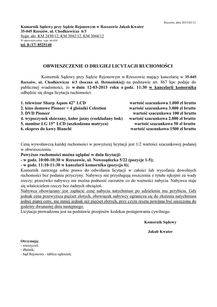 Rzeszów, dnia 2013-02-12 Komornik Sądowy przy Sądzie Rejonowym w Rzeszowie Jakub Kwater 35-045 Rzeszów, ul. Chodkiewicza 6/3 Sygn. akt KM 2430/12, KM 3042/12, KM 3044/12 W odpowiedzi podać: sygn. akt KM tel. 0-/17/ 8525140 OBWIESZCZENIE O DRUGIEJ LICYTACJI RUCHOMOŚCI Komornik Sądowy przy Sądzie Rejonowym w Rzeszowie mający kancelarię w 35-045 Rzeszów, ul. Chodkiewicza 6/3 (boczna ul. Hetmańskiej) na podstawie art. 867 kpc podaje do publicznej wiadomości, że w dniu 12-03-2013 roku o godz. 11:30 w kancelarii komornika odbędzie się druga licytacja ruchomości: 1. telewizor Sharp Aquos 42" LCD 2. kino domowe Pioneer + 4 głośniki Celestion 3. DVD Pioneer 4. wypoczynek skórzany, kolor jasny (rozkładany bok) 5. monitor LG 15" LCD (uszkodzona matryca) 6. ekspres do kawy Bianchi wartość szacunkowa 1.000 zł brutto wartość szacunkowa 3.000 zł brutto wartość szacunkowa 100 zł brutto wartość szacunkowa 2.000 zł brutto wartość szacunkowa 50 zł brutto wartość szacunkowa 1500 zł brutto Ceną wywoławczą każdej ruchomości w powyższej licytacji jest 1/2 wartości szacunkowej podanej w obwieszczeniu. Powyższe ruchomości można oglądać w dniu licytacji: - w godz. 10:00-10:30 w Rzeszowie, ul. Nowosądecka 5/22 (pozycje 1-5); - w godz. 11:10-11:30 w kancelarii komornika (pozycja 6); Komornik zastrzega sobie prawo do odwołania licytacji w całości lub wycofania dowolnych ruchomości bez podania przyczyny. Nabywcy nie przysługują roszczenia z tytułu rękojmi za wady rzeczy; przeciwko nabywcy nie można podnosić zarzutów co do ważności nabycia. Nabywca staje się właścicielem rzeczy bez żadnych obciążeń. Nabywca obowiązany jest zapłacić cenę nabycia natychmiast po udzieleniu mu przybicia. Gdy jednak cena przewyższa pięćset złotych, obowiązek nabywcy ogranicza się do złożenia natychmiast jednej piątej ceny, nie mniej jednak niż pięćset złotych, przy czym reszta powinna być uiszczona do godziny dwunastej dnia następnego. Licytacja prowadzona jest na podstawie przepisów kodeksu postępowania cywilnego. Komornik Sądowy Jakub Kwater Otrzymują: - wierzyciel; - dłużnik; - Sąd Rejonowy - tablica ogłoszeń;