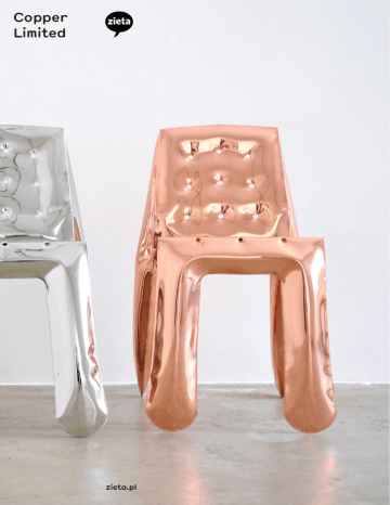Copper Limited zieta.pl Potrzeba wielu lat pracy aby w pełni zrozumieć technologię FiDU i potrafić z niej korzystać. Potrzeba także wiele czasu, aby w pełni świadomie móc pracować z najlepszymi i najbardziej luksusowymi materiałami, w tym z miedzią. Efektem zrozumienia tych dwóch, czyli: synergią innowacyjnej technologii i właściwościami szlachetnego materiału, są nasze ikony, wyprodukowane w miedzianej serii limitowanej. Kochamy miedź, która jako wynik połączenia siły natury i siły człowieka, jest nie tylko luksusowa, ale, według nas, także magiczna. Miedź, odbijając otoczenie i roztaczając wokół siebie wyjątkową aurę ciepła i szlachetności staje się jego częścią. It takes many years of work to fully understand the FiDU technology and be able to use it. It also takes time to be able to work consciously with the best and most luxurious materials, including copper. The result of understanding these two: the synergy of innovative technology and properties of noble material are our icons produced in a limited series of copper version. We love the copper which is the result of combining the forces of nature and man power, is not only a luxury, but according to us, magic. Copper reflecting the environment around and exuding a unique aura of warmth and generosity becomes a part of it. 2 zieta.pl Cardi Black Box Gallery, Milano 3 Miedz jest elementem cywilizacji. Od wieków jest wpleciona w historię postępu ludzkości. Jej decydującą rolę w społeczeństwie możemy dostrzec w naszych domach, transporcie jak również w infrastrukturze i przemyśle. Dziś przedstawiamy „Out Of Ordinary” – limitowaną, miedzianą kolekcję Zieta Prozessdesign Studio. Jest to sekcja produktów Zieta wykonanych z najwyższej jakości materiałów – miedzi i przy użyciu najbardziej innowacyjnej technologii ich przetwarzania – FiDU. Tworzymy obiekty, które łączą sztukę z projektowaniem oraz dedykowane są pod indywidualne potrzeby klientów. 4 Copper is an element of civilization. For centuries it is woven into the history of human progress. Its decisive role in society we see in our homes, transport as well as in infrastructure and industry. Today we present “Out Of Ordinary” – limited, copper collection of Zieta Prozessdesign Studio. It is a section of Zieta products made from the highest quality materials – copper and using the most innovative technology of their processing – FiDU. We create objects that combine art with design and are dedicated to individual customer needs. 5 G-Table B – bioniczny stół, wykonany z miedzi i drewna Kauri. Starożytne Kauri jest najstarszym na świecie drewnem, podczas gdy FiDU jest najbardziej innowacyjną technologią elastycznego formowania metalu. W tym miejscu historia spotyka się z przyszłością. 6 G-Table B – bionic table construction is made of copper bionic table construction and Kauri wood. Ancient Kauri is the oldest wood in the world while FiDU is the most innovative technology of flexible steel forming. Here the history meets the future. 7 8 9 Stołek Plopp to ikona i bestseller Zieta Prozessdesign Studio. Unikalny, wyglądający jak zabawka, a przez to zabawny kształt Ploppa jest efektem innowacyjnej metody formowania materiału - FiDU. Technologia ta oznacza, iż dwa arkusze miedzi są zgrzewane razem wokół ich krawędzi i pompowane pod wysokim ciśnieniem, tworząc trójwymiarowy obiekt 3D. 10 11 Plopp stoo is an icon and bestseller of Zieta Prozessdesign Studio. The unique, toy-looking and playful shape of Plopp is an effect of an innovative forming method – FiDU. This technology means that two ultra-thing steel sheets are welded together around their edges and inflated under high pressure to give a 3d object. Dzięki kolejnym badaniom nad wykorzystywaniem różnych materiałów do obróbki w technologii FiDU, zdecydowaliśmy się zaprezentować wyrafinowane krzesło - Chippensteel 0.5, które wykonane jest z polerowanej i lakierowanej miedzi, oferowane w limitowanej kolekcji 100 sztuk. 12 Due to further research on different material use in the FiDU technology we decided to present the sophisticated brother of the Plopp. Chippensteel 0.5 made of polished and lacquered copper offered in the limited edition of 100 pieces. 13 Products and dimensions Chippensteel 0.5 Plopp family H: 80cm / 31.5” W: 46cm / 18.1” D: 58cm / 22.8” Plopp Mini H: 38cm / 15” Ø 25cm / 9.8” Plopp Standard H: 50cm / 19.7” Ø 35cm / 13.8” Kamm Hnager H: 13cm / 5.1” L: 51cm / 20.1” H: 13cm / 5.1” L: 77cm / 30.3” H: 13cm / 5.1” L: 128cm / 50.4” Rondel Mirror KTR Sword Pin Hnager Ø 36cm / 14.2” H: 100cm / 39.4” Ø 3.9” / 4.7” / 5.5” / 6.3” G-Table K H: 72cm / 28.4” W: 125cm / 49.2” D: 224cm / 88.2” ← Uniwersalny wieszak, dostępny w wielu przyciągających wzrok kolorach i różnych rozmiarach, w tym przypadku ze szlachetnej miedzi, może być wykorzystywany jako zawieszka lub dekoracja ścienna. Spawany i nadmuchany w sposób, który pozwala na uwydatnienie niewielkich wklęsłości na powierzchni, wprowadza nową i ciekawą jakość do tego typu form. 14 ← Universal hanger – avaliable in many eye-catching colours and different sizes to form colour patterns on the walls – can work as hangers or as wall decoration. Welded and inflated in a way that allows small concavities on the surface that brings life to simple dots. 15 Zieta Prozessdesign develops design in new technologies. Unique products are created as a result of experimenting with innovative forming methods. Zieta Prozessdesign combines 3 forces – research, design and production to bring complex design solutions and to eliminate any imperfections or inefficiencies at any stage of bringing concepts to life. At Zieta Prozessdesign new ideas search their intelligent forms – bionic, easily customized, uniquely processed, more efficient – that go beyond today’s understanding of form and construction