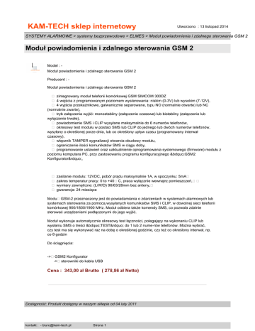 KAM-TECH sklep internetowy Utworzono : 13 listopad 2014 SYSTEMY ALARMOWE > systemy bezprzewodowe > ELMES > Moduł powiadomienia i zdalnego sterowania GSM 2 Moduł powiadomienia i zdalnego sterowania GSM 2 Model : Moduł powiadomienia i zdalnego sterowania GSM 2 Producent : Moduł powiadomienia i zdalnego sterowania GSM 2 � zintegrowany moduł telefonii komórkowej GSM SIMCOM 300DZ � 4 wejścia z programowanym poziomem wysterowania: niskim (0-3V) lub wysokim (7-12V), � 4 wyjścia przekaźnikowe, galwanicznie separowane, typu NO (normalnie otwarte) lub NC (normalnie zwarte), � tryb załączenia wyjść: monostabilny (załączenie czasowe) lub bistabilny (załączenie lub wyłączenie trwałe), � powiadomienie SMS i CLIP wysyłane maksymalnie do 6 numerów telefonów, � okresowy test modułu w postaci SMS lub CLIP do jednego lub dwóch numerów telefonów, wysyłany o określonej porze dnia, lub co określony upływ czasu (programowany interwał czasowy), � włącznik TAMPER sygnalizacji otwarcia obudowy modułu, � ograniczenie ilości komunikatów SMS w ciągu doby, � programowanie ustawień oraz uaktualnienie oprogramowania systemowego (firmware) modułu z poziomu komputera PC, przy zastosowaniu programu konfiguracyjnego „GSM2 Konfigurator”, � zasilanie modułu: 12VDC, pobór prądu maksymalnie 1A, w spoczynku: 5mA� � zakres temperatur pracy: 0 to +40�C, praca wyłącznie wewnątrz pomieszczeń,�� � wymiary zewnętrzne: (L/W/D) 96/63/28mm bez anteny,� � gwarancja: 24 miesiące Modu�GSM-2 przeznaczony jest do powiadamiania o zdarzeniach w systemach alarmowych lub systemach sterowania za pomocą wysyłanych komunikatów SMS i CLIP, w dowolnej sieci telefonii komórkowej 900/1800/1900 MHz. Moduł odbiera także komendy SMS, co pozwala zdalnie sterować urządzeniami podłączonymi do jego wyjść. Moduł wykonuje automatycznie okresowy test łączności, polegający na wykonaniu CLIP lub wysłaniu SMS o treści „TEST” do 1 lub 2 nume-rów telefonów. Można wybrać, czy test ma się wykonywać raz na dobę o określonej godzinie, czy też co określony interwał, np. co 8 godzin Do ściągnięcia: ->�GSM2 Konfigurator ->�sterowniki do kabla USB Cena : 343,00 zł Brutto ( 278,86 zł Netto) Dostępność: Produkt dostępny w naszym sklepie od 04 luty 2011 kontakt : - [email protected] Strona 1