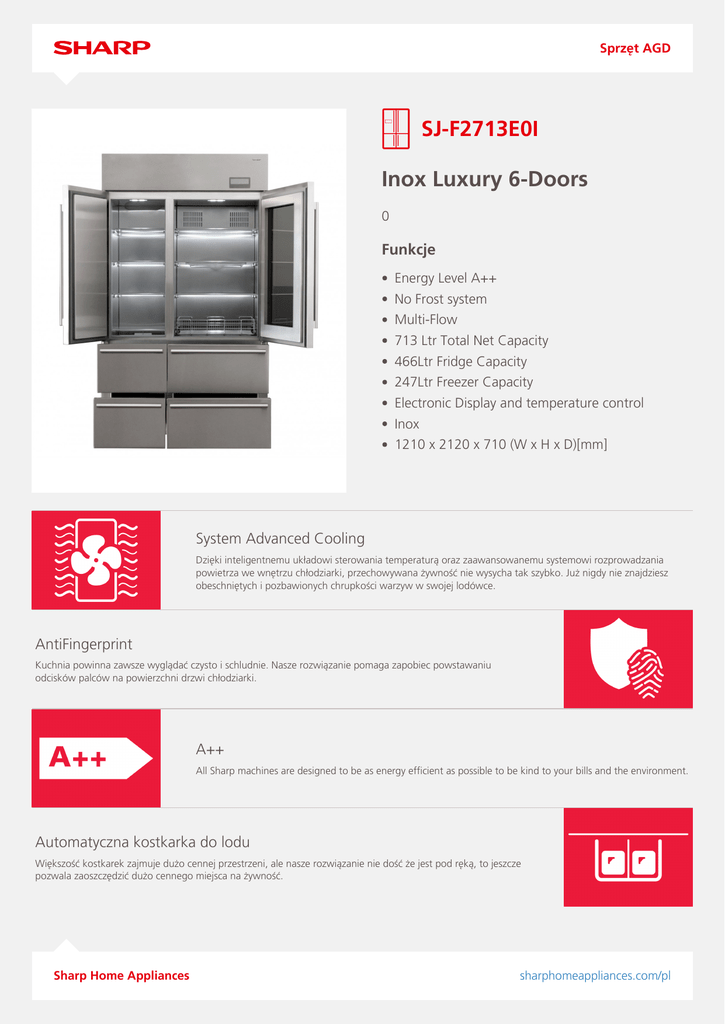 Sprzęt AGD SJ-F2713E0I Inox Luxury 6-Doors 0 Funkcje Energy Level A++ No Frost system Multi-Flow 713 Ltr Total Net Capacity 466Ltr Fridge Capacity 247Ltr Freezer Capacity Electronic Display and temperature control Inox 1210 x 2120 x 710 (W x H x D)[mm] System Advanced Cooling Dzięki inteligentnemu układowi sterowania temperaturą oraz zaawansowanemu systemowi rozprowadzania powietrza we wnętrzu chłodziarki, przechowywana żywność nie wysycha tak szybko. Już nigdy nie znajdziesz obeschniętych i pozbawionych chrupkości warzyw w swojej lodówce. AntiFingerprint Kuchnia powinna zawsze wyglądać czysto i schludnie. Nasze rozwiązanie pomaga zapobiec powstawaniu odcisków palców na powierzchni drzwi chłodziarki. A++ All Sharp machines are designed to be as energy efficient as possible to be kind to your bills and the environment. Automatyczna kostkarka do lodu Większość kostkarek zajmuje dużo cennej przestrzeni, ale nasze rozwiązanie nie dość że jest pod ręką, to jeszcze pozwala zaoszczędzić dużo cennego miejsca na żywność. Sharp Home Appliances sharphomeappliances.com/pl Sprzęt AGD Kluczowe cechy Kolor Inox Sprawność energetyczna A++ Typ produktu French door (4 drzwi) Czas wzrostu temperatury (godz.) 13.66 Liczba drzwi 6 Szklane wykończenie drzwi Nie Wydajność mrożenia (kg/ 24 godziny) 13 Frost free (No frost) Tak Poziom emisji hałasu w powietrzu (dB(A) re1 pW) 48 Roczne zużycie energii (kWh/rok) 435.08 Klasa klimatyczna SN-T Regulowane szklane półki Tak Funkcje Lodówka Regulacja temperatury (elektroniczna/mechaniczna) Tak/Nie Oświetlenie wnętrza (Lodówki) Tak Przedział na warzywa i owoce (ok. 3°C) Nie System chłodzenia Chłodzenie wentylatorowe Multi-Air Flow (No Frost) Przedział o obniżonej temperaturze (-2°C ~ +3°C) Nie System Plasmacluster Ion Nie Szuflada na warzywa i owoce Nie Pochłaniacz zapachów (Honeycomb / Nano) – Pojemniki na drzwiach Tak Sharp Home Appliances sharphomeappliances.com/pl Sprzęt AGD Funkcje zamrażarka No Frost /chłodzenie wentylatorowe Tak/Tak Liczba gwiazdek - zamrażarka 4/ 2 Ekspresowe zamrażanie Nie Automatyczna kostkarka do lodu (typ zbiornikowy) Tak Kostkarka do lodu/obrotowa/z tacką -/-/Tak Pojemnik na lód Tak Regulacja temperatury (elektroniczna/mechaniczna) Tak/Nie Oświetlenie wnętrza (Zamrażarka) Tak Inne funkcje Dozownik wody Nie Alarm otwartych drzwi Tak Zabezpieczenie przed dziećmi Tak Tryb wakacyjny Tak Uchwyt na drzwiach Long cylinder handle Czynnik chłodniczy R600a Elektroniczny wyświetlacz i sterowanie Tak Przekładane drzwi Nie Do zabudowy Opcjonalne Pojemność (całkowita netto) (L) 713 Pojemność chłodziarki (całkowita netto) (L) 466 Pojemność zamrażarki (całkowita netto) (L) 247 Masa, kg (netto) 328 Masa, kg (brutto) 340.5 Szerokość Ponad 80cm Typ systemu odszraniania w chłodziarce/zamrażarce Auto/Auto Pojemność Pojemność (całkowita brutto) (L) 820 Pojemność chłodziarki (całkowita brutto) (L) 498 Pojemność zamrażarki (całkowita brutto) (L) 322 Wymiary i waga Wymiary z uchwytem (sz. x w. x g.) mm 1210 x 2120 x 710 Wymiary bez uchwytu (sz. x w. x g.) mm – Wymiary opakowania (sz. x w. x g.) mm 1300 x 2370 x 780 Sharp Home Appliances sharphomeappliances.com/pl Sprzęt AGD European article number Kod EAN Sharp Home Appliances Powered by TCPDF (www.tcpdf.org) 4974019876658 sharphomeappliances.com/pl
