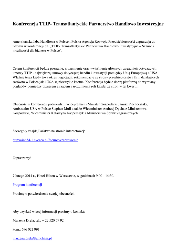 Konferencja TTIP- Transatlantyckie Partnerstwo Handlowo Inwestycyjne Amerykańska Izba Handlowa w Polsce i Polska Agencja Rozwoju Przedsiębiorczości zapraszają do udziału w konferencji pn. „TTIP- Transatlantyckie Partnerstwo Handlowo Inwestycyjne – Szanse i możliwości dla biznesu w Polsce”. Celem konferencji będzie poznanie, zrozumienie oraz wyjaśnienie głównych zagadnień dotyczących umowy TTIP - największej umowy dotyczącej handlu i inwestycji pomiędzy Unią Europejską a USA. Właśnie teraz kiedy trwa okres negocjacji, rekomendacje ze strony przedsiębiorstw i firm działających zarówno w Polsce jak i USA są niezwykle istotne. Konferencja będzie dobrą platformą do wymiany poglądów pomiędzy biznesem a rządem i zrozumienia roli każdej ze stron w tej kwestii. Obecność w konferencji potwierdzili Wicepremier i Minister Gospodarki Janusz Piechociński, Ambasador USA w Polsce Stephen Mull a także Wiceminister Andrzej Dycha z Ministerstwa Gospodarki, Wiceminister Katarzyna Kacperczyk z Ministerstwa Spraw Zagranicznych. Szczegóły znajdą Państwo na stronie internetowej: http://44654-1.evenea.pl/?source=zaproszenie Zapraszamy! 7 lutego 2014 r., Hotel Hilton w Warszawie, w godzinach 9:00 - 14:30. Program konferencji Prosimy o potwierdzenie swojej obecności. Aby uzyskać więcej informacji prosimy o kontakt: Marzena Drela, tel.: + 22 520 59 92 kom.: 696 022 991 [email protected] Powered by TCPDF (www.tcpdf.org)