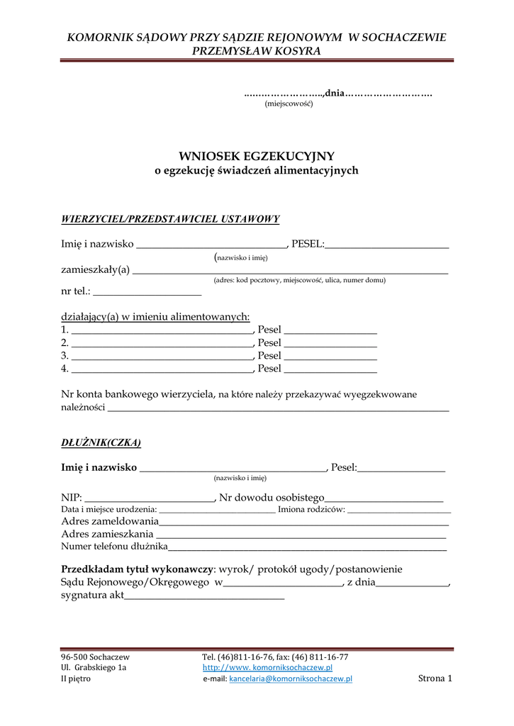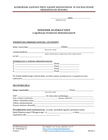 KOMORNIK SĄDOWY PRZY SĄDZIE REJONOWYM W SOCHACZEWIE PRZEMYSŁAW KOSYRA ..….………………..,dnia………………………. (miejscowość) WNIOSEK EGZEKUCYJNY o egzekucję świadczeń alimentacyjnych WIERZYCIEL/PRZEDSTAWICIEL USTAWOWY Imię i nazwisko _____________________________, PESEL:________________________ (nazwisko i imię) zamieszkały(a) _____________________________________________________________ (adres: kod pocztowy, miejscowość, ulica, numer domu) nr tel.: _____________________ działający(a) w imieniu alimentowanych: 1. ___________________________________, Pesel __________________ 2. ___________________________________, Pesel __________________ 3. ___________________________________, Pesel __________________ 4. ___________________________________, Pesel __________________ Nr konta bankowego wierzyciela, na które należy przekazywać wyegzekwowane należności __________________________________________________________________ DŁUŻNIK(CZKA) Imię i nazwisko ____________________________________, Pesel:_________________ (nazwisko i imię) NIP: _________________________, Nr dowodu osobistego_______________________ Data i miejsce urodzenia: ___________________________ Imiona rodziców: ________________________ Adres zameldowania________________________________________________________ Adres zamieszkania ________________________________________________________ Numer telefonu dłużnika___________________________________________________________ Przedkładam tytuł wykonawczy: wyrok/ protokół ugody/postanowienie Sądu Rejonowego/Okręgowego w_______________________, z dnia______________, sygnatura akt_______________________________ 96-500 Sochaczew Ul. Grabskiego 1a II piętro Tel. (46)811-16-76, fax: (46) 811-16-77 http://www. komorniksochaczew.pl e-mail: [email protected] Strona 1 KOMORNIK SĄDOWY PRZY SĄDZIE REJONOWYM W SOCHACZEWIE PRZEMYSŁAW KOSYRA Wnoszę o wszczęcie egzekucji celem wyegzekwowania od w/w dłużnika(czki): 1. alimentów zaległych za czas od _____________________ do_____________________ po __________________ zł, w sumie ___________________________ zł 2. alimentów bieżących od _____________________ po _____________ zł miesięcznie 3. z zasądzonymi odsetkami od _________________________ do dnia zapłaty 4. kosztów egzekucyjnych, które powstaną w toku postępowania 5. innych________________________________________________________________ Egzekucję proszę skierować do: Wynagrodzenia za pracę______________________________________________ ____________________________________________________________________ (nazwa i adres pracodawcy) Ruchomości__________________________________________________________ _____________________________________________________________________ (wymienić ruchomości i miejsce ich położenia) Wierzytelności_______________________________________________________ ____________________________________________________________________ (wskazać wierzytelność oraz podać dane i adres dłużnika zajętej wierzytelności) Kont bankowych w banku_____________________________________________ nr rachunku__________________________________________________________ Nieruchomości położonej w___________________________________________, dla której Sąd Rejonowy w Sochaczewie Wydział Ksiąg Wieczystych prowadzi księgę wieczystą nr KW ______________________________________ Inne dane dotyczące dłużnika ___________________________________________________________________________ ___________________________________________________________________________ ___________________________________________________________________________ ___________________________________________________________________________ ___________________________________________________________________________ Jednocześnie oświadczam, że zobowiązuję się do niezwłocznego informowania Komornika w przypadku otrzymania bezpośrednio od dłużnika jakichkolwiek wpłat tytułem zadłużenia. ____________________________ /czytelny podpis wnioskodawcy/ 96-500 Sochaczew Ul. Grabskiego 1a II piętro Tel. (46)811-16-76, fax: (46) 811-16-77 http://www. komorniksochaczew.pl e-mail: [email protected] Strona 2