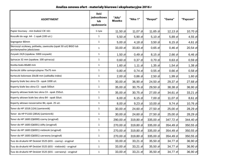 Analiza cenowa ofert - materiały biurowe i eksploatacyjne 2016 r ASORTYMENT Papier biurowy - min białość CIE 161 ilość jednostkowa lub opakowania "Alfa" Miastko "Nika 1" "Respol" "Gama" "Papcom" 1 ryza 11,50 zł 11,07 zł 11,65 zł 12,13 zł 10,70 zł Koszulki do segr. A4 - 1 opak (100 szt.) 1 5,50 zł 5,90 zł 5,10 zł 5,89 zł 4,55 zł Segregator 80mm 1 5,00 zł 4,18 zł 3,50 zł 6,15 zł 4,61 zł Skoroszyt oczkowy, połówka, zawieszka (opak 50 szt) BIGO lub porównywalne jakościowo 1 33,00 zł 33,83 zł 0,65 zł 0,46 zł 20,54 zł Zszywki 24/6 (opakow. 5000 zszywek) 1 1,50 zł 0,49 zł 8,15 zł 2,66 zł 6,46 zł Spinacze 32 mm (opakow. 100 spinaczy) 1 0,60 zł 0,37 zł 0,70 zł 0,63 zł 0,59 zł Kostka biała 80x80 mm 1 1,60 zł 1,11 zł 1,35 zł 1,54 zł 1,38 zł Karteczki żółte samoprzylepne 75x75 mm 1 0,80 zł 0,74 zł 0,55 zł 0,66 zł 0,58 zł Karteczki kolorowe 20x38 mm (zakładka index) 1 2,00 zł 0,86 zł 2,50 zł 1,99 zł 1,60 zł Koperty białe bez okna C6 - opak 1000 szt. 1 30,00 zł 36,90 zł 24,50 zł 29,37 zł 27,68 zł Koperty białe bez okna C5 - opak 500szt 1 35,00 zł 30,75 zł 29,50 zł 38,38 zł 36,90 zł Koperty aktowe białe bez okna C4 - opak 250szt. 1 35,00 zł 30,75 zł 27,00 zł 34,61 zł 33,21 zł Koperty aktowe białe bez okna B4 - opak 50szt. 1 6,00 zł 6,15 zł 7,00 zł 11,07 zł 8,61 zł Koperty aktowe rozszerzalne B4, opak. 25 szt. 1 8,00 zł 9,23 zł 10,00 zł 9,74 zł 10,76 zł Toner do HP 1018 (12A) (zamiennik) 1 30,00 zł 24,60 zł 27,50 zł 25,00 zł 28,29 zł Toner do HP P1102 (285A) (zamiennik) 1 30,00 zł 24,60 zł 27,50 zł 25,00 zł 28,29 zł Toner do HP 1600 (Q6000) czarny (oryginał) 1 290,00 zł 319,80 zł 335,00 zł 347,72 zł 344,40 zł Toner do HP 1600 (Q6001) żółty (oryginał) 1 270,00 zł 319,80 zł 335,00 zł 354,49 zł 350,55 zł Toner do HP 1600 (Q6001) niebieski (oryginał) 1 270,00 zł 319,80 zł 335,00 zł 354,49 zł 350,55 zł Toner do HP 1600 (Q6001) czerwony (oryginał) 1 270,00 zł 319,80 zł 335,00 zł 354,49 zł 350,55 zł Tusz do drukarki HP DeskJet 5525 (655 - czarny) - oryginał 1 33,00 zł 33,21 zł 35,50 zł 34,77 zł 36,90 zł Tusz do drukarki HP DeskJet 5525 (655 - niebieski) - oryginał 1 33,00 zł 33,21 zł 35,50 zł 34,77 zł 36,90 zł Tusz do drukarki HP DeskJet 5525 (655 - czerwony) - oryginał 1 33,00 zł 33,21 zł 35,50 zł 34,77 zł 36,90 zł Tusz do drukarki HP DeskJet 5525 (655 - żółty) - oryginał 1 33,00 zł 33,21 zł 35,50 zł 34,77 zł 36,90 zł Tusz do drukarki HP DeskJet D 1560 (HP21-czarny) - oryginał 1 50,00 zł 66,42 zł 69,00 zł 69,00 zł 70,11 zł Tusz do drukarki HP DeskJet D 1560 (HP22 -kolorowy) - oryginał 1 60,00 zł 81,18 zł 84,00 zł 83,87 zł 84,87 zł Tusz do drukarki HP DeskJet D 1560 (HP21XL-czarny) - oryginał 1 110,00 zł 113,16 zł 120,00 zł 120,76 zł 121,77 zł Tusz do drukarki HP DeskJet D 1560 (HP22XL-kolorowy) - oryginał 1 120,00 zł 119,31 zł 132,00 zł 131,24 zł 131,61 zł Tusz do drukarki HP DeskJet D 5150 (HP57-kolorowy) - oryginał 1 80,00 zł 81,18 zł 131,00 zł 86,59 zł 129,15 zł Tusz do drukarki HP DeskJet 5150 (HP56 - czarny) - oryginał 1 70,00 zł 70,11 zł 99,50 zł 74,82 zł 109,47 zł Toner do Samsung ML1640 (oryginał) 1 232,00 zł 200,49 zł 246,00 zł 254,42 zł 248,46 zł 2 189,50 zł 2 365,42 zł 2 550,65 zł 2 576,25 zł 2 663,84 zł Razem: wykres cenowy 3 000,00 zł 2 500,00 zł 2 000,00 zł 1 500,00 zł Wiersz 35 1 000,00 zł 500,00 zł 0,00 zł "Alfa" Miastko "Nika 1" "Respol" "Gama" "Papcom"