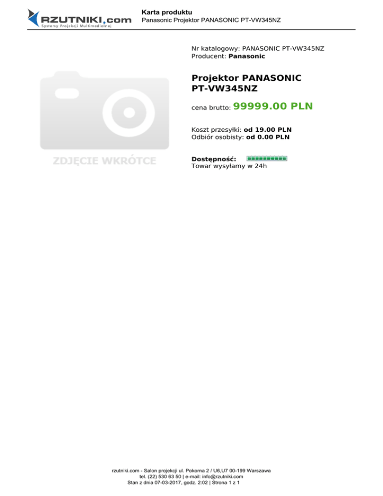 Karta produktu Panasonic Projektor PANASONIC PT-VW345NZ Nr katalogowy: PANASONIC PT-VW345NZ Producent: Panasonic Projektor PANASONIC PT-VW345NZ cena brutto: 99999.00 PLN Koszt przesyłki: od 19.00 PLN Odbiór osobisty: od 0.00 PLN Dostępność: Towar wysyłamy w 24h rzutniki.com - Salon projekcji ul. Pokorna 2 / U6,U7 00-199 Warszawa tel. (22) 530 63 50 | e-mail: [email protected] Stan z dnia 07-03-2017, godz. 2:02 | Strona 1 z 1