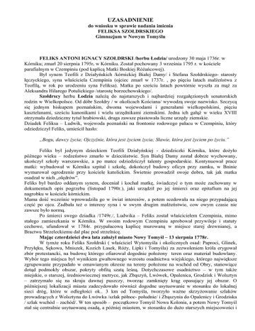 UZASADNIENIE do wniosku w sprawie nadania imienia FELIKSA SZOŁDRSKIEGO Gimnazjum w Nowym Tomyślu FELIKS ANTONI IGNACY SZOŁDRSKI /herbu Łodzia/ urodzony 30 maja 1736r. w Kórniku; zmarł 20 sierpnia 1795r. w Kórniku. Został pochowany 3 września 1795 r. w kościele parafialnym w Czempiniu (pod kaplicą Matki Boskiej Różańcowej). Był synem Teofili z Działyńskich /kórnickiej Białej Damy/ i Stefana Szołdrskiego- starosty łęczyckiego, syna właściciela Czempinia (ojciec zmarł w 1737r. , po pięciu latach małżeństwa z Teofilą, w rok po urodzeniu syna Feliksa). Matka po sześciu latach powtórnie wyszła za mąż za Aleksandra Hilarego Potulickiego /starostę borzechowskiego/. Szołdrscy herbu Łodzia należą do najstarszych i najbardziej rozgałęzionych senatorskich rodzin w Wielkopolsce. Od dóbr Szołdry / w okolicach Kościana/ wywodzą swoje nazwisko. Szczycą się jednym biskupem poznańskim, dwoma wojewodami i generałami wielkopolskimi, pięciu kasztelanami, sześciu kanonikami i wielu urzędnikami ziemskimi. Jedna ich gałąź w wieku XVIII otrzymała dziedziczny tytuł hrabiowski, druga zawsze piastowała liczne urzędy ziemskie. Dziadek Feliksa – Ludwik, wojewoda poznański na frontonie rodowego pałacu w Czempiniu, który odziedziczył Feliks, umieścił hasło: „Bogu, dawcy życia; Ojczyźnie, która jest życiem życia; Sławie, która jest życiem po życiu.” Feliks był jedynym dzieckiem Teofili Działyńskiej - dziedziczki Kórnika, które dożyło późnego wieku – rodzeństwo zmarło w dzieciństwie. Syn Białej Damy został dobrze wychowany, ukończył szkoły warszawskie, a po matce odziedziczył talenty gospodarskie. Kontynuował prace matki: wybudował w Kórniku szpital i szkołę, dokończył budowy oficyn przy zamku, w Bninie wymurował ogrodzenie przy kościele katolickim. Świetnie prowadził swoje dobra, tak jak matka osadzał w nich „olędrów”. Feliks był bardzo oddanym synem, doceniał i kochał matkę, świadczyć o tym może zachowany w dokumentach opis pogrzebu (listopad 1790r.), jaki urządził po jej śmierci oraz epitafium na jej nagrobku w kościele kórnickim. Mama dość wcześnie wprowadziła go w świat interesów, a potem scedowała na niego przypadającą część po ojcu. Zadbała też o interesy syna i w swym drugim małżeństwie, cow owym czasie nie zawsze było normą. Po śmierci swego dziadka /1749r./, Ludwika – Feliks został właścicielem Czempinia, mimo stałego zamieszkania w Kórniku. W swoim rodowym Czempiniu aprobował przywileje i statuty cechowe, ufundował w 1784r. przypałacową kaplicę murowaną w miejsce starej drewnianej, a Bractwu Strzeleckiemu dał plac pod strzelnicę. Mając czterdzieści dwa lata założył miasto Nowy Tomyśl – 13 sierpnia 1778r. W tymże roku Feliks Szołdrski ( właściciel Wytomyśla i okolicznych osad: Paproci, Glinek, Przyłęku, Sękowa, Mniszek, Kozich Lasek, Róży, Lipki i Tomyśla) za zezwoleniem króla erygował zbór protestancki, na budowę którego ofiarował dogodnie położony teren oraz materiał budowlany. Wybór tego miejsca był wynikiem gwałtownego wzrostu osadnictwa wiejskiego, którego największe zgrupowanie przypadało w omawianym okresie na tereny położone na wschód od Obry, stanowiące dotąd podmokły obszar, pokryty obfitą szatą leśną. Dotychczasowe osadnictwo – w tym także miejskie, o starszej, średniowiecznej metryce, jak Zbąszyń, Lwówek, Opalenica, Grodzisk i Wolsztyn – zatrzymało się na skraju dawnej puszczy, tworząc zamknięty krąg opasujący jej obszar. O późniejszej lokalizacji miasta zadecydowało również dogodne usytuowanie w stosunku do lokalnej sieci dróg, które w odległości ok.. 3 km od Tomyśla, tworzyło ważne skrzyżowanie szlaków prowadzących z Wolsztyna do Lwówka /szlak północ- południe/ i Zbąszynia do Opalenicy i Grodziska / szlak wschód – zachód/. W ten sposób – początkowo Tomyśl Nowa Kolonia, a potem Nowy Tomyśl stał się centralnie usytuowaną osadą, a później miastem, w stosunku do dużo starszych miejscowości i osad, co wyznaczyło mu rolę ważnego lokalnego, i dzięki temu dynamicznie rozwijającego się, ośrodka handlowego i usługowego. Przywilej lokacyjny króla Stanisława Augusta Poniatowskiego dla naszego miasta otrzymał Feliks Szołdrski 8 kwietnia 1786r. Miasto założone zostało na prawie niemieckim, zyskało obietnicę osobistej opieki królewskiej i prawo używania herbu właściciela. Przyznano mu prawo organizowania cotygodniowego targu /w poniedziałki/ oraz sześciu jarmarków rocznie, co miało zachęcić rzemieślników i kupców do osiedlania się w nim. Dwa lata później, 18 lutego 1788r., w ślad za dokumentami królewskimi, miasto otrzymało przywilej lokacyjny od właściciela, który potwierdzał przywileje uzyskane przez króla oraz precyzował niezwykle korzystnie sytuację prawną i gospodarczą „...dla pożytku tegoż miasteczka”. W swoim przywileju Feliks Szołdrski wyznaczył teren pod cmentarz, zobowiązał mieszczan do szybkiej budowy ratusza, obiecując dostarczyć na jego budowę cegły i drewno, a magistrat otrzymał prawo wybudowania wagi miejskiej i czerpania z niej zysków. Opodatkowaniu na rzecz miasta podlegały też wszelkie transakcje ziemią, wielu cechom nadane zostały statuty cechowe, przywilej otrzymało też bractwo strzeleckie. Zgodnie z jego wolą herbem miasta został rodowy herb Szołdrskich – Łodzia, któremu towarzyszyć miała u góry nazwa miasta. Feliks ożenił się z Katarzyną Lipską, jednak małżeństwo nie trwało zbyt długo. Rozwiedziony zmarł bezpotomnie. Zapisał swój majątek stryjecznemu wnukowi – Wiktorowi Szołdrskiemu ( który był szwagrem Wielkiego Księcia Konstantego, Dezyderego Chłapowskiego i Marii z Działyńskich, córki Tytusa). Proponując imię Feliksa Szołdrskiego dla Gimnazjum w Nowym Tomyślu, wnioskodawcy pragną podkreślić szczególne znaczenie tej postac