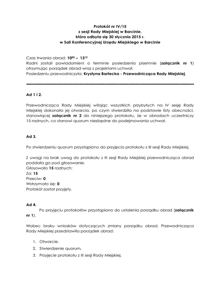 Protokół nr IV/15 z sesji Rady Miejskiej w Barcinie, która odbyła się 30 stycznia 2015 r. w Sali Konferencyjnej Urzędu Miejskiego w Barcinie Czas trwania obrad: 1002 – 1312 Radni zostali powiadomieni o terminie posiedzenia pisemnie (załącznik nr 1) otrzymując porządek obrad wraz z projektami uchwał. Posiedzeniu przewodniczyła: Krystyna Bartecka - Przewodnicząca Rady Miejskiej. Ad 1 i 2. Przewodnicząca Rady Miejskiej witając wszystkich przybyłych na IV sesję Rady Miejskiej dokonała jej otwarcia, po czym stwierdziła na podstawie listy obecności, stanowiącej załącznik nr 2 do niniejszego protokołu, że w obradach uczestniczy 15 radnych, co stanowi quorum niezbędne do podejmowania uchwał. Ad 3. Po stwierdzeniu quorum przystąpiono do przyjęcia protokołu z III sesji Rady Miejskiej. Z uwagi na brak uwag do protokołu z III sesji Rady Miejskiej przewodnicząca obrad poddała go pod głosowanie. Głosowało 15 radnych: Za: 15 Przeciw: 0 Wstrzymało się: 0 Protokół został przyjęty. Ad 4. Po przyjęciu protokołów przystąpiono do ustalenia porządku obrad (załącznik nr 1). Wobec braku wniosków dotyczących zmiany porządku obrad, Przewodnicząca Rady Miejskiej przedstawiła porządek obrad: 1. Otwarcie. 2. Stwierdzenie quorum. 3. Przyjęcie protokołu z III sesji Rady Miejskiej. 4. Ustalenie porządku obrad. 5. Sprawozdanie z działalności Straży Miejskiej w Barcinie w 2014 r. 6. Sprawozdanie Burmistrza z działalności w okresie międzysesyjnym. 7. Zgłaszanie interpelacji i zapytań. 8. Podjęcie uchwał: 8.1. w sprawie zmian w budżecie uchwalonym Uchwałą Nr III/8/2014 Rady Miejskiej w Barcinie z dnia 19 grudnia 2014 r.; 8.2. w sprawie zmian w Wieloletniej Prognozie Finansowej Gminy Barcin uchwalonej Uchwałą Nr III/9/2014 Rady Miejskiej w Barcinie z dnia 19 grudnia 2014 roku; 8.3. w sprawie uchwalenia planu rozwoju i modernizacji urządzeń wodociągowych i kanalizacyjnych na lata 2015-2017; 8.4. zmieniającej uchwałę w sprawie powołania stałych komisji Rady Miejskiej w Barcinie, ustalenia ich przedmiotu działania oraz składu osobowego; 8.5. w sprawie uchwalenia planów pracy stałych komisji Rady Miejskiej w Barcinie. 9. Informacja Przewodniczącego Rady Miejskiej o działaniach podejmowanych w okresie międzysesyjnym. 10. Odpowiedzi na interpelacje. 11. Wolne wnioski, zapytania i informacje. 12. Zakończenie obrad. Ad 5. Komendant Straży Miejskiej w Barcinie Waldemar Polanowski sprawozdanie z działalności w 2014 roku (załącznik nr 3 do protokołu). przedstawił Przebieg dyskusji: Radny Hubert Łukomski: „Panie komendancie, na Komisji Budżetu, Prawa i Porządku Publicznego odpowiadał pan przez blisko godzinę na pytania członków komisji. Ja nie chciałbym się w żaden sposób powtarzać, natomiast mam do pana jeszcze 2 pytania, bo to dzisiejsze wystąpienie traktuję jako uzupełnienie tego sprawozdania, natomiast chciałbym się dowiedzieć, na jakim poziomie mamy ściągalność mandatów? I drugie pytanie, czy używanie tego słynnego fotoradaru przez naszych strażników faktycznie poprawiło bezpieczeństwo na terenie gminy na odcinkach, które są objęte właśnie tym pomiarem?” 2 Komendant Straży Miejskiej W. Polanowski: „Poziom ściągalności grzywien, egzekwowania grzywien w naszej gminie jest bardzo wysoki. Świadczy to o profesjonalizmie i dobrej pracy referatu, którym kieruje pani skarbnik, bo wynosi aż ponad 97%. To jest bardzo wysoki i w skali kraju dość unikatowy wskaźnik. Natomiast jeżeli chodzi o fotoradar i bezpieczeństwo na tych odcinkach nadzorowanych, w których my nadzorujemy, wystąpiliśmy do policji, uzyskałem informację – to jest opisane przeze mnie w sprawozdaniu, przedstawię to mieszkańcom – do czasu dokonywania pomiaru czyli do czasu powstania straży miejskiej na tych odcinkach doszło ogółem do 30 zdarzeń drogowych w tym 3 wypadków. Od 2011 r. sytuacja przedstawia się następująco. W 2011 było tylko 10 zdarzeń, bez wypadków drogowych w ogóle – na tych odcinkach, na których jest prowadzony pomiar przez nas. W 2012 r. wydarzyło się 16 zdarzeń drogowych, w tym 1 wypadek. Natomiast w 2013 r. ogółem doszło do 22 zdarzeń, w tym 4 wypadków. Jednak z tego, co uzyskaliśmy w odpowiedzi z policji, z tej informacji z tego roku dokładnego wynika, że wszystkie wypadki drogowe, które wydarzyły się, wydarzyły się w obrębie skrzyżowań, w których jest objęty na danej ulicy chociażby przykład tu ul. Polnej, gdzie system policyjny zalicza do skrzyżowania wszystkie ulice wchodzące w skład tego skrzyżowania. Czyli mamy tak, że wypadek wydarza się na skrzyżowaniu ul. Pakoska, Polna, 4 Stycznia i Mogileńska, natomiast w systemie policyjnym, jak my się zapytaliśmy, to uzyskaliśmy, że ten wypadek też był na Polnej, co nie do końca jest jakby odzwierciedleniem tego. I tak było w przypadku też pozostałych 4 wypadków. Natomiast podobna sytuacja była właśnie w 2013 r. w tych pozostałych zdarzeniach wypadkowych, natomiast w 2014 r. doszło do 13 zdarzeń drogowych, bez wypadków drogowych. I w związku z powyższym to jest dość wyraźny spadek od liczby pierwotnej, która miała miejsce przed użyciem tego urządzenia i powyższe dane potwierdzają główny cel użycia fotoradaru czyli zmniejszenie liczby i kierowcy jeżdżą na tych odcinkach wolniej.” Radny Sławomir Zelek: „Sprawozdanie z działalności straży miejskiej jest oczywiście bardzo czytelne i wymowne. Można dostrzec w nim bardzo wiele właśnie praktyk, dobrych praktyk, mnie osobiście jednak zabrakło kilku elementów i chciałbym tutaj zapytać pana komendanta. A zatem ustawa z dnia 29 sierpnia 1997 r. o strażach gminnych w art. 11 pkt 8 mówi, że do zadań straży miejskiej należy w szczególności informowanie społeczności lokalnej o stanie i rodzajach zagrożeń, a także inicjowanie i uczestnictwo w działaniach mających na celu zapobieganie popełnianiu przestępstw
