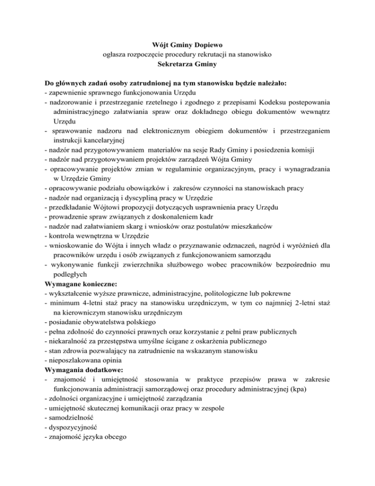 Wójt Gminy Dopiewo ogłasza rozpoczęcie procedury rekrutacji na stanowisko Sekretarza Gminy Do głównych zadań osoby zatrudnionej na tym stanowisku będzie należało: - zapewnienie sprawnego funkcjonowania Urzędu - nadzorowanie i przestrzeganie rzetelnego i zgodnego z przepisami Kodeksu postepowania administracyjnego załatwiania spraw oraz dokładnego obiegu dokumentów wewnątrz Urzędu - sprawowanie nadzoru nad elektronicznym obiegiem dokumentów i przestrzeganiem instrukcji kancelaryjnej - nadzór nad przygotowywaniem materiałów na sesje Rady Gminy i posiedzenia komisji - nadzór nad przygotowywaniem projektów zarządzeń Wójta Gminy - opracowywanie projektów zmian w regulaminie organizacyjnym, pracy i wynagradzania w Urzędzie Gminy - opracowywanie podziału obowiązków i zakresów czynności na stanowiskach pracy - nadzór nad organizacją i dyscypliną pracy w Urzędzie - przedkładanie Wójtowi propozycji dotyczących usprawnienia pracy Urzędu - prowadzenie spraw związanych z doskonaleniem kadr - nadzór nad załatwianiem skarg i wniosków oraz postulatów mieszkańców - kontrola wewnętrzna w Urzędzie - wnioskowanie do Wójta i innych władz o przyznawanie odznaczeń, nagród i wyróżnień dla pracowników urzędu i osób związanych z funkcjonowaniem samorządu - wykonywanie funkcji zwierzchnika służbowego wobec pracowników bezpośrednio mu podległych Wymagane konieczne: - wykształcenie wyższe prawnicze, administracyjne, politologiczne lub pokrewne - minimum 4-letni staż pracy na stanowisku urzędniczym, w tym co najmniej 2-letni staż na kierowniczym stanowisku urzędniczym - posiadanie obywatelstwa polskiego - pełna zdolność do czynności prawnych oraz korzystanie z pełni praw publicznych - niekaralność za przestępstwa umyślne ścigane z oskarżenia publicznego - stan zdrowia pozwalający na zatrudnienie na wskazanym stanowisku - nieposzlakowana opinia Wymagania dodatkowe: - znajomość i umiejętność stosowania w praktyce przepisów prawa w zakresie funkcjonowania administracji samorządowej oraz procedury administracyjnej (kpa) - zdolności organizacyjne i umiejętność zarządzania - umiejętność skutecznej komunikacji oraz pracy w zespole - samodzielność - dyspozycyjność - znajomość języka obcego - znajomość prawa oświatowego Wymaganie dokumenty: - list motywacyjny oraz CV - odpisy lub kserokopie dokumentów potwierdzających wykształcenie, kwalifikacje i doświadczenie zawodowe - oświadczenie kandydata o korzystaniu z pełni praw publicznych - oświadczenie kandydata (lub zaświadczenie z Krajowego Rejestru Karnego) o niekaralności - oświadczenie kandydata o braku przeciwwskazań zdrowotnych do wykonywania pracy na w/w stanowisku - oświadczenie, że kandydat wyraża zgodę na przetwarzanie swoich danych osobowych zawartych w ofercie pracy dla potrzeb niezbędnych do realizacji procesu rekrutacji”, zgodnie z Ustawą z dnia 29.08.1997 r. o ochronie danych osobowych (Dz. U. z 2002r, Nr 101, poz.926 z póżn.zm.) Szczegółowe informacje można uzyskać w Urzędzie Gminy Dopiewo pod nr telefonu (61) 8148-213. Oferty w zamkniętej kopercie należy składać w terminie do dnia 15.01.2015 r. (decyduje data wpływu do Urzędu Gminy) w Sekretariacie Urzędu Gminy w Dopiewie ul. Leśna 1c lub przesłać pocztą na adres: Urząd Gminy 62-070 Dopiewo ul. Leśna 1 c Sekretariat z dopiskiem na kopercie: „Nabór na stanowisko Sekretarza Gminy”. Oferty, które zostaną złożone po terminie nie będą rozpatrywane. Oferty, które nie zostaną wybrane nie podlegają zwrotowi. Kandydaci dopuszczeni do rozmowy kwalifikacyjnej o jej terminie zostaną powiadomieni telefonicznie.