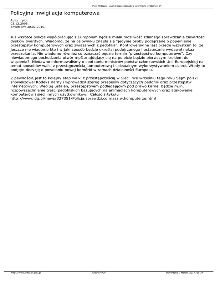 Piotr Witczak - audyt bezpieczenstwa informacji, systemów IT Policyjna inwigilacja komputerowa Autor: piotr 03.12.2008. Zmieniony 30.07.2010. Już wkrótce policja współpracując z Europolem będzie miała możliwość zdalnego sprawdzania zawartości dysków twardych. Wiadomo, że na celowniku znajdą się "jedynie osoby podejrzane o popełnienie przestępstw komputerowych oraz związanych z pedofilią". Kontrowersyjne jest przede wszystkim to, że jeszcze nie wiadomo kto i w jaki sposób będzie określał podejrzanego i ostatecznie wydawał nakaz przeszukania. Nie wiadomo również co oznaczać będzie termin "przestępstwo komputerowe". Czy niewiadomego pochodzenia utwór mp3 znajdujący się na pulpicie będzie pierwszym krokiem do więzienia? Niedawno informowaliśmy o spotkaniu ministrów państw członkowskich Unii Europejskiej na temat sposobów walki z przestępczością komputerową i seksualnym wykorzystywaniem dzieci. Wtedy to podjęto decyzję o powołaniu nowej komórki w ramach działalności Europolu. Z pewnością jest to kolejny etap walki z przestępczością w Sieci. We wrześniu tego roku Sejm polski znowelizował Kodeks Karny i wprowadził szereg przepisów dotyczących pedofilii oraz przestępstw internetowych. Według ustaleń, przestępstwem podlegającym pod prawo karne, będzie m.in. rozpowszechnianie treści pedofilskich bazujących na animacjach komputerowych oraz atakowanie komputerów i sieci innych użytkowników. Całość artykułu http://www.idg.pl/news/327351/Policja.sprawdzi.co.masz.w.komputerze.html http://www.witczak.priv.pl Kreator PDF Utworzono 7 March, 2017, 01:34