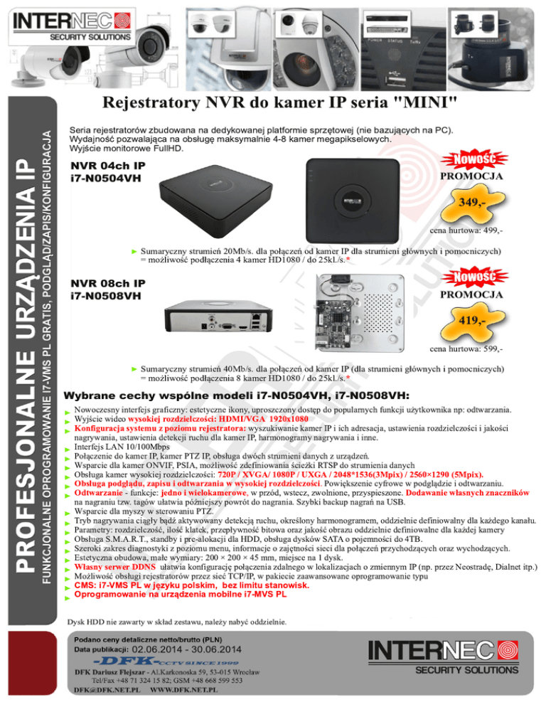 Rejestratory NVR do kamer IP seria "MINI" Seria rejestratorów zbudowana na dedykowanej platformie sprzętowej (nie bazujących na PC). Wydajność pozwalająca na obsługę maksymalnie 4-8 kamer megapikselowych. Wyjście monitorowe FullHD. NVR 04ch IP i7N0504VH PROMOCJA 349,cena hurtowa: 499,Sumaryczny strumień 20Mb/s. dla połączeń od kamer IP dla strumieni głównych i pomocniczych) = możliwość podłączenia 4 kamer HD1080 / do 25kl./s.* NVR 08ch IP i7N0508VH PROMOCJA 419,cena hurtowa: 599,Sumaryczny strumień 40Mb/s. dla połączeń od kamer IP (dla strumieni głównych i pomocniczych) = możliwość podłączenia 8 kamer HD1080 / do 25kl./s.* Wybrane cechy wspólne modeli i7N0504VH, i7N0508VH: Nowoczesny interfejs graficzny: estetyczne ikony, uproszczony dostęp do popularnych funkcji użytkownika np: odtwarzania. Wyjście wideo wysokiej rozdzielczości: HDMI/VGA 1920x1080 Konfiguracja systemu z poziomu rejestratora: wyszukiwanie kamer IP i ich adresacja, ustawienia rozdzielczości i jakości nagrywania, ustawienia detekcji ruchu dla kamer IP, harmonogramy nagrywania i inne. Interfejs LAN 10/100Mbps Połączenie do kamer IP, kamer PTZ IP, obsługa dwóch strumieni danych z urządzeń. Wsparcie dla kamer ONVIF, PSIA, możliwość zdefiniowania ścieżki RTSP do strumienia danych Obsługa kamer wysokiej rozdzielczości: 720P / XVGA/ 1080P / UXGA / 2048*1536(3Mpix) / 2560×1290 (5Mpix). Obsługa podglądu, zapisu i odtwarzania w wysokiej rozdzielczości. Powiększenie cyfrowe w podglądzie i odtwarzaniu. Odtwarzanie - funkcje: jedno i wielokamerowe, w przód, wstecz, zwolnione, przyspieszone. Dodawanie własnych znaczników na nagraniu tzw. tagów ułatwia późniejszy powrót do nagrania. Szybki backup nagrań na USB. Wsparcie dla myszy w sterowaniu PTZ. Tryb nagrywania ciągły bądź aktywowany detekcją ruchu, określony harmonogramem, oddzielnie definiowalny dla każdego kanału. Parametry: rozdzielczość, ilość klatek, przepływność bitowa oraz jakość obrazu oddzielnie definiowalne dla każdej kamery Obsługa S.M.A.R.T., standby i pre-alokacji dla HDD, obsługa dysków SATA o pojemności do 4TB. Szeroki zakres diagnostyki z poziomu menu, informacje o zajętności sieci dla połączeń przychodzących oraz wychodzących. Estetyczna obudowa, małe wymiary: 200 × 200 × 45 mm, miejsce na 1 dysk. Własny serwer DDNS ułatwia konfigurację połączenia zdalnego w lokalizacjach o zmiennym IP (np. przez Neostradę, Dialnet itp.) Możliwość obsługi rejestratorów przez sieć TCP/IP, w pakiecie zaawansowane oprogramowanie typu CMS: i7-VMS PL w języku polskim, bez limitu stanowisk. Oprogramowanie na urządzenia mobilne i7-MVS PL Dysk HDD nie zawarty w skład zestawu, należy nabyć oddzielnie. 02.06.201 4 - 30.06.201 4 PROMOCJA – rejestratory NVR do kamer IP seria ekonomiczna Seria rejestratorów zbudowana na dedykowanej platformie sprzętowej (nie bazujących na PC). Wydajność pozwalająca na obsługę maksymalnie 8-16 kamer megapikselowych. Wyjście monitorowe FullHD. NVR 08ch IP i7-N0608VH PROMOCJA Sumaryczny strumień 40Mb/s. dla połączeń od kamer IP (dla strumieni głównych i pomocniczych) = możliwość podłączenia 8 kamer HD1080 / do 25kl./s.* Miejsce na 2 dyski. Obudowa typu Rack 1U. 599,cena hurtowa: 890,- NVR 16ch IP i7-N0616VH Sumaryczny strumień 80Mb/s. dla połączeń od kamer IP (dla strumieni głównych i pomocniczych) = możliwość podłączenia 16 kamer HD1080 / do 25kl./s.* Miejsce na 2 dyski. Obudowa typu Rack 1U. UWAGA: wyswietlanie MAX 8 kanałów w podziale. * przy założeniu: strumień główny 4Mb/s, strumień pomocniczy 1MB/s dla kanału. PROMOCJA 699,cena hurtowa: 1160,- Wybrane cechy wspólne modeli i7-N0608VH, i7-0616VH: Wyjście wideo na wysokiej rozdzielczości: HDMI/VGA 1920x1080 Interfejs LAN 10/100/1000Mbps Połączenie do kamer IP, kamer PTZ IP, obsługa dwóch strumieni danych z urządzeń. Wsparcie dla kamer ONVIF, PSIA, możliwość zdefiniowania ścieżki RTSP do strumienia danych Obsługa kamer wysokiej rozdzielczości: 720P / XVGA/ 1080P / UXGA / 2048*1536(3Mpix) / 2560×1290 (5Mpix). Obsługa podglądu, zapisu i odtwarzania w wysokiej rozdzielczości. Powiększenie cyfrowe w podglądzie i odtwarzaniu. Odtwarzanie - funkcje: jedno i wielokamerowe, w przód, wstecz, zwolnione, przyspieszone. Dodawanie własnych znaczników na nagraniu tzw. tagów ułatwia późniejszy powrót do nagrania. Szybki backup nagrań na USB. Wsparcie dla myszy w sterowaniu PTZ, w tym tryb 3D. Tryb nagrywania ciągły bądź aktywowany zdarzeniem, określony harmonogramem, oddzielnie definiowalny dla każdego kanału. Parametry: rozdzielczość, ilość klatek, przepływność bitowa oraz jakość obrazu oddzielnie definiowalne dla każdej kamery Definiowanie oddzielnych parametrów dla zapisu ciągłego oraz dla zapisu alarmowego. Obsługa S.M.A.R.T., standby i pre-alokacji dla HDD, obsługa dysków SATA o pojemności do 4TB każdy. Własny serwer DDNS ułatwia konfigurację połączenia zdalnego w lokalizacjach o zmiennym IP (np. przez Neostradę, Dialnet itp.) Możliwość pełnej obsługi rejestratorów przez sieć TCP/IP, w pakiecie zaawansowane oprogramowanie typu CMS: i7-VMS PL w języku polskim, bez limitu stanowisk. Oprogramowanie na urządzenia mobilne i7-MVS PL Dysk HDD nie zawarty w skład zestawu, należy nabyć oddzielnie. 02.06.201 4 - 30.06.201 4 PROMOCJA – rejestratory NVR do kamer IP Seria rejestratorów zbudowana na dedykowanej platformie sprzętowej (nie bazujących na PC), wysoka wydajność pozwalająca na obsługę maksymalnie 16-32 kamer megapikselowych. 2 wyjścia monitorowe FullHD. Wybrane cechy wspólne modeli i7-N0716VH, i7-N0732VH, i7-N07716VH, i7-N07732VH, i7-N0832VH, i7-H0816VH: NOWOŚĆ: inteligentne wyszukiwanie nagrań* Wyjście wideo na 2 monitory wysokiej rozdzielczości: HDMI 1920x1080 i VGA 1920x1080 oraz wyjście pomocnicze BNC. W pełni definiowalny rozkład kamer na monitorach. Wyświetlanie w podziała