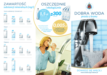 ZAWARTOŚĆ substancji mineralnych [mg/l] Suma substancji mineralnych mineralna średnio zmineralizowana krakowska kranówka 322 mineralna nisko zmineralizowana 181 cena jednej butelki wody mineralnej jest równa cenie ponad 300 butelek wody z kranu 88 44 mineralna średnio zmineralizowana krakowska kranówka mineralna nisko zmineralizowana 33 woda źródlana (butelkowana) Magnez 23 17 10 mineralna średnio zmineralizowana Potas krakowska kranówka 6 mineralna nisko zmineralizowana woda źródlana (butelkowana) 3,8 2,8 1 mineralna średnio zmineralizowana krakowska kranówka KOSZTUJE 1,5 litra WODY MINERALNEJ woda źródlana (butelkowana) Wapń 110 i ekologicznie 1,5 650 365 OSZCZĘDNIE mineralna nisko zmineralizowana 1,6 woda źródlana (butelkowana) 300 butelek 0,005 zł KOSZTUJE 1,5 litra WODY Z KRANU PRAWDY I MITY o wodzie kranowej PRAWDY MITY Wodę kranową można pić bez przegotowania Twarda woda może powodować powstawanie kamieni również w organizmie Woda kranowa jest czysta bakteriologicznie, tak więc jej gotowanie jest niepotrzebne. Wysoka temperatura zabija Powstawanie kamieni w organizmie człowieka wynika jedynie mikroorganizmy, a te są już wcześniej z kranówki głównie z zaburzeń metabolizmu i nie ma związku usuwane. z twardością spożywanej wody. Kamienie w organizmie człowieka to złogi z nierozpuszczalnych szczawianów, W wodzie z kranu są minerały moczanów fosforanów, struwitu lub cholesterolu. Woda w krakowskich kranach jest czysta i zdrowa, a dodatkowo posiada niemałe ilości minerałów (ponad 300 mg składników mineralnych w 1 litrze) w tym biopierwiastki takie jak wapń i magnez. Przegotowanie zmiękcza wodę Powstające w wyniku chlorowania wody związki chemiczne są groźne, gdyż kumulują się w organizmie (w wyniku wieloletniego picia wody z kranu) w organizmie, ponadto ich stężenie w wodzie jest ściśle (kamienia) części minerałów – zwłaszcza związków wapnia monitorowane i nigdy nie przekracza dopuszczalnych norm, i magnezu – co zmiękcza wodę, ale również powoduje co oznacza, że są całkowicie bezpieczne. zubożenie składu mineralnego wody. Z tego powodu spożyciu. Woda pitna dostarczana mieszkańcom Krakowa jest ściśle monitorowana i nie zawiera żadnych szkodliwych dla zdrowia bakterii. Uboczne produkty dezynfekcji wody nie kumulują się Przegotowanie wody powoduje wytrącenie w postaci osadu gotowanie wody nie jest zalecane przy bezpośrednim W wodzie kranowej znajdują się groźne bakterie Chlor w wodzie kranowej jest szkodliwy Chlor jest środkiem dezynfekującym i gwarantem Twarda woda ma niekorzystny wpływ na organizm Średnio twarda woda, gdyż taką mamy w Krakowie, jest uciążliwa dla sprzętów gospodarstwa domowego, ale równocześnie zawierając większe ilości takich biopierwiastków jak magnez czy wapń może mieć bardzo pozytywny wpływ na zdrowie. mikrobiologicznego bezpieczeństwa wody. Stosowane w wodzie kranowej dawki chloru nie mają szkodliwego działania. Domowe filtry dzbankowe usuwają z wody kranowej chlor i zanieczyszczenia Woda w polskich miastach ma gorszą jakość niż w miastach innych krajów Unii Europejskiej Woda z Krakowskich Wodociągów jest równie wysokiej jakości jak woda w innych europejskich miastach, gdyż wymagania jakościowe, określone w przepisach polskich Niektóre filtry domowe są w stanie usunąć z wody chlor, są tak samo szczegółowe jak wymagania unijne, a niektóre który jest środkiem dezynfekującym, gwarantującym wskaźniki muszą spełniać jeszcze surowsze normy mikrobiologiczne bezpieczeństwo wody. Nie usuwają w stosunku do norm Unii. natomiast żadnych zanieczyszczeń, gdyż takich w wodzie pitnej nie ma. Usunięcie chloru może wpłynąć na zmianę zapachu i smaku wody, jednak niewłaściwe użytkowanie filtrów może spowodować zagrożenie mikrobiologiczne poprzez niekontrolowany rozwój szkodliwych bakterii na wkładzie filtrującym.