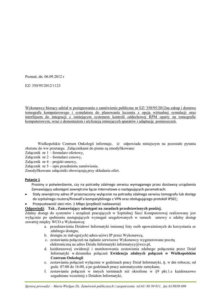 Poznań, dn. 06.09.2012 r EZ/ 350/95/2012/1123 Wykonawcy biorący udział w postępowaniu o zamówienie publiczne nr EZ/ 350/95/2012na zakup i dostawę tomografu komputerowego i symulatora do planowania leczenia z opcją wirtualnej symulacji oraz interfejsem do integracji z istniejącym systemem kontroli oddechowej RPM oparty na tomografie komputerowym, wraz z demontażem i utylizacją istniejących aparatów i adaptacją pomieszczeń. Wielkopolskie Centrum Onkologii informuje, iż odpowiada niniejszym na pozostałe pytania złożone do ww przetargu. Załącznikami do pisma są zmodyfikowane: Załącznik nr 1 – formularz ofertowy, Załącznik nr 2 – formularz cenowy, Załącznik nr 4 – projekt umowy, Załącznik nr 5 – opis przedmiotu zamówienia. Zmodyfikowane załączniki obowiązują przy składaniu ofert. Pytanie 1 Prosimy o potwierdzenie, czy na potrzeby zdalnego serwisu wymaganego przez dostawcę urządzenia Zamawiający udostępni zewnętrzne łącze internetowe o następujących parametrach: Stały zewnętrzny adres IP przeznaczony wyłącznie na potrzeby zdalnego serwisu tomografu lub dostęp do szpitalnego routera/firewall’a kompatybilnego z VPN oraz obsługującego protokół IPSEC; Przepustowość sieci min. 1 Mbps (prędkość nadawania) Odpowiedź: Tak , Zamawiający udostępni na zasadach przedstawionych poniżej. Zdalny dostęp do systemów i urządzeń pracujących w Szpitalnej Sieci Komputerowej realizowany jest wyłącznie po spełnieniu następujących wymagań uregulowanych w ramach umowy o zdalny dostęp zawartej między WCO a Wykonawcą: a. przedstawieniu Działowi Informatyki imiennej listy osób upoważnionych do korzystania ze zdalnego dostępu, b. dostępu ze stał-ego(ych) adres-u(ów) IP przez Wykonawcę, c. zestawianiu połączeń na żądanie serwisowe Wykonawcy wygenerowane pocztą elektroniczną na adres Działu Informatyki [email protected], d. każdorazowej ewidencji i monitorowania zestawienia zdalnego połączenia przez Dział Informatyki w dzienniku połączeń Ewidencja zdalnych połączeń w Wielkopolskim Centrum Onkologii e. zestawianiu połączeń wyłącznie w godzinach pracy Dział Informatyki, tj. w dni robocze, od godz. 07:00 do 16:00, a po godzinach pracy automatycznie zamykane, f. zestawianiu połączeń w innych terminach niż określone w §9 pkt.1.e każdorazowo uzgadniane wcześniej z Działem Informatyki, Sprawę prowadzi – Maria Wielgus Dz. Zamówień publicznych i zaopatrzenia tel.61/ 88 50 911, fax 61/8850 698 Ponieważ na urządzeniach będących przedmiotem zamówienia przetwarzane są dane osobowe to oprócz powyższych wymagań w umowie o zdalny dostęp zawarte są klauzule dotyczące powierzenia przetwarzania danych osobowych określane przez Administratora Bezpieczeństwa Systemów Informatycznych: Dane osobowe przetwarzane będą przez Wykonawcę wyłącznie w zakresie i celu niezbędnym do należytego wykonania przez Wykonawcę zleceń serwisowych Przez przetwarzanie danych osobowych rozumie się czynności, o których mowa w art. 7 pkt. 2 UODO. Wykonawca zobowiązany jest do przestrzegania przepisów UODO oraz przepisów wykonawczych do tej ustawy i ponosi odpowiedzialność za przetwarzanie danych osobowych niezgodnie z powyższymi przepisami oraz niniejszą ustawą. Przed rozpoczęciem przetwarzania danych osobowych, Wykonawca jest zobowiązany podjąć środki zabezpieczające zbiór danych, o których mowa w art. 36-39 UODO, oraz spełnić wymagania określone w przepisach, o których mowa w art. 39a. W zakresie tych przepisów Wykonawca ponosi odpowiedzialność jak Administrator Danych Osobowych. Wykonawca zapewnia, że system informatyczny, w którym będą przetwarzane dane osobowe spełnia wymagania określone w Rozporządzeniu Ministra Spraw Wewnętrznych z dnia 29 kwietnia 2004 r. w sprawie dokumentacji przetwarzania danych osobowych oraz warunków technicznych i organizacyjnych, jakim powinny odpowiadać urządzenia i systemy informatyczne służące do przetwarzania danych osobowych (Dz. U. 2004 r. Nr 100, poz. 1024). Administrator Bezpieczeństwa Systemów Informatycznych (ABSI) na piśmie upoważnia pracowników firm serwisujących do przetwarzania danych osobowych oraz zobowiązuje do zachowania w tajemnicy pozyskanych danych. Fakt upoważnienia odnotowuje w Ewidencji osób upoważnionych do przetwarzania danych osobowych. Upoważnienia do przetwarzania danych osobowych oraz zobowiązania do zachowania w tajemnicy pozyskanych danych dla osób przetwarzających dane osobowe u Wykonawcy wydaje ABSI Zamawiającego w postaci papierowej w dwóch egzemplarzach, po jednym egzemplarzu dla każdej strony. Wzór umowy wraz z załącznikami (upoważnienia do przetwarzania danych osobowych oraz zobowiązania do zachowania w tajemnicy pozyskanych danych dla osób przetwarzających dane osobowe) w oddzielnym pliku na stronie internetowej. Wobec powyższego Zamawiający udostępni własne łącze internetowe o parametrach: Dostęp do szpitalnego routera/firewall’a kompatybilnego z VPN oraz obsługującego protokół IPSEC; Przepustowość sieci min. 1 Mbps (prędkość nadawania) Wyłącznie po spełnieniu powyższych wymagań (podpisanie i realizacja postanowień zawartych w umowie). Pytanie 2 Dotyczy Załącznika Nr. 5 „Opis Przedmiotu Zamówienia”. W założeniach informatycznych do uwzględnienia, w rozdziale 7, podrozdziale „a”, podpunkt „(9)” Zamawiający wymaga zapewnienia 25 letniej gwarancji na wykonaną sieć. Zwracamy uwagę, iż jest to niewykonalne, z uwagi na fakt, iż zgodnie z obowiązującymi przepisami istnieje konieczność zapewnienia części zamiennych przez 10 lat od daty zakupu materiałów. Zatem nikt z dostawców okablowania sieci logicznej nie jest w stanie zapewnić 25-letniego okresu gwarancyjnego. Zwracamy się zatem z prośbą o zmianę okresu gwarancyjnego na zainstalowaną sieć na identyczny jak dla tomografu komputerowego, czyli 36 miesięcy. Odpowiedź : Zamawia