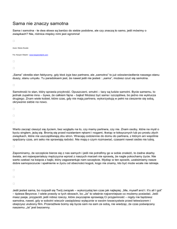 Sama nie znaczy samotna Sama i samotna - te dwa słowa są bardzo do siebie podobne, ale czy znaczą to samo, jeśli mówimy o związkach? Nie, różnica między nimi jest ogromna! Autor: Marta Siudak Fot. Kacper Olejnik - www.kacperolejnik.com „Sama” określa stan faktyczny, gdy ktoś żyje bez partnera, ale „samotna” to już odzwierciedlenie naszego stanu duszy, stanu umysłu. Tu paradoksem jest, że nawet jeśli nie jesteś „sama”, możesz czuć się samotna. Samotność to stan, który sprawia przykrość. Opuszczeni, smutni – tacy są ludzie samotni. Bycie samemu, to jednak zupełnie inna – bywa, że całkiem fajna – bajka! Możesz być sama i szczęśliwa, bo jedno nie wyklucza drugiego. Znam wiele kobiet, które czas, gdy nie mają partnera, wykorzystują w pełni na cieszenie się sobą, okrywanie siebie na nowo. Warto zacząć cieszyć się życiem, bez względu na to, czy mamy partnera, czy nie. Znam osoby, które na myśl o byciu singlem, jeżą się. Bronią się przed rozstaniem rękami i nogami, tkwiąc w toksycznych lub po prostu złych związkach, które nie uszczęśliwiają obu stron. Wracają codziennie do domu do partnera, z którym ani wspólnie spędzany czas, ani seks nie sprawiają radości. Nie mają o czym rozmawiać, czasami nawet siebie nie lubią. Zapominamy, że szczęście bierze się z nas samych i jeśli nie potrafimy go w sobie znaleźć, to żadne skarby świata, ani najwspanialszy mężczyzna wprost z naszych marzeń nie sprawią, że nagle pokochamy życie. Nie warto czekać na księcia z bajki, który zagwarantuje nam szczęście. Myśląc w ten sposób, uzależniamy nasze dobre samopoczucie i spełnienie w życiu od obecności kogoś, kogo nie znamy, kto być może wcale nie istnieje. Jeśli jesteś sama, bo rozpadł się Twój związek – wykorzystaj ten czas jak najlepiej. „Me, myself and I. It’s all I got” – śpiewa Beyonce. I wiele prawdy w tych słowach, bo „Ja” to właśnie najcenniejsze co możemy posiadać. Jeśli masz pasje, przyjaciół, jeśli robisz rzeczy, które zwyczajnie sprawiają Ci przyjemność – nigdy nie będziesz samotna, nawet, gdy w sobotni wieczór zasiądziesz wyłącznie w swoim towarzystwie przed telewizorem i obejrzysz ulubiony film. Przeraźliwie boimy się bycia sam na sam ze sobą, nie wiedząc, że czas poświęcany naszemu „Ja” jest bezcenny. Gdy lubisz siebie, nie będą Ci straszne ani kontakty z innymi ludźmi, ani momenty, gdy zostajesz sama ze sobą. To ważny czas – w którym możesz robić, co tylko dusza zapragnie, nie tłumacząc się nikomu. Warto polubić i pokochać siebie, bo w końcu „Ja” jest moim najwierniejszym towarzyszem. To właśnie najczęściej wtedy, gdy jesteśmy same możemy pozwolić sobie na zupełny luz w zachowaniu i ubiorze. Możemy śpiewać pod nosem, mówić do siebie, albo – co też ważne – zwyczajnie milczeć bez zażenowania. Będąc singielką, możesz poświęcić więcej czasu na swój rozwój, swoje przyjemności. Odkryjesz nową jakość życia, gdy spostrzeżesz, że bycie samą, nie jest takie straszne. Większość z nas marzy o wspaniałym partnerze, ale nie warto od jego bycia lub nie-bycia uzależniać tego, czy będziemy szczęśliwe, czy nie. Bo drugi człowiek nigdy nie jest gwarancją szczęścia, jeśli nie wypływa ono z nas samych. Otwarcie się na świat, na ludzi, czerpanie radości z każdego dnia – oto najlepsza droga do bycia szczęśliwym samym, ale nie samotnym człowiekiem. A stąd już tylko krok do poznania wspaniałego partnera, który – tak jak my – kocha życie.