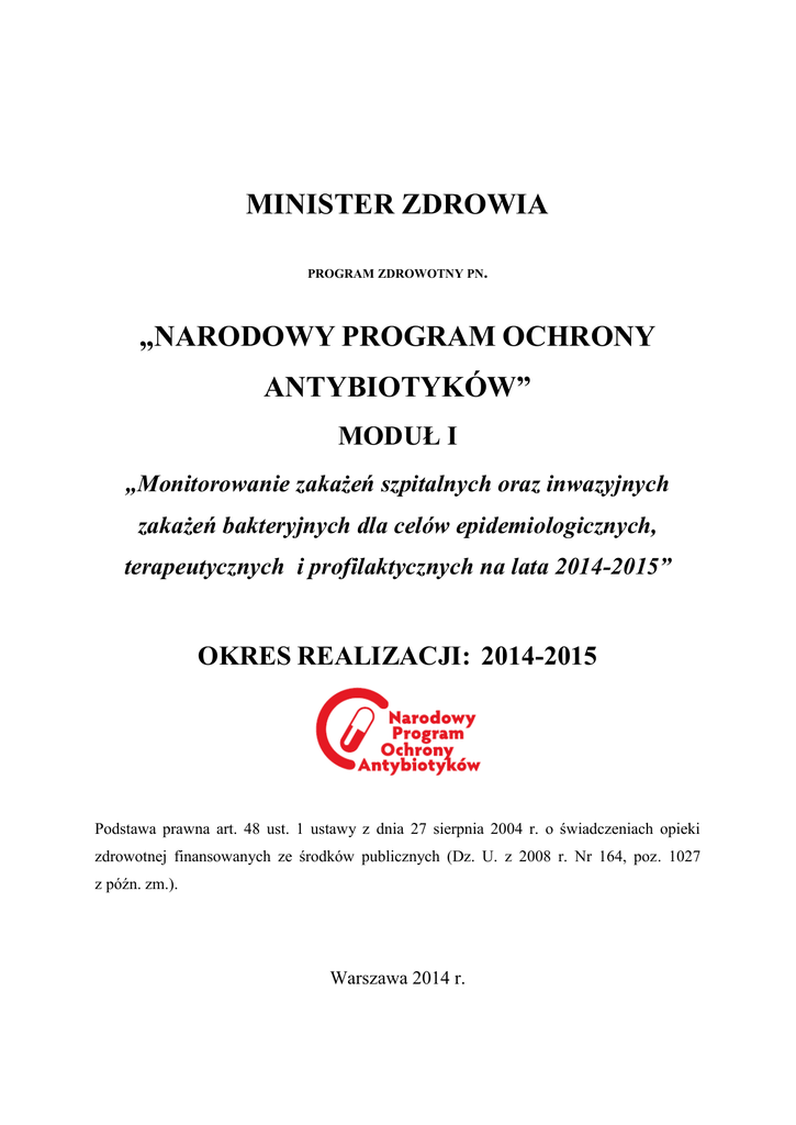 MINISTER ZDROWIA PROGRAM ZDROWOTNY PN. „NARODOWY PROGRAM OCHRONY ANTYBIOTYKÓW” MODUŁ I „Monitorowanie zakażeń szpitalnych oraz inwazyjnych zakażeń bakteryjnych dla celów epidemiologicznych, terapeutycznych i profilaktycznych na lata 2014-2015” OKRES REALIZACJI: 2014-2015 Podstawa prawna art. 48 ust. 1 ustawy z dnia 27 sierpnia 2004 r. o świadczeniach opieki zdrowotnej finansowanych ze środków publicznych (Dz. U. z 2008 r. Nr 164, poz. 1027 z późn. zm.). Warszawa 2014 r. Lista ważniejszych skrótów użytych w tekście (w porządku alfabetycznym): BINet Ogólnopolska Sieć Monitorowania Inwazyjnych Zakażeń Bakteryjnych nabytych poza szpitalem MZ Ministerstwo Zdrowia BLNAR -laktamazo-ujemny ampicylino-oporny (ang. -lactamase-negative ampicillin resistant) CFR wskaźnik śmiertelności (ang. case fatality ratio) EBM medycyna oparta na dowodach naukowych (ang. evidence based medicine) ECDC Europejskie Centrum Kontroli i Prewencji Chorób (ang. European Centre for Disease Control and Prevention) EMGM Europejskie Towarzystwo ds. Choroby Meningokokowej (ang. European Meningococcal Disease Society) EUCAST Europejski Komitet ds. Oznaczania Lekowrażliwości (ang. European Committee on Antimicrobial Susceptibility Testing) EARS-Net Europejska Sieć Monitorowania Lekooporności istotnych dla zdrowia publicznego bakteryjnych patogenów alarmowych Hib Haemophilus influenzae typu b IBD-Lab net Europejska Sieć Laboratoriów Referencyjnych ds. Bakteryjnych Zakażeń Inwazyjnych (ang. Laboratory Surveillance and External Quality Assurance in invasive bacterial diseases in EU) IChM Inwazyjna Choroba Meningokokowa (zapalenie opon mózgowordzeniowych, bakteriemia/sepsa) IChP Inwazyjna Choroba Pneumokokowa (zapalenie opon mózgowordzeniowych, bakteriemia/sepsa, zapalenie płuc z bakteriemią) KORLD Krajowy Ośrodek Referencyjny ds. Lekowrażliwości Drobnoustrojów KOROUN Krajowy Ośrodek Referencyjny ds. Diagnostyki Bakteryjnych Zakażeń Ośrodkowego Układu Nerwowego 2 MDR izolaty wielolekooporne, oporne lub średniowrażliwe na co najmniej 3 klasy antybiotyków (ang. multidrug-resistant) MIKROBANK Specjalne Urządzenie Badawcze (SpUB) NIZP-PZH Narodowy Instytut Zdrowia Publicznego – Państwowy Zakład Higieny NPOA Narodowy Program Ochrony Antybiotyków NTHI nietypujący się, nieotoczkowy izolat Haemophilus influenzae (ang. nontypeable Haemophilus influenzae) OIT oddział intensywnej terapii PCR łańcuchowa reakcja polimerazy (ang. polymerase chain reaction) PCV10 10-walentna koniugowana szczepionka przeciw Streptococcus pneumoniae PCV13 13-walentna koniugowana szczepionka przeciw Streptococcus pneumoniae POLMIKRO Centralny Ośrodek Badań Jakości w Diagnostyce Mikrobiologicznej PSO Program Szczepień Ochronnych UE Unia Europejska WHO Światowa Organizacja Zdrowia ZOMR zapalenie opon mózgowo-rdzeniowych 3 I. STRESZCZENIE 1) Skrótowy opis celów i podstawowych elementów programu. Zakażenia związane z opieką zdrowotną i inwazyjne pozaszpitalne, ze względu na ciężkość i konsekwencje zawsze leczone w szpitalu, stanowią poważny problem diagnostyczny, terapeutyczny i profilaktyczny, a w przypadku niektórych drobnoustrojów również zagrożenie epidemiczne. Są przyczyną wysokiej śmiertelności i dużej liczby nieodwracalnych powikłań. Na to złe rokowanie znacząco wpływa narastająca oporność patogenów bakteryjnych na antybiotyki. Głównym celem Programu jest poprawa bezpieczeństwa pacjentów w zakresie zakażeń związanych z opieką zdrowotną, inwazyjnych zakażeń bakteryjnych, terapii antybiotykowej i profilaktyki poprzez podjęcie skoordynowanych działań zgodnych z rekomendacjami Unii Europejskiej zmierzających do ograniczenia zakażeń związanych z opieką zdrowotną i oporności na antybiotyki, a także rozpoznawania etiologii i epidemiologii bakteryjnych zakażeń inwazyjnych zwłaszcza tych, którym można zapobiegać poprzez szczepienia, co jest niezwykle istotne także w aspekcie zdrowia publicznego każdego kraju. Program kontynuuje wdrażanie zasad szpitalnej polityki antybiotykowej w kolejnych szpitalach. Ponadto buduje podstawy wystandaryzowanego monitorowania bakteryjnych zakażeń inwazyjnych komplementarnego do sieci funkcjonujących w krajach Unii Europejskiej. Efektem Programu będzie wypracowanie w kolejnych szpitalach umiejętności prowadzenia monitorowania zakażeń związanych z opieką zdrowotną wywoływanych przez patogeny alarmowe (wielooporne). Pozwoli on także mieć ciągły wgląd w sytuację epidemiologiczną najważniejszych bakteryjnych zakażeń inwazyjnych. To z kolei umożliwi podejmowanie szybkich ukierunkowanych interwencji zmierzających do ograniczenia szerzenia się najbardziej niebezpiecznych infekcji i uniknięcia ich epidemicznego rozprzestrzeniania się. 4 2) Określenie wysokości środków niezbędnych na realizację programu, w tym środków z budżetu Ministerstwa Zdrowia, w kolejnych latach jego realizacji. Wysokość planowanych środków finansowych z budżetu Ministra Zdrowia na kolejne lata: Planowane środki w zł* (wydatki bieżące) 2014 817.260,00 2015 836.500,00 * Szacunkowa wysokość środków w kolejnych latach została uwzględniona w oparciu o wskaźnik inflacji ustalony na 2014 r. w wysokości 2,4%. Wysokość środków w latach 2014-2015 może ulec zmianie, gdyż budżet na programy zdrowotne finansowane z rozdziału 85149-Programy Polityki Zdrowotnej planowany jest na okres jednego roku. Wobec powyższego wysokość środków finansowych przewidzianych do wydatkowania w ramach programu w latach 2014-2015 jest uzależniona od corocznych decyzji Kierownictwa Ministerstwa Zdrowia. 3) Spodziewane efekty i korzyści wynikające z potencjalnego wdrożenia programu, w tym określenie głównych mierzalnych/niemierzalnych korzyści i kosztów Wdrożenie Programu, poprzez wzmocnienie systemów monitorowania zakażeń związanych z opieką zdrowotną i inwazyjnych zakażeń bakteryjnych przyc
