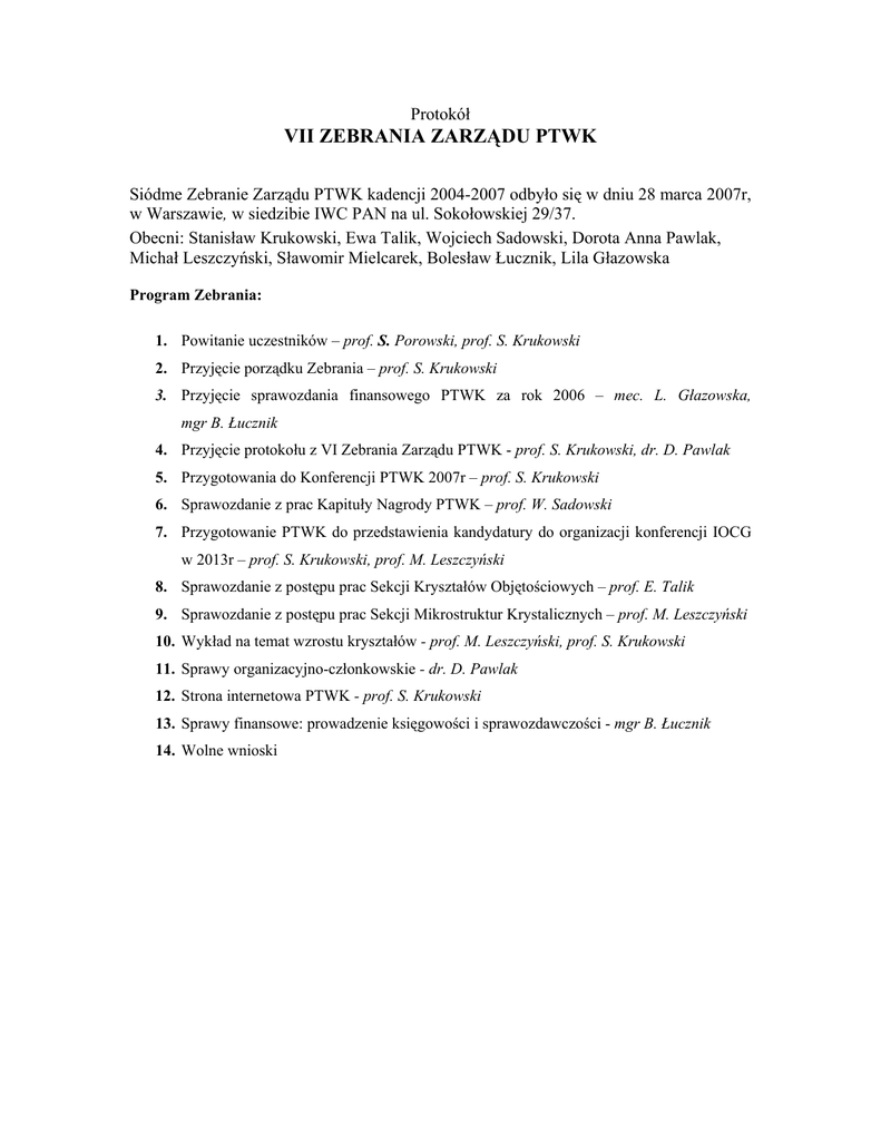 Protokół VII ZEBRANIA ZARZĄDU PTWK Siódme Zebranie Zarządu PTWK kadencji 2004-2007 odbyło się w dniu 28 marca 2007r, w Warszawie, w siedzibie IWC PAN na ul. Sokołowskiej 29/37. Obecni: Stanisław Krukowski, Ewa Talik, Wojciech Sadowski, Dorota Anna Pawlak, Michał Leszczyński, Sławomir Mielcarek, Bolesław Łucznik, Lila Głazowska Program Zebrania: 1. Powitanie uczestników – prof. S. Porowski, prof. S. Krukowski 2. Przyjęcie porządku Zebrania – prof. S. Krukowski 3. Przyjęcie sprawozdania finansowego PTWK za rok 2006 – mec. L. Głazowska, mgr B. Łucznik 4. Przyjęcie protokołu z VI Zebrania Zarządu PTWK - prof. S. Krukowski, dr. D. Pawlak 5. Przygotowania do Konferencji PTWK 2007r – prof. S. Krukowski 6. Sprawozdanie z prac Kapituły Nagrody PTWK – prof. W. Sadowski 7. Przygotowanie PTWK do przedstawienia kandydatury do organizacji konferencji IOCG w 2013r – prof. S. Krukowski, prof. M. Leszczyński 8. Sprawozdanie z postępu prac Sekcji Kryształów Objętościowych – prof. E. Talik 9. Sprawozdanie z postępu prac Sekcji Mikrostruktur Krystalicznych – prof. M. Leszczyński 10. Wykład na temat wzrostu kryształów - prof. M. Leszczyński, prof. S. Krukowski 11. Sprawy organizacyjno-członkowskie - dr. D. Pawlak 12. Strona internetowa PTWK - prof. S. Krukowski 13. Sprawy finansowe: prowadzenie księgowości i sprawozdawczości - mgr B. Łucznik 14. Wolne wnioski Ad. 1 Powitanie uczestników Uczestników zebrania powitał Prof. Porowski. Ad. 2. Przyjęcie porządku Zebrania Nie było uwag do porządku zebrania. Porządek zebrania został przyjęty. Ad. 3. Przyjęcie sprawozdania finansowego PTWK za rok 2006 Mgr B. Łucznik omówił wydatki PTWK w 2006 r. Jedyny duży wydatek to konferencja w Berlinie w 2006 r. PTWK sfinansowało podróże na konferencję w Berlinie studentów oraz pracowników naukowych, członków PTWK. Mec. L. Głazowska omówiła stan konta PTWK. W dniu 01.01.2006 na koncie bankowym PTWK było 23.142 zł. Tytułem składek w 2006 r. wpłynęło 2245 zł, koszty w 2006 r. wyniosły 3447 zł. PTWK nie ma żadnych zobowiązań. Wszystkie zobowiązania załatwiane są na bieżąco. W głosowaniu jawnym przyjęto sprawozdanie finansowe jednogłośnie. Ad. 4. Przyjęcie protokołu z VI Zebrania Zarządu PTWK Omówiono uwagi dotyczące protokółu z VI Zebrania Zarządu PTWK. Prof. Talik wprowadziła drobne poprawki do protokołu. W głosowaniu jawnym przyjęto protokół jednogłośnie. Prof. Krukowski podziękował dr Pawlak za protokółowanie. Ad. 5. Przygotowania do Konferencji PTWK 2007r Prof. Krukowski zdał relacje z przygotowań do konferencji w Zakopanem 2007. Obecnie przyjęte zostały wszystkie abstrakty. Przyjęto 180 abstraktów. Będzie 145 prezentacji posterowych, 16 prezentacji ustnych oraz 24 prezentacje zaproszone. Prof. Daniel Vivien zostanie wykreślony z listy zaproszonych wykładowców bo nie ma z nim kontaktu. W ramach jednodniowego workshopu Polsko-Japońsko-Niemieckiego PTWK dziękuje Prof. Fukudzie za zaproszenie przedstawicieli przodujących ośrodków. Zdecydowano, aby umieścić na stronie konferencji informację o tym, że workshop będzie bardzo ważnym wydarzeniem, żeby wszyscy uczestnicy konferencji na nim zostali. Ponadto zebrani zaakceptowali propozycję, aby wysłać informacje do wszystkich, którzy się zarejestrowali na konferencji a nie zarejestrowali na workshopie. Prof. Krukowski omówił problemy związane z konferencją np. późna rejestracja uczestników, konieczność rzeczywistego zamknięcia rejestracji na konferencję do 20 kwietnia, aby wiadomo było ile jest dokładnie uczestników konferencji. Przedyskutowano ewentualne możliwości korzystania z Internetu w Zakopanem. PTWK zapewni trzy komputery z dostępem do Internetu, ewentualnie gdyby była taka możliwość można opłacić na te kilka dni dostęp bezprzewodowy. Zdecydowano, że ostatnie zebranie Zarządu odbędzie się w niedzielę 20 maja 2007 r. o godz. 18-tej w WZW Zakopane. Ad. 6. Sprawozdanie z prac Kapituły Nagrody PTWK Prof. Sadowski poinformował, że wpłynęła jedna praca doktorska na konkurs prac doktorskich o nagrodę PTWK. Zebrani wyrazili opinię, że ten stan jest niezadowalający, gdyż nie ma żadnej możliwości oceny prac przez Kapitułę Nagród PTWK. W związku z tym prof. Sadowski zaproponował, aby przedłużyć termin składania prac doktorskich. Wobec braku głosów sprzeciwu Zarząd zadecydował, że należy przedłużyć termin, do którego można składać prace doktorskie. Powinna być złożona wersja papierowa oraz plik elektroniczny. Prof. Krukowski przypomniał, że konkurs prac doktorskich powinien być bardziej rozreklamowany. Prof. Sadowski zaproponował umieszczenie prac konkursowych na stronie PTWK. W tej sprawie Zarząd nie podjął żadnej decyzji, pozostawiając ja do rozważenia Zarządowi w przyszłej kadencji. Ad. 7. Przygotowanie PTWK do przedstawienia kandydatury do organizacji konferencji IOCG w 2013r Prof. Krukowski oraz Prof. Leszczyński zreferowali przygotowania do przedstawienia kandydatury PTWK do organizacji IOCG w 2013 r. Między innymi wystąpiono o dofinansowania na przygotowanie konferencji do Ministra Prof. K. J. Kurzydłowskiego. Ad. 8. Sprawozdanie z postępu prac Sekcji Kryształów Objętościowych Prof. Talik zreferowała działalność Sekcji Kryształów Objętościowych. W dniach 14-16 marca 2007 odbyły się dni Wydziału Fizyki Uniwersytetu Śląskiego w ramach, których został wygłoszony wykład pt. ”Polski wkład w rozwój nowoczesnej elektroniki”. Wykład odbył się pod patronatem PTWK, wykorzystano w nim materiały ze strony internetowej PTWK. Ad. 9. Sprawozdanie z postępu prac Sekcji Mikrostruktur Krystalicznych Prof. Leszczyński poinformował, że w ITME pojawiło się nowe urządzenie MOCVD, a u Prof. Bugajskiego w ITE, nowe urządzenie MBE. Prof. Leszczyński poprosił dr Pawlak o przesłanie informacji na temat nowego urządzenia w ITME. Ad. 10