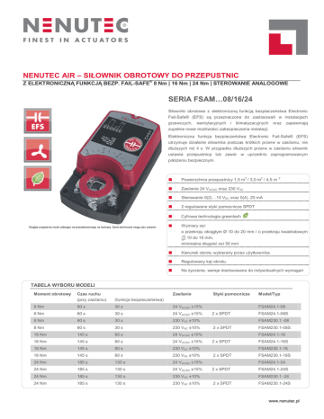 NENUTEC AIR – SIŁOWNIK OBROTOWY DO PRZEPUSTNIC Z ELEKTRONICZNĄ FUNKCJĄ BEZP. FAIL-SAFE® 8 Nm | 16 Nm | 24 Nm | STEROWANIE ANALOGOWE SERIA FSAM…08/16/24 Siłowniki obrotowe z elektroniczną funkcją bezpieczeństwa Electronic Fail-Safe® (EFS) są przeznaczone do zastosowań w instalacjach grzewczych, wentylacyjnych i klimatyzacyjnych oraz zupełnie nowe możliwości zabezpieczenia instalacji. zapewniają Elektroniczna funkcja bezpieczeństwa Electronic Fail-Safe® (EFS) utrzymuje działanie siłownika podczas krótkich przerw w zasilaniu, nie dłuższych niż 4 s. W przypadku dłuższych przerw w zasilaniu siłownik ustawia przepustnicę lub zawór w uprzednio zaprogramowanym położeniu bezpiecznym. Wygląd urządzenia może odbiegać od przedstawionego na ilustracji. Dane techniczne mogą ulec zmianie. ■ ■ ■ ■ Powierzchnia przepustnicy 1,5 m / 3,0 m / 4,5 m ■ Cyfrowa technologia greentech ■ Wymiary osi: 2 2 2 Zasilanie 24 V AC/DC oraz 230 VAC Sterowanie 0(2)…10 VDC oraz 0(4)..20 mA 2 regulowane styki pomocnicze SPDT o przekroju okrągłym Ø 10 do 20 mm / o przekroju kwadratowym 10 do 16 mm, minimalna długość osi 50 mm ■ ■ ■ Kierunek obrotu wybierany przez użytkownika. Regulowany kąt obrotu. Na życzenie, wersje dostosowane do indywidualnych wymagań TABELA WYBORU MODELI Moment obrotowy Czas ruchu (przy zasilaniu) (funkcja bezpieczeństwa) Zasilanie 8 Nm 60 s 30 s 24 VAC/DC ±15% 8 Nm 60 s 30 s 24 VAC/DC ±15% 8 Nm 60 s 30 s 230 VAC ±10% 8 Nm 60 s 30 s 230 VAC ±10% 16 Nm 145 s 80 s 24 VAC/DC ±15% 16 Nm 145 s 80 s 24 VAC/DC ±15% 16 Nm 145 s 80 s 230 VAC ±10% 16 Nm 145 s 80 s 230 VAC ±10% 24 Nm 185 s 130 s 24 VAC/DC ±15% 24 Nm 185 s 130 s 24 VAC/DC ±15% 24 Nm 185 s 130 s 230 V AC ±10% 24 Nm 185 s 130 s 230 VAC ±10% Styki pomocnicze Model/Typ FSAM24.1-08 2 x SPDT FSAM24.1-08S FSAM230.1 -08 2 x SPDT FSAM230.1-08S FSAM24.1-16 2 x SPDT FSAM24.1-16S FSAM230.1-16 2 x SPDT FSAM230.1-16S FSAM24.1-24 2 x SPDT FSAM24.1-24S FSAM230.1 -24 2 x SPDT FSAM230.1-24S www.nenutec.pl NENUTEC AIR – SIŁOWNIK OBROTOWY DO PRZEPUSTNIC Z ELEKTRONICZNĄ FUNKCJĄ BEZP. FAIL-SAFE® 8 Nm | 16 Nm | 24 Nm | STEROWANIE ANALOGOWE WYMIARY SIŁOWNIKA [mm] DANE TECHNICZNE FSAM24.1...(S) Moment obrotowy FSAM230.1...(S) 8 Nm / 16 Nm / 24 Nm 2 2 8 Nm / 16 Nm / 24 Nm 2 2 2 1,5 m / 3,0 m / 4,5 m 2 Wielkość przepustnicy 1,5 m / 3,0 m / 4,5 m Wymiary osi okrągła Ø 10 do 20 mm / kwadratowa Zasilanie 24V AC/DC ±15% 230 VAC ±10% Częstotliwość 50 - 60 Hz 50 - 60 Hz Sygnał nastawczy (wejście) 0(2)...10 VDC lub 0(4)...20 mA 0(2)...10 VDC lub 0(4)...20 mA Sygnał położenia (wyjście) 0...10 VDC 0…10 VDC – Praca 3,6 W 3,6 W – W pozycji krańcowej 0,5 W 0,5 W Moc znamionowa 6,5 VA 6,5 VA Obciążalność styku pomocniczego 1,5 A / 230 VAC 1,5 A / 230 VAC Klasa ochrony III II Kąt obrotu 30 s 30 s Ograniczenie kąta obrotu 0°...90° (ograniczenie mechaniczne 93°) 0°...90° (ograniczenie mechaniczne 93°) Masa 0°...90° z krokiem 5° 0°...90° z krokiem 5° Żywotność 1,2 kg - 1,4 kg 1,3 kg - 1,5 kg Poziom ciśnienia akustycznego 100000 pełnych cykli / 1000000 cykli częściowych 100000 pełnych cykli / 1000000 cykli częściowych Kategoria ochronna obudowy 42 dB (A) 42 dB (A) Zakres temperatur pracy IP 54 (ochrona przed kurzem i zachlapaniem wodą) IP 54 (ochrona przed kurzem i zachlapaniem wodą) Temperatura składowania -30...+50°C / IEC 721-3-3 -30°...+50°C / IEC 721-3-3 Wilgotność otoczenia -40°...+80°C/IEC 721-3-2 -40°...+80°C/IEC 721-3-2 Konserwacja 5%...95% wilg. wzgl. (brak kondensacji) / EN 60730-1 5%...95% wilg. wzgl. (brak kondensacji) / EN 60730-1 Zasada działania Bezobsługowe Bezobsługowe Kompatybilność elektromagnetyczna Typ 1 wg EN 60730-1 Typ 1 wg EN 60730-1 CE zgodnie z 2004/108/EWG CE zgodnie z 2004/108/EWG 10 do 16 mm okrągła Ø 10 do 20 mm / kwadratowa 10 do 16 mm Pobór mocy www.nenutec.pl NENUTEC AIR – SIŁOWNIK OBROTOWY DO PRZEPUSTNIC Z ELEKTRONICZNĄ FUNKCJĄ BEZP. FAIL-SAFE® 8 Nm | 16 Nm | 24 Nm | STEROWANIE ANALOGOWE Schemat połączeń FSAM24.1…(S) Zasilanie 24 V AC / DC ■ Zmienianie kierunku obrotu siłownika FSAM24.1/230.1…(S) Ustawienie fabryczne – obrót w prawo! Kierunek obrotu siłownika można zmieniać wciskając mikroprzełącznik SW1 na 1 do 2 s. Kierunek obrotu jest sygnalizowany sekwencją mignięć zielonej diody LED. PRAWO LEWO 24 V AC ±15% 24 VDC ±15% 0(4)..0,20 mA 0(2)…10 VDC 0…10 VDC Podłączać poprzez transformator bezpieczeństwa ■ Schemat połączeń FSAM230.1…(S) Zasilanie 230 VAC Specyfikacja sygnału nastawczego Sygnał nastawczy Y1 0(2)…10 V DC Rezystancja wejściowa Ri 100 ■ Sygnał nastawczy Y2 0(4)…20 mA Rezystancja wejściowa Ri 500 Sygnał położenia U 0 ... 10 VDC Rezystancja obciążenia Ri > 50 Wybieranie zakresu sygnału nastawczego FSAM 24.1/230.1…(S) Ustawienie fabryczne: 0-10 V / 0-20 mA Sygnał nastawczy można zmieniać wciskając mikroprzełącznik SW2 na 1 do 2 s. Zakres sygnału nastawczego jest sygnalizowany sekwencją mignięć czerwonej diody LED. 230 VAC ±10% 0-10V /0-20 mA 0(2)…10 VDC 0(4)...20 mA 2-10V /4-20 mA 0…10 VDC V+ tylko do przestawiania ręcznego Schemat połączeń styków pomocniczych ■ Zmienianie sygnału nastawczego Siłownik FSAM230.1...(S) może być sterowany sygnałem prądowym albo napięciowym. Rodzaj sygnału można wybierać zworą. Ustawienie fabryczne: położenie A (napięcie) ■ Regulowanie styków pomocniczych Przełącznik a jest fabrycznie ustawiony w pozycji 10º. Przełącznik b jest fabrycznie ustawiony w pozycji 80º. Zwora w położeniu A: sygnał napięciowy, wejście Y1 Zwora w położeniu B: sygnał prądowy, wejście Y2 (typ FSAM230.1...(S)) 1,5 A / 230 VAC Styki pomocnicze można regulować odpowiednio do potrzeb w zakresie 0°...90°. (typ FSAM24.1/230.1…(S)) Schemat połączeń FSAM24.1…(S) Schemat połączeń FSAM230.1…(S) Połączenie równoległe Połączenie równoległe Urządzenie podrzęd