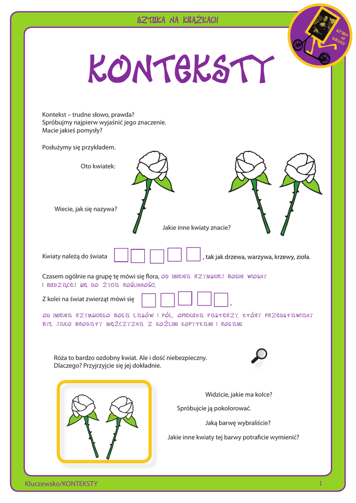 SZTUKA NA KRĄŻKACH KONTEKSTY Kontekst – trudne słowo, prawda? Spróbujmy najpierw wyjaśnić jego znaczenie. Macie jakieś pomysły? Posłużymy się przykładem. Oto kwiatek: Wiecie, jak się nazywa? Jakie inne kwiaty znacie? Kwiaty należą do świata Czasem ogólnie na grupę tę mówi się flora, od imienia rzymskiej bogini wiosny i budzącej się do życia roślinności. Z kolei na świat zwierząt mówi się , od imienia rzymskiego boga lasów i pól, opiekuna pasterzy, który przedstawiany był jako brodaty mężczyzna z koźlimi kopytkami i rogami. Róża to bardzo ozdobny kwiat. Ale i dość niebezpieczny. Dlaczego? Przyjrzyjcie się jej dokładnie. Widzicie, jakie ma kolce? Spróbujcie ją pokolorować. Jaką barwę wybraliście? Jakie inne kwiaty tej barwy potraficie wymienić? Kluczewsko/KONTEKSTY 1 SZTUKA NA KRĄŻKACH symbol? Wiecie, co to jest Popatrzcie jeszcze raz na swoją różę. Na podstawie jej wyglądu spróbujcie powiedzieć, czego może być symbolem. Jakie uczucia może wyrażać? Czerwona róża powszechnie uchodzi za symbol miłości. Jej kolce wyrażają czasem trudności, które prawdziwa miłość musi pokonać. ► ► Biała róża jest oznaką czystości. W chrześcijaństwie kwiat róży miał wiele znaczeń. Ze względu na krwisty kolor symbolizował męczeństwo, zwłaszcza Mękę Chrystusa. Płatki róży były znakiem pięciu ran Jezusa. Kwiat ten stał się także symbolem Matki Boskiej, którą nazywano „różą duchowną” lub „różą bez kolców”, czyli bez grzechów. ► Róże są także atrybutami czy św. Elżbiety Węgierskiej. ► * wielu świętych, np. św. Teresy od Dzieciątka Jezus Znakiem tym posługiwała się także szlachta, która umieszczała go w swoich herbach. W XV wieku w Anglii toczyła się tzw. wojna dwóch róż, w czasie której rywalizowały ze sobą rody Yorków i Lancasterów. Oba pieczętowały się herbem wyobrażającym różę, która różniła się jedynie barwą. Yorkowie posługiwali się różą białą, a Lancasterowie czerwoną. W Polsce kwiaty te występują np. w herbie Poraj czy Doliwa. ► Ale róża to nie tylko ozdobny kwiat, symbol, atrybut czy herb. Na pewno mieliście okazję jeść konfitury lub pączka z różą. Być może Wasze mamy na toaletkach mają wodę albo perfumy różane. Czytaliście Małego księcia? Pamiętacie, że wybranką jego serca była właśnie róża? A skoro mówimy już o literaturze, za parę lat koniecznie sięgnijcie po książkę Imię róży włoskiego pisarza Umberta Eco. Kluczewsko/KONTEKSTY 2 SZTUKA NA KRĄŻKACH Wiemy już sporo na temat róż. Zwróćcie uwagę, przedstawiliśmy ten kwiat. ► ► ► ► ► w jak wielu kontekstach Po pierwsze w kontekście innych roślin, po drugie – jego wyglądu, po trzecie – jego symboliki i znaczeń, po czwarte – różnorodnych zastosowań, np. w kuchni i kosmetyce, wreszcie w kontekście literackim. kontekst Nadszedł czas, abyśmy rozszyfrowali znaczenie słowa . wywodzi się ono od łacińskiego contextus i oznacza związek związek, łączność, zależność łączność zależność. używamy go, aby przedstawić jedną rzecz na tle innych, jedną sytuację w porównaniu z innymi, zależność jednych zjawisk od innych, jedną sprawę w zestawieniu z innymi. Tak naprawdę każde słowo, przedmiot, wydarzenie itd. możemy rozpatrywać w różnych kontekstach. W tej części Sztuki na krążkach spróbujemy zaprezentować różnych kontekstach zabytki w , które znajdują się w Waszych lub sąsiednich miejscowościach. Zrobimy to po to, aby dojrzeć związki między różnymi budynkami, obrazami i rzeźbami, wzajemne zależności między nimi i to, co je łączy. Na początku spróbujmy odpowiedzieć na pytanie: co to jest zabytek? Poniżej napiszcie, jakie macie skojarzenia z tym słowem, a potem posłuchajcie informacji na ten temat w naszej szafie dźwiękowej. …………………………………………………………………………… …………………………………………………………………………… …………………………………………………………………………… …………………………………………………………………………… Kluczewsko/KONTEKSTY 3 SZTUKA NA KRĄŻKACH A co to jest sztuka i dzieło sztuki? Kto zajmuje się ich tworzeniem? .......................................................................................... .......................................................................................... .......................................................................................... W jakich miejscach możemy oglądać dzieła sztuki? .......................................................................................... .......................................................................................... 1. ....................................................................................... 2. ...................................................................................... 3. ...................................................................................... 4. ...................................................................................... 5. ...................................................................................... Dzisiaj zabieramy Was na wycieczkę nie do muzeum, ale do kościoła pw. św. Wawrzyńca w Kluczewsku. * Stańcie na chwilę przed wejściem. To na co patrzycie, to fasada . Czym różni się kościół od innych budowli w okolicy? Wymieńcie przynajmniej pięć różnic. * W jakich muzeach byliście? Poniżej wpiszcie ich nazwy. FASADA elewacja budynku wyróżniona spośród pozostałych ścian odmienną kompozycją architektoniczną , zazwyczaj znajduje się w niej główne wejście. .......................................................................................... 1. ...............................................................