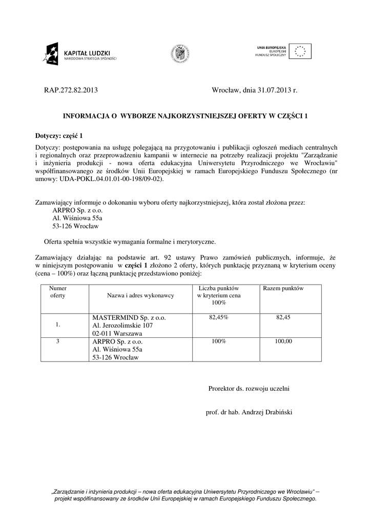 RAP.272.82.2013 Wrocław, dnia 31.07.2013 r. INFORMACJA O WYBORZE NAJKORZYSTNIEJSZEJ OFERTY W CZĘŚCI 1 Dotyczy: część 1 Dotyczy: postępowania na usługę polegającą na przygotowaniu i publikacji ogłoszeń mediach centralnych i regionalnych oraz przeprowadzeniu kampanii w internecie na potrzeby realizacji projektu "Zarządzanie i inżynieria produkcji - nowa oferta edukacyjna Uniwersytetu Przyrodniczego we Wrocławiu" współfinansowanego ze środków Unii Europejskiej w ramach Europejskiego Funduszu Społecznego (nr umowy: UDA-POKL.04.01.01-00-198/09-02). Zamawiający informuje o dokonaniu wyboru oferty najkorzystniejszej, która został złożona przez: ARPRO Sp. z o.o. Al. Wiśniowa 55a 53-126 Wrocław Oferta spełnia wszystkie wymagania formalne i merytoryczne. Zamawiający działając na podstawie art. 92 ustawy Prawo zamówień publicznych, informuje, że w niniejszym postępowaniu w części 1 złożono 2 oferty, których punktację przyznaną w kryterium oceny (cena – 100%) oraz łączną punktację przedstawiono poniżej: Numer oferty 1. 3 Nazwa i adres wykonawcy MASTERMIND Sp. z o.o. Al. Jerozolimskie 107 02-011 Warszawa ARPRO Sp. z o.o. Al. Wiśniowa 55a 53-126 Wrocław Liczba punktów w kryterium cena 100% Razem punktów 82,45% 82,45 100% 100,00 Prorektor ds. rozwoju uczelni prof. dr hab. Andrzej Drabiński „Zarządzanie i inżynieria produkcji – nowa oferta edukacyjna Uniwersytetu Przyrodniczego we Wrocławiu” – projekt współfinansowany ze środków Unii Europejskiej w ramach Europejskiego Funduszu Społecznego.