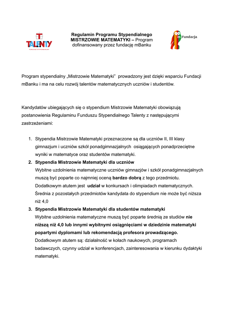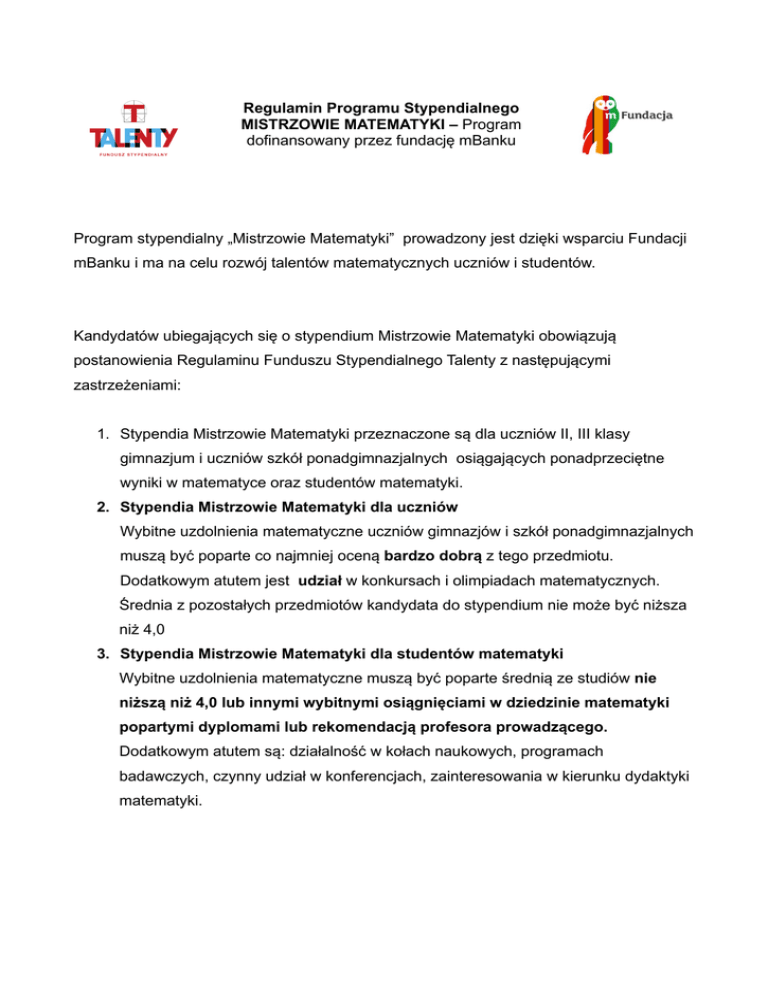 Regulamin Programu Stypendialnego MISTRZOWIE MATEMATYKI – Program dofinansowany przez fundację mBanku Program stypendialny „Mistrzowie Matematyki” prowadzony jest dzięki wsparciu Fundacji mBanku i ma na celu rozwój talentów matematycznych uczniów i studentów. Kandydatów ubiegających się o stypendium Mistrzowie Matematyki obowiązują postanowienia Regulaminu Funduszu Stypendialnego Talenty z następującymi zastrzeżeniami: 1. Stypendia Mistrzowie Matematyki przeznaczone są dla uczniów II, III klasy gimnazjum i uczniów szkół ponadgimnazjalnych osiągających ponadprzeciętne wyniki w matematyce oraz studentów matematyki. 2. Stypendia Mistrzowie Matematyki dla uczniów Wybitne uzdolnienia matematyczne uczniów gimnazjów i szkół ponadgimnazjalnych muszą być poparte co najmniej oceną bardzo dobrą z tego przedmiotu. Dodatkowym atutem jest udział w konkursach i olimpiadach matematycznych. Średnia z pozostałych przedmiotów kandydata do stypendium nie może być niższa niż 4,0 3. Stypendia Mistrzowie Matematyki dla studentów matematyki Wybitne uzdolnienia matematyczne muszą być poparte średnią ze studiów nie niższą niż 4,0 lub innymi wybitnymi osiągnięciami w dziedzinie matematyki popartymi dyplomami lub rekomendacją profesora prowadzącego. Dodatkowym atutem są: działalność w kołach naukowych, programach badawczych, czynny udział w konferencjach, zainteresowania w kierunku dydaktyki matematyki.