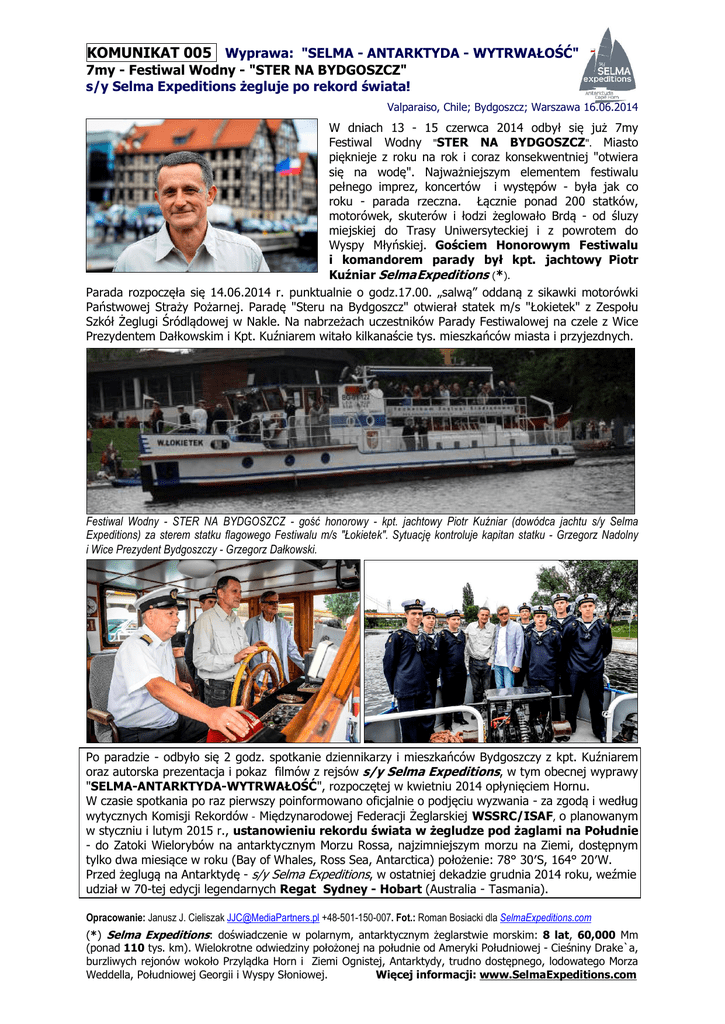 KOMUNIKAT 005 Wyprawa: "SELMA - ANTARKTYDA - WYTRWAŁOŚĆ" 7my - Festiwal Wodny - "STER NA BYDGOSZCZ" s/y Selma Expeditions żegluje po rekord świata! Valparaiso, Chile; Bydgoszcz; Warszawa 16.06.2014 W dniach 13 - 15 czerwca 2014 odbył się już 7my Festiwal Wodny "STER NA BYDGOSZCZ". Miasto pięknieje z roku na rok i coraz konsekwentniej "otwiera się na wodę". Najważniejszym elementem festiwalu pełnego imprez, koncertów i występów - była jak co roku - parada rzeczna. Łącznie ponad 200 statków, motorówek, skuterów i łodzi żeglowało Brdą - od śluzy miejskiej do Trasy Uniwersyteckiej i z powrotem do Wyspy Młyńskiej. Gościem Honorowym Festiwalu i komandorem parady był kpt. jachtowy Piotr Kuźniar Selma Expeditions (*). Parada rozpoczęła się 14.06.2014 r. punktualnie o godz.17.00. „salwą” oddaną z sikawki motorówki Państwowej Straży Pożarnej. Paradę "Steru na Bydgoszcz" otwierał statek m/s "Łokietek" z Zespołu Szkół Żeglugi Śródlądowej w Nakle. Na nabrzeżach uczestników Parady Festiwalowej na czele z Wice Prezydentem Dałkowskim i Kpt. Kuźniarem witało kilkanaście tys. mieszkańców miasta i przyjezdnych. Festiwal Wodny - STER NA BYDGOSZCZ - gość honorowy - kpt. jachtowy Piotr Kuźniar (dowódca jachtu s/y Selma Expeditions) za sterem statku flagowego Festiwalu m/s "Łokietek". Sytuację kontroluje kapitan statku - Grzegorz Nadolny i Wice Prezydent Bydgoszczy - Grzegorz Dałkowski. Po paradzie - odbyło się 2 godz. spotkanie dziennikarzy i mieszkańców Bydgoszczy z kpt. Kuźniarem oraz autorska prezentacja i pokaz filmów z rejsów s/y Selma Expeditions, w tym obecnej wyprawy "SELMA-ANTARKTYDA-WYTRWAŁOŚĆ", rozpoczętej w kwietniu 2014 opłynięciem Hornu. W czasie spotkania po raz pierwszy poinformowano oficjalnie o podjęciu wyzwania - za zgodą i według wytycznych Komisji Rekordów - Międzynarodowej Federacji Żeglarskiej WSSRC/ISAF, o planowanym w styczniu i lutym 2015 r., ustanowieniu rekordu świata w żegludze pod żaglami na Południe - do Zatoki Wielorybów na antarktycznym Morzu Rossa, najzimniejszym morzu na Ziemi, dostępnym tylko dwa miesiące w roku (Bay of Whales, Ross Sea, Antarctica) położenie: 78° 30′S, 164° 20′W. Przed żeglugą na Antarktydę - s/y Selma Expeditions, w ostatniej dekadzie grudnia 2014 roku, weźmie udział w 70-tej edycji legendarnych Regat Sydney - Hobart (Australia - Tasmania). Opracowanie: Janusz J. Cieliszak [email protected] +48-501-150-007. Fot.: Roman Bosiacki dla SelmaExpeditions.com (*) Selma Expeditions: doświadczenie w polarnym, antarktycznym żeglarstwie morskim: 8 lat, 60,000 Mm (ponad 110 tys. km). Wielokrotne odwiedziny położonej na południe od Ameryki Południowej - Cieśniny Drake`a, burzliwych rejonów wokoło Przylądka Horn i Ziemi Ognistej, Antarktydy, trudno dostępnego, lodowatego Morza Weddella, Południowej Georgii i Wyspy Słoniowej. Więcej informacji: www.SelmaExpeditions.com