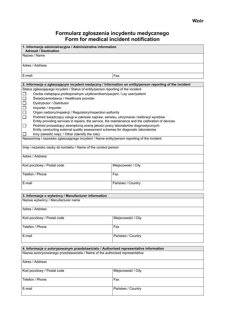 Wzór Formularz zgłoszenia incydentu medycznego Form for medical incident notification 1. Informacje administracyjne / Administrative information Adresat / Destination Nazwa / Name Adres / Address E-mail: Fax: 2. Informacje o zgłaszającym incydent medyczny / Information on entity/person reporting of the incident Status zgłaszającego incydent / Status of entity/person reporting of the incident Osoba niebędąca profesjonalnym użytkownikiem/pacjent / Lay user/patient Świadczeniodawca / Healthcare provider Dystrybutor / Distributor Importer / Importer Organ nadzoru/inspekcji / Regulatory/inspection authority Podmiot świadczący usługi w zakresie napraw, serwisu, utrzymania i kalibracji wyrobów Entity providing services in repairs, the service, the maintenance and the calibration of devices Podmiot prowadzący zewnętrzną ocenę jakości pracy laboratoriów diagnostycznych Entity conducting external quality assessment schemes for diagnostic laboratories Inny (określić rolę): / Other (identify the role): Nazwa/imię i nazwisko zgłaszającego incydent / Name entity/person reporting of the incident Imię i nazwisko osoby do kontaktu / Name of the contact person Adres / Address Kod pocztowy / Postal code Miejscowość / City Telefon / Phone Fax E-mail Państwo / Country 3. Informacje o wytwórcy / Manufacturer information Nazwa wytwórcy / Manufacturer name Adres / Address Kod pocztowy / Postal code Miejscowość / City Telefon / Phone Fax E-mail Państwo / Country 4. Informacje o autoryzowanym przedstawicielu / Authorised representative information Nazwa autoryzowanego przedstawiciela / Name of the authorised representative Adres / Address Kod pocztowy / Postal code Miejscowość / City Telefon / Phone Fax E-mail Państwo / Country 5. Informacje o dostawcy wyrobu / Information on supplier of the device Nazwa dostawcy wyrobu / Name of the supplier of the device Adres / Address Kod pocztowy / Postal code Miejscowość / City Telefon / Phone Fax E-mail Państwo / Country 6. Informacje o wyrobie / Medical device information Nazwa handlowa/nazwa firmowa/marka / Commercial name/brand name/make Model lub numer katalogowy / Model or catalogue number Numer(-y) seryjny(-e) i/lub numer(-y) serii/partii / Serial number(s) and/or lot/batch number(s) Numer wersji oprogramowania (jeżeli dotyczy) / Software version number (if applicable) Data produkcji / Manufacturing date Data ważności (jeżeli dotyczy) / Expiry date (if applicable) Okres, przez który implant pozostawał wszczepiony (jeżeli nie są znane dokładne daty implantacji lub jego usunięcia) Duration of implantation (to be filled if the exact implant or explant dates are unknown) Wyposażenie/towarzyszące wyroby (jeżeli dotyczy) / Accessories/associated devices (if applicable) Nr identyfikacyjny jednostki notyfikowanej / Notified Body ID number 7. Informacje o incydencie medycznym / Medical incident information Numer referencyjny zgłoszenia nadany przez świadczeniodawcę, jeżeli dotyczy User facility report reference number, if applicable Data przesłania zgłoszenia incydentu do wytwórcy/autoryzowanego przedstawiciela/dostawcy (podkreślić odpowiednie) Date of sending incident notification for the manufacturer/ authorised representative/supplier (underline appropriate) Data wystąpienia incydentu / Date of incident occurred Miejsce wystąpienia incydentu / Place of incident occurred Opis incydentu / Incident description narrative Liczba pacjentów, których dotknął incydent Number of patients involved Obecne miejsce znajdowania się/przekazania wyrobu Medical device current location/disposition Liczba wyrobów, których dotyczył incydent Number of medical devices involved Osoba posługująca się wyrobem w chwili incydentu (wybrać jedno) Operator of the medical device at the time of incident (select one) profesjonalny użytkownik / health care professional pacjent / patient inna / other Użycie wyrobu (wybrać z listy poniżej) / Usage of the medical device (select from list below) pierwsze użycie / initial use ponowne użycie wyrobu do jednorazowego użytku / reuse of a single use medical device ponowne użycie wyrobu do wielokrotnego użytku / reuse of a reusable medical device po regeneracji/odnowieniu / re-serviced/refurbished problem zauważony przed użyciem / problem noted prior use inne (określić, jakie) / other (please specify): Skutki dla pacjenta / Patient outcome Działania zaradcze związane z opieką nad pacjentem podjęte przez świadczeniodawcę Remedial action taken by the healthcare facility relevant to the care of the patient Wiek pacjenta w czasie incydentu, jeżeli dotyczy / Age of the patient at the time of incident, if applicable Płeć, jeżeli dotyczy / Gender, if applicable Kobieta / Female Mężczyzna / Male Masa ciała w kilogramach, jeżeli dotyczy / Weight in kilograms, if applicable 8. Uwagi / Comments Potwierdzam, że powyższe informacje są poprawne według mojej najlepszej wiedzy. I affirm that the information given above is correct to the best of my knowledge. ……………………………………………………… Podpis / Signature Imię i nazwisko / Name Miejscowość / City Data / Date