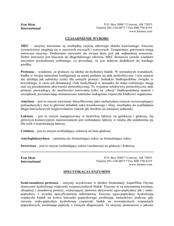 FOR MOR International P.O. Box 2080 * Conway, AR 72033 Telefon 501-336-0077 * Fax 800-750-8155 www.formor.com UZASADNIENIE WYROBU MEC – enzymy trawienne są niezbędną częścią zdrowego układu trawiennego. Enzymy żywnościowe znajdują się w surowych owocach i warzywach. Temperatury gotowania mogą zniszczyć enzymy. Dodawanie enzymów do swojej diety jest jak najbardziej sensowne. Dobre trawienie jest kluczem do długofalowego zdrowia. MEC dostarcza szeroki wachlarz enzymów pochodzenia roślinnego, co powoduje, że jest dobrym dodatkiem do każdego posiłku. Proteaza - wiadomo, że proteazy są zdolne do hydrolizy białek. W normalnych warunkach, białka w swojej naturalnej konfiguracji są mniej podatne na atak proteolityczny i tym samym nie działają jak substraty (cele) dla ustnych proteaz. Jednakże białkopodobne związki w krwiobiegu, w razie ich denaturacji i/lub modyfikacji w stosunku do stanu rodzimego, mogą stać się przedmiotem aktywności proteolitycznej. To wyjaśnia selektywny proteolityczny atak proteaz, prowadzący do możliwości żerowania tylko na „obcej” białkopodobnej materii i szczątkach, pozostawiając nienaruszone naturalne endogenne cząsteczki białkowe organizmu. Amylaza – jest to enzym trawienny klasyfikowany jako sacharydaza (enzym rozszczepiający polisacharydy). Jest to głownie składnik soku trzustkowego i śliny, niezbędny do rozkładania długo-łańcuchowych węglowodanów (takich jak skrobia) na mniejsze jednostki. Laktaza – jest to enzym zaangażowany w hydrolizę laktozy na galaktozę i glukozę. Jej głównym komercyjnym zastosowaniem jest rozkładanie laktozy w mleku dla uzdatnienia jej dla osób z nietolerancją laktozy. Celulaza – jest to enzym rozkładający celulozę na beta-glukozę. Amyloglukozydaza – zamienia nie fermentujące cukry na fermentujące cukry. Inwertaza – jest to enzym rozkładający cukier (sacharozę) na glukozę i fruktozę. FOR MOR International P.O. Box 2080 * Conway, AR 72033 Telefon 501-336-0077 * Fax 800-750-8155 www.formor.com SPECYFIKACJA ENZYMÓW Semi-zasadowa proteaza – enzymy uzyskiwane w drodze fermentacji Asperfillus Oryzae skutecznie hydrolizują większość rozpuszczalnych białek. Enzymy te są mieszaniną kwaśnej, obojętnej i zasadowej protezy, wykazującej zarówno aktywność egzo-peptydazy jak i endopeptydazy z wysoką specyficznością substratową. Enzymy egzo-peptydazy hydrolizują cząsteczki białek na końcu łańcucha peptydowego uwalniając aminokwas, podczas gdy enzymy endo-peptydazy hydrolizują cząsteczki białek na wewnętrznych wiązaniach peptydowych, uwalniając peptydy o różnych długościach. Te enzymy proteazowe o jakości żywnościowej hydrolizują białka kazeiny, hemoglobiny, żelatyny, soi, ryb i inne białka roślinne i zwierzęce na peptydy o mniejszych ciężarach cząsteczkowych. Alfa-amylaza – jest uzyskiwana z wybranych odmian Aspergillus Ozyrae w drodze fermentacji otrąb pszennych. Ma zdolność hydrolizy skrobi przez rozbijanie wiązań glikozydowych alfa-1,4 amylazy lub amylopektyn w skrobi. Amylaza jest szeroko stosowana w przemyśle farmaceutycznym w rozmaitych preparatach ułatwiających trawienie. Skrobia w spożytym pożywieniu jest lepiej trawiona z pomocą amylazy, tym samym zwiększając ogólną strawność pożywienia. Jedna jednostka alfa-amylazy jest definiowana jako ilość alfaamylazy, która zamieni w dekstrynę rozpuszczalną skrobię w obecności nadwyżki betaamylazy w tempie 1g/h w temperaturze 30 stopni. Kwaso-stabilna laktaza – jest enzymem klasy żywnościowej produkowanym w drodze kontrolowanej fermentacji Aspergillus Oryzae i charakteryzuje się zdolnością do hydrolizy wiązań beta-D-galaktozydowych uwalniając jeden mol D-glukozy i jeden mol D-galaktozy. Jedna Jednostka laktazy FCC (LacU) jest definiowana jako ilość enzymu, która uwolni jeden mikromol o-nitrofenolu na minutę przy 37 stopniach C oraz pH 4,5. Oparta jest na 15 minutowej hydrolizie substratu o-nitrofenol-beta-D-galaktopiranozydowego. Inwertaza – jest to enzym lipolityczny wytwarzany w drodze kontrolowanej fermentacji Aspergillus Niger. Inwertaza katalizuje hydrolizę glicerydów prostych estrów kwasów tłuszczowych, dając monoglicerydy i dwuglicerydy, glicerol i wolne kwasy tłuszczowe. Posiada szeroką specyficzność substratową na tłuszcze i oleje pochodzenia roślinnego i zwierzęcego. Jedna Jednostka Lipazy (LU) jest definiowana jako ilość enzymu, która uwolni równowartość mikromola kwasu (H+) na minutę z substratu, w warunkach oznaczania. Oznaczanie jest oparte na pięciominutowej hydrolizie substratu z oliwy z oliwek przy pH 6,5 i 30 stopniach C. Kwasy tłuszczowe uwalniane w hydrolizie estrów glicerolowych są ustalane miareczkowaniem wodorotlenkiem sodu. Celulaza – jest kompleksem enzymów składającym się z enzymów wymaganych do hydrolizy celulozy, pewnych materiałów hemicelulozowych (w tym gum), oraz włókien na glukozę. Celulaza jest kompleksem enzymów produkowanym poprzez kontrolowaną fermentację Trichoderma. Jest zasadniczo wolna od protezy, lipazy i amylazy. Jest kompleks enzymatyczny GRAS, zgodny ze specyfikacjami zalecanymi przez FAO/WHO i FCC III dla enzymów klasy żywnościowej. Kwaso-stabilna proteza – to enzym uzyskiwany w drodze fermentacji Aspergillus Niger który skutecznie hydrolizuje większość rozpuszczalnych białek. Ten proteazowy enzym hydrolizuje kazeinę, hemoglobinę, żelatynę, białko soi, ryb i inne białka roślinne i zwierzęce na peptydy o mniejszym ciężarze cząsteczkowym. Aktywność enzymu proteazowego jest mierzona na podstawie hydrolizy białka mleka (kazeiny). Jedna jednostka SAP aktywności proteazy jest definiowana jako ilość enzymu uwalniająca 1 mikromol tyrozyny na minutę w określonych warunkach. Glukoamylaza – jest to oczyszczony preparat enzymatyczny produkowany w drodze unikalnego procesu fermentacji z wybranych odmian Rhizopus i zgodny z zaleca