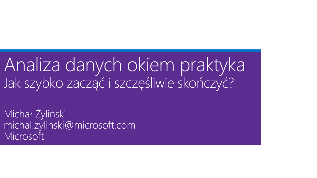 O mnie Cele sesji Cele sesji Dlaczego? http://www.zdnet.com/article/microsofts-r-strategy/ Źródło: https://azure.microsoft.com/enus/blog/forrester-names-microsoft-azurea-leader-in-big-data-hadoop-cloudsolutions/ http://www.photos-public-domain.com/2011/09/11/simple/ Przypadek #1: big data… lub nie Przypadek #1: Rezultaty Przypadek #2: PaaS kontra IaaS Przypadek #2: Rezultaty Przypadek #3: Spróbuj zamiast narzekać Dane źródłowe (xlsx) Machine Translation API Sentiment Analysis API Key phrase detection API Cortana Intelligence Suite Data Sources Apps Information Management Big Data Stores Machine Learning and Analytics Intelligence People Data Factory Data Lake Store Machine Learning Cognitive Services Data Catalog SQL Data Warehouse Data Lake Analytics Bot Framework Web HDInsight (Hadoop and Spark) Cortana Mobile Event Hubs Apps Bots Stream Analytics Dashboards & Visualizations Sensors and devices Data Power BI Intelligence Automated Systems Action https://commons.wikimedia.org/wiki/File:Bedtime_story_-_Madeline.JPG http://business901.com/blog1/the-misnomer-of-thinking-out-of-the-box/ Przypadek #4: Swoboda działań Analiza ruchu godzinowego Przypadek #4: Rezultaty https://commons.wikimedia.org/wiki/File:A_screwdriver_tip.jpg Przypadek #5: Think big Architektura pilotażowa HDInsight cluster Custom UDFs (Streaming and/or Java) Azure VM SQL DB Revolution R VM Hive RStudio JDBC/Sqoop Log Ops Table HCatalog rxODBC MRS HDFS Scalable ETL Large-scale data analysis Wykrywanie anomalii za pomocą segmentacji „Skrajni” użytkownicy SYSTEM_IDENTITY1 SYSTEM_IDENTITY2 ANON1 ANON2 ANON3 Rozmiar klastra Cluster #1 126 204 Cluster #2 15 040 Położenie klastra Cluster # avgopsperday avgsessionperday Acgopspersession Ipcnt 1 7.97499 2.380711 3.560209 1.227963 2 36.81413 6.414342 7.823085 1.640691 3 segmenty użytkowników [po usunięciu anomalii, bez normalizacji] 3 segmenty użytkowników [po usunięciu anomalii, z normalizacją] Rozmiar klastra Cluster #1 72820 Cluster #2 19956 Cluster #3 33487 Położenie klastra Avgopsperday Avgsessionperday Avgopspersession Ipcnt Segmenty Cluster #1 0.1302338 0.01241954 0.1521433 0.04084386 Light users Cluster #2 0.6132861 0.04294849 0.3558698 0.17688916 Active+mobile users Cluster #3 0.3472406 0.01084593 0.5794566 0.02338967 Active+static users Klasyfikacja użytkowników Rezultaty (w oparciu o drzewa decyzyjne): 1 1 .52 .13 .35 100% avgopsperday < 7.1 Confusion Matrix no Reference 2 3 1 .98 .00 .02 53% 3 .00 .28 .72 47% avgopspersession < 6.9 avgopsperday >= 16 4 7 1 1.00 .00 .00 52% 3 .00 .01 .99 34% avgopspersession < 4.6 Prediction yes 14 1 .97 .00 .03 3% 3 .00 .30 .70 0% ipcnt < 1.5 avgsessionperday >= 4.2 2 3 1 19 684 0 128 2 3 4 933 25 3 1 24 13 080 Accuracy: 0.9952 avgopsperday >= 15 9 1 8 18 19 5 6 28 29 15 1 1.00 .00 .00 49% 1 1.00 .00 .00 3% 3 .49 .00 .51 0% 3 .11 .00 .89 1% 2 .00 1.00 .00 13% 2 .00 .98 .02 0% 3 .00 .00 1.00 0% 3 .00 .00 1.00 33% … z wykorzystaniem Azure ML Przypadek #5: Rezultaty http://www.freeimageslive.co.uk/files/images006/undo_key.jpg Przypadek #6: Plaża ? Najczęstsza przyczyna porażek http://pauldunay.com/your-testing-program-smart-ways-to-get-your-team-on-board/ Przypadek #7: Arbuz IBS Użytkownik Usługi Customer Support Manager Sprzedaż CIO Dbanie o satysfakcję klienta już wkrótce Centralizacja danych Wspólny zbiór danych pozwoli zunifikować sposób patrzenia na klientów Modele analityczne Krótszy czas potrzebny na zmianę Synchronizacja z biznesem Nawiązanie dialogu pomiędzy różnymi interesariuszami Satysfakcja klienta w przyszłości Bogatszy arsenał narzędzi do zbierania danych Opinie zbierane i analizowane na bieżąco Jednolity wizerunek firmy Machine Learning University Ciągłe doszkalanie OneML • Cykliczne, praktyczne wyzwania dla chętnych • Scenariusze mocno osadzone w rzeczywistości • Interdyscyplinarne zespoły 7 zasad zwiększających prawdopodobieństwo sukcesu Co dalej? Advanced Analytics Labs (2 dni) R Labs (1-2 dni) (Bezpłatne) zaangażowanie w indywidualne projekty Pytania?