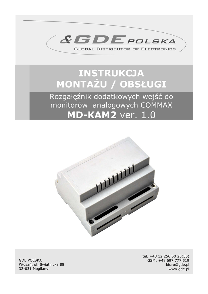 INSTRUKCJA MONTAŻU / OBSŁUGI Rozgałęźnik dodatkowych wejść do monitorów analogowych COMMAX MD-KAM2 ver. 1.0 GDE POLSKA Włosań, ul. Świątnicka 88 32-031 Mogilany tel. +48 12 256 50 25(35) GSM: +48 697 777 519 [email protected] www.gde.pl MD-KAM2 UWAGA! Niniejsza instrukcja powinna być przeczytana przed montażem. Moduł rozgałęźnika MD-KAM2 (2 wejścia/1 wyjście). Wygląd płytki i obudowy może odbiegać od zdjęcia poglądowego produktu (zależy od wersji). Przeznaczenie Moduł przekaźnikowy MD-KAM2 przeznaczony jest do stosowania w instalacjach niskonapięciowych. Moduły umożliwiają zwiększenie ilości obsługiwanych wejść przez monitory, bez dodatkowych przewodów (poza lokalnym zasilaniem modułów 12VDC). Współpracuje z wszystkimi modelami monitorów analogowych COMMAX oraz z wejściem analogowym monitorów systemu cyfrowego Gate View COMMAX, moduł działa prawidłowo z kamerami wideo domofonowymi COMMAX (4 żyłowe) jak i z kamerami CCTV służącymi tylko do podglądu (2 żyły). Współpracuje z systemem analogowym COMMAX co ogranicza jego możliwości na dużych odległościach. W typowych instalacjach odległości kamera-moduł-monitor nie powinny przekraczać 100m dla przewodów prostych 0,5mm (do przesyłania wideo zalecane okablowanie ekranowane). Dostarczany w obudowie na szynę DIN 32 (opcja puszka zewnętrzna IP54), zalecany montaż wewnątrz pomieszczeń. Opis działania Aktualny stan modułu jest sygnalizowany przez stan dwóch diod LED (czerwona i zielona). -moduł zasilony i świeci dioda czerwona, oznacza to gotowość do wyświetlenia obrazu z wejścia 1 (czyli wywołanie podglądu z monitora wyświetli obraz z wejścia 1). Po zakończeniu podglądu/rozmowy moduł przełączy się na wejście 2. -moduł zasilony i świeci dioda zielona, oznacza to gotowość do wyświetlenia obrazu z wejścia 2 (czyli wywołanie podglądu z monitora wyświetli obraz z wejścia 2). Po zakończeniu podglądu/rozmowy moduł przełączy się na wejście 1. W trybie czuwania dioda, która świeci kolorem czerwonym oznacza ostatnio aktywne wejście, to wejście będzie też dostępne do podglądu od strony monitora. Ilość modułów można zwiększyć stosując odpowiednie połączenie (jak na schematach poniżej). Zasilanie modułu a) Zalecane zasilanie z zasilacza RF-1A (jeden zasilacz może zasilać kilka modułów). Napięcie na zaciskach modułu nie może być poniżej 11,8VDC. b) Moduły są przewidziane do pracy w systemie analogowym COMMAX, którego orientacyjne odległości nie powinny przekraczać 100m dla 4x0,5mm i 150m dla 4x0,8mm (więcej w instrukcjach obsługi kamer i monitorów) Uwagi - problemy z działaniem: Do prawidłowej pracy moduł potrzebuje napięcia zasilania 12VDC (diody w module nie sygnalizują obecności napięcia zasilania tylko stan aktualny wejść). Brak świecenia jakiejkolwiek diody nie musi być oznaką usterki, po upewnieniu się, że napięcie zasilające moduł jest prawidłowe wystarczy wywołać podgląd lub nacisnąć przycisk na panelu wejściowym (co powoduje uaktywnienie losowej kamery i rozpoczęcie pracy). Podłączenie W zależności od potrzeb klienta i wymogów dalszej rozbudowy przykłady połączeń wraz z opisami jak będzie działać przycisk podglądu poniżej: -2- MD-KAM2 Rys 2. Opis wyprowadzeń sygnalizacja wejścia 1 sygnalizacja wejścia 2 Video Masa wyjście +12V MD-KAM2 Masa Audio +12V Video Masa wejście 2 Audio Video +12V Masa Audio wejście 1 +12V Rys 2. Przykład podłączenia sygnal izacja wejścia 2 2 MD-KAM2 zasilacz RF-1A wejście 1 4 CDV-xxx wejście 2 4 K1 wyjście sygnal izacja wejścia 1 4 K2 DRC-4xx DRC-4xx Podgląd od strony monitora, kolejne naciśnięcie przycisku podglądu VIDE O K1 bra k vid eo wyłączony VIDE O K2 brak vid eo wyłączony Podgląd od strony monitora, kolejne naciśnięcie przycisku podglądu (wyłączone gniazdo kamery 2 w monitorze, opcja w wybranych monitorach, patrz instrukcje monitorów) VIDE O K1 wyłączony VIDE O K2 wyłączony -3- MD-KAM2 Rys 3. Przykład podłączenia sygna liza cja wej ścia 1 sygna liza cja wej ścia 2 wyjści e 2 MD-KAM2 w ejści e 1 K1 2 4 CDV-xxx w ejści e 2 K2 2 WBL -11S (lu b inn a CC TV PAL) 2 2 zasil acz RF-1A Podgląd od str ony monitora, kolejne naciśnięcie przycisku podglądu VID EO K 1 b rak vi de o w yłą czon y VID EO K 2 b rak vi de o w yłą czon y Podgląd od strony monitora, kolejne naciśnięcie przycisku podglądu (wyłączone gniazdo kamery 2 w monitorze, opcja w wybranych monitorach, patrz instr ukcje monitorów) VID EO K 1 w yłą czon y VID EO K 2 wył ączo ny -4- MD-KAM2 Rys 4 Przykład podłączenia sygna lizacja wej ścia 2 2 MD-KAM2 zasilacz RF-1A w ejście 1 wyjści e sygna liza cja wej ścia 1 w ejści e 2 4 CDV-xxx 4 2 K2 WBL -11S (lu b inn a CC TV PAL) 2 K3 2 K1 2 DRC -4xx zasilacz RF-1A Podgląd od strony monitora, kolejne naciśnięcie przycisku podglądu VID EO K 1 VID EO K 2 w yłą czon y VID EO K 1 -5- VID EO K 3 w yłą czon y MD-KAM2 Rys 5 Przykład podłączenia sygna liza cj a wej ścia 1 K4 sygna liza cj a wej ścia 2 4 wej ście 2 MD-KAM2 wej ście 1 2 2 DR C-4xx 2 zasi lacz RF-1A K2 sygna liza cj a wej ścia 1 sygna liza cj a wej ścia 2 wyłączony wyłączony VIDEO K1 VIDEO K1 VIDEO K3 wej ście 2 MD-KAM2 wej ście 1 4 DR C-4xx VIDEO K2 VIDEO K2 4 CDV-xxx K1 4 DRC-4xx VIDEO K4 -6- zasi lacz RF-1A K3 WBL-11S (l ub inn a CCTV PAL) zasi lacz RF-1A VIDEO K1 VIDEO K1 wyj ści e wyłączony Podgląd od strony monitora, kolejne naciśnięcie przycisku podglądu wyj ści e -7- 2 2 wej ście 1 K2 DR C-4xx 4 wej ście 2 MD-KAM2 sygna liza cj a wej ścia 2 wyj ści e K1 zasi lacz RF-1A wej ście 1 wyłączony brak video VIDEO K2 wyłączony VIDEO K3 VI DEO K1 wyłączony VIDEO K3 wyłączony VIDEO K1 wyj ści e wyłączony wyłączony wejście 2 2.Podgląd od strony monitora, kolejne naciśnięcie przycisku podglądu (Gdy jest wyłączone gniazdo kamery 2 w monitorze, opcja w wybranych monitorach)