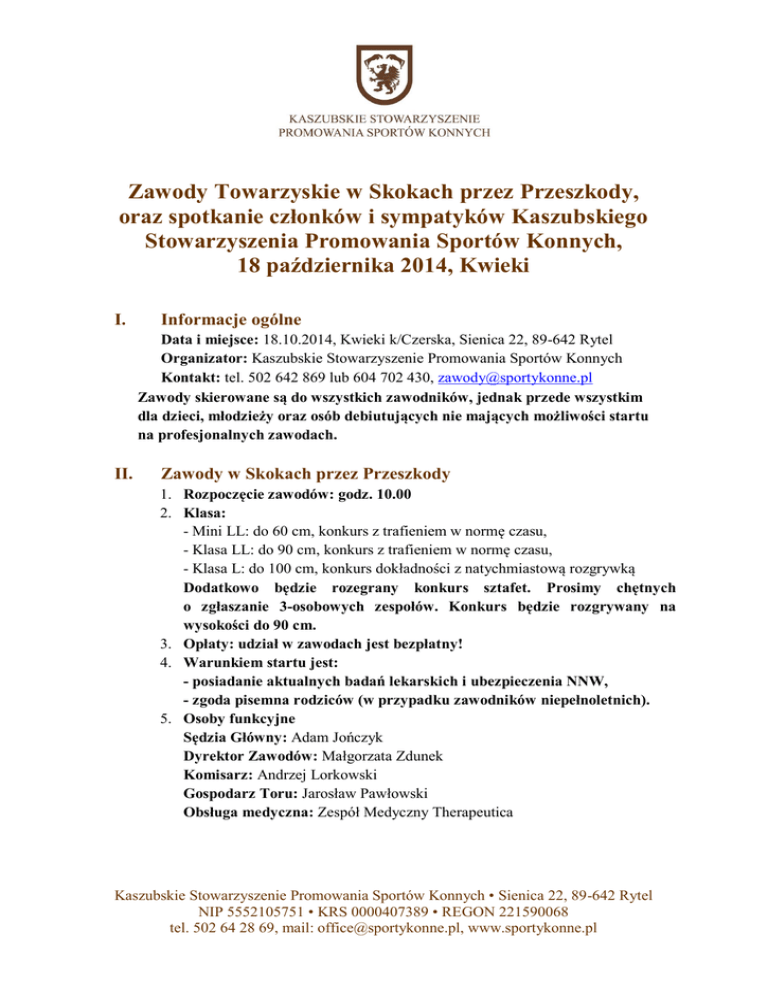Zawody Towarzyskie w Skokach przez Przeszkody, oraz spotkanie członków i sympatyków Kaszubskiego Stowarzyszenia Promowania Sportów Konnych, 18 października 2014, Kwieki I. Informacje ogólne Data i miejsce: 18.10.2014, Kwieki k/Czerska, Sienica 22, 89-642 Rytel Organizator: Kaszubskie Stowarzyszenie Promowania Sportów Konnych Kontakt: tel. 502 642 869 lub 604 702 430, [email protected] Zawody skierowane są do wszystkich zawodników, jednak przede wszystkim dla dzieci, młodzieży oraz osób debiutujących nie mających możliwości startu na profesjonalnych zawodach. II. Zawody w Skokach przez Przeszkody 1. Rozpoczęcie zawodów: godz. 10.00 2. Klasa: - Mini LL: do 60 cm, konkurs z trafieniem w normę czasu, - Klasa LL: do 90 cm, konkurs z trafieniem w normę czasu, - Klasa L: do 100 cm, konkurs dokładności z natychmiastową rozgrywką Dodatkowo będzie rozegrany konkurs sztafet. Prosimy chętnych o zgłaszanie 3-osobowych zespołów. Konkurs będzie rozgrywany na wysokości do 90 cm. 3. Opłaty: udział w zawodach jest bezpłatny! 4. Warunkiem startu jest: - posiadanie aktualnych badań lekarskich i ubezpieczenia NNW, - zgoda pisemna rodziców (w przypadku zawodników niepełnoletnich). 5. Osoby funkcyjne Sędzia Główny: Adam Jończyk Dyrektor Zawodów: Małgorzata Zdunek Komisarz: Andrzej Lorkowski Gospodarz Toru: Jarosław Pawłowski Obsługa medyczna: Zespół Medyczny Therapeutica Kaszubskie Stowarzyszenie Promowania Sportów Konnych • Sienica 22, 89-642 Rytel NIP 5552105751 • KRS 0000407389 • REGON 221590068 tel. 502 64 28 69, mail: [email protected], www.sportykonne.pl 6. Nagrody: Flo dla 10 pierwszych par w każdym konkursie. Za każde 1 miejsce w poszczególnych klasach oraz dla zwycięskiej sztafety udział (wpisowe) w jednych zawodach (2dni) w dyscyplinie Skoki przez Przeszkody będzie bezpłatny (po spełnieniu wymogów startu w dyscyplinie). Nagrody w postaci startów na zawodach przysługują zawodnikom–amatorom. Definicja amatora: osoba posiadająca maksymalnie licencję wstępną w dyscyplinach A, B, C. III. Sprawy organizacyjne i atrakcje 1. Zgłoszenia prosimy kierować na adres: [email protected] do dnia 15 października 2014 r. 2. Prosimy o zaznaczenie rezerwacji boksu. Boksy dostępne od godz. 8:00 dnia 18.10.14, ilość miejsc ograniczona. 3. Po konkursach, około godz. 14.00, przewidziany jest poczęstunek – pieczony dzik i inne – i spotkanie przy ognisku. 4. Serdecznie zapraszamy do skorzystania z bezpłatnych przejażdżek konno i bryczką. Zgłoszenia prosimy kierować do stanowiska sędziowskiego. 5. Osoby zainteresowane otrzymaniem bezpłatnie swoich zdjęć z zawodów (jeden zawodnik – jedno zdjęcie) proszone są o zgłoszenie się PRZED ZAWODAMI do redakcji portalu sportykonne.pl (na terenie zawodów prosimy szukać pani z aparatem i identyfikatorem: „REDAKCJA”). IV. Inne 1. Organizator nie ponosi żadnej odpowiedzialności w razie wypadków, zachorowań zawodników, członków ekip i koni, jak również w przypadku kradzieży, zniszczeń, pożarów i innych zdarzeń. 2. Organizator informuje, że prowadzi dokumentację fotograficzną i filmową z zawodów i może jej użyć w publikacjach prasowych i promocyjnych. Zawodnicy, którzy nie wyrażają zgody na użycie wizerunku proszeni są o złożenie oświadczenia na piśmie w biurze zawodów. 3. Organizator posiada ubezpieczenie OC oraz NNW. Kaszubskie Stowarzyszenie Promowania Sportów Konnych • Sienica 22, 89-642 Rytel NIP 5552105751 • KRS 0000407389 • REGON 221590068 tel. 502 64 28 69, mail: [email protected], www.sportykonne.pl I. II. III. IV. V. VI. Kodeks Postępowania z Koniem Polski Związek Jeździecki w ślad za Międzynarodową Federacją Jeździecką FEI oczekuje, że wszystkie osoby zaangażowane w jakikolwiek sposób w sporty konne, będą przestrzegać zasad niniejszego Kodeksu Postępowania z Koniem oraz przyjmą do wiadomości, że w każdym przypadku dobro konia musi być sprawą nadrzędną i nigdy nie może być podporządkowane współzawodnictwu sportowemu ani celom komercyjnym. Na wszystkich etapach treningu i przygotowań konia do startu w zawodach, dobro konia musi stać ponad wszelkimi innymi wymaganiami. Dotyczy to stałej opieki, metod treningu, starannego obrządku, kucia i transportu. Konie i jeźdźcy muszą być wytrenowani, kompetentni i zdrowi zanim wezmą udział w zawodach. Odnosi się to także do podawania leków i środków medycznych, zabiegów chirurgicznych zagrażających dobru konia lub ciąży klaczy, oraz do przypadków nadużywania pomocy medycznej. Zawody nie mogą zagrażać dobru konia. Wymaga to zwrócenia szczególnej uwagi na teren zawodów, powierzchnię podłoża, pogodę, warunki stajenne, kondycję koni i ich bezpieczeństwo także podczas podróży powrotnej z zawodów. Należy dołożyć wszelkich starań, aby zapewnić koniom staranną opiekę po zakończeniu zawodów, a także humanitarne traktowanie po zakończeniu kariery sportowej. Dotyczy to właściwej opieki weterynaryjnej obrażeń odniesionych na zawodach, spokojnej starości, ewentualnie eutanazji. PZJ zachęca wszystkie osoby działające w sporcie jeździeckim do stałego podnoszenia swojej wiedzy oraz umiejętności dotyczących wszelkich aspektów współpracy z koniem. Każdego startującego konia obowiązują aktualne szczepienia przeciwko grypie. Wyniki każdego dnia, listy startowe, fotorelacje i darmowe zdjęcia do pobrania na stronie organizatora: www. sportykonne.pl Kaszubskie Stowarzyszenie Promowania Sportów Konnych • Sienica 22, 89-642 Rytel NIP 5552105751 • KRS 0000407389 • REGON 221590068 tel. 502 64 28 69, mail: [email protected], www.sportykonne.pl