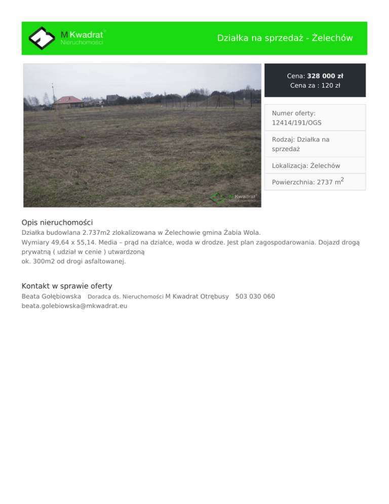 Działka na sprzedaż - Żelechów Cena: 328 000 zł Cena za : 120 zł Numer oferty: 12414/191/OGS Rodzaj: Działka na sprzedaż Lokalizacja: Żelechów Powierzchnia: 2737 m2 Opis nieruchomości Działka budowlana 2.737m2 zlokalizowana w Żelechowie gmina Żabia Wola. Wymiary 49,64 x 55,14. Media – prąd na działce, woda w drodze. Jest plan zagospodarowania. Dojazd drogą prywatną ( udział w cenie ) utwardzoną ok. 300m2 od drogi asfaltowanej. Kontakt w sprawie oferty Beata Gołębiowska Doradca ds. Nieruchomości M Kwadrat Otrębusy [email protected] 503 030 060